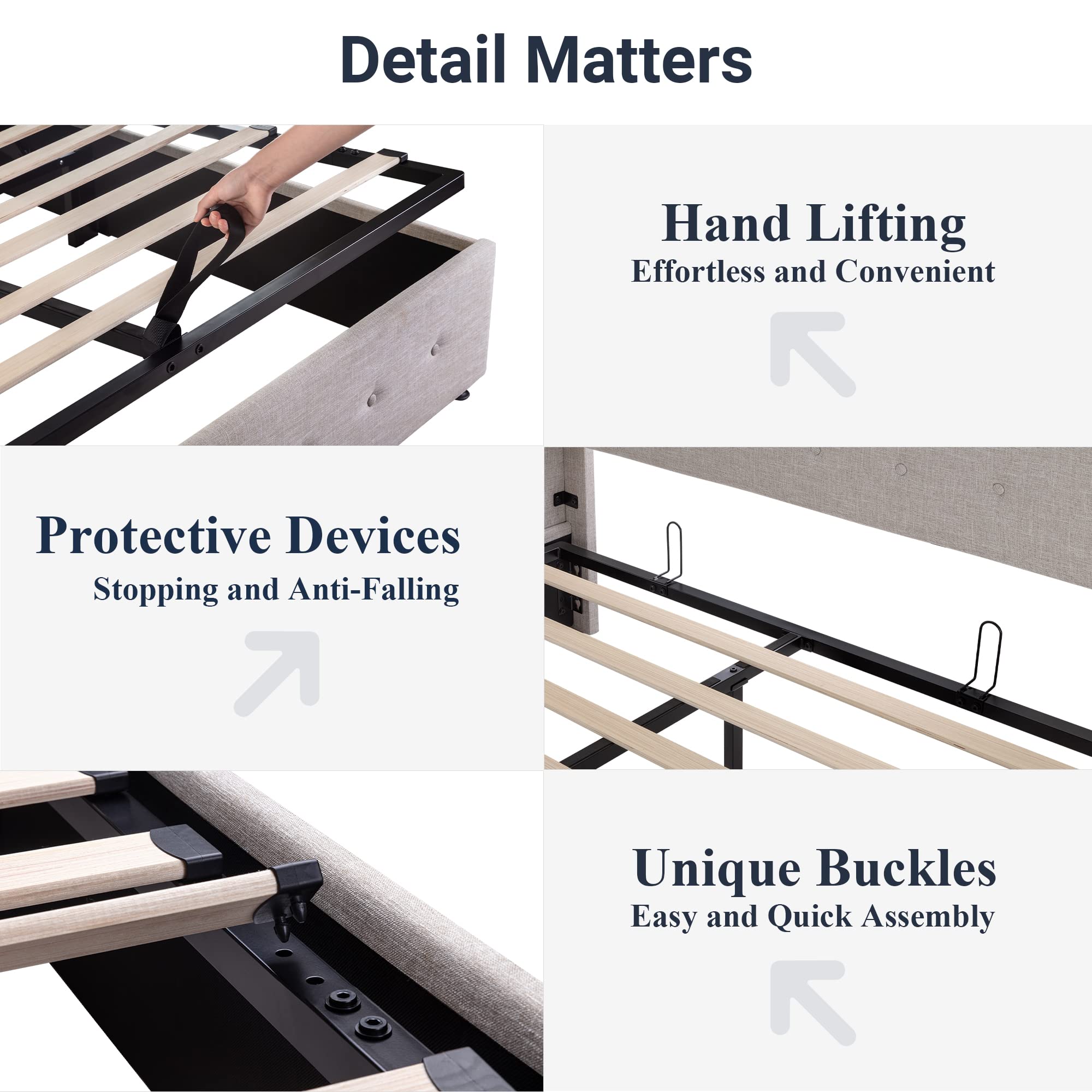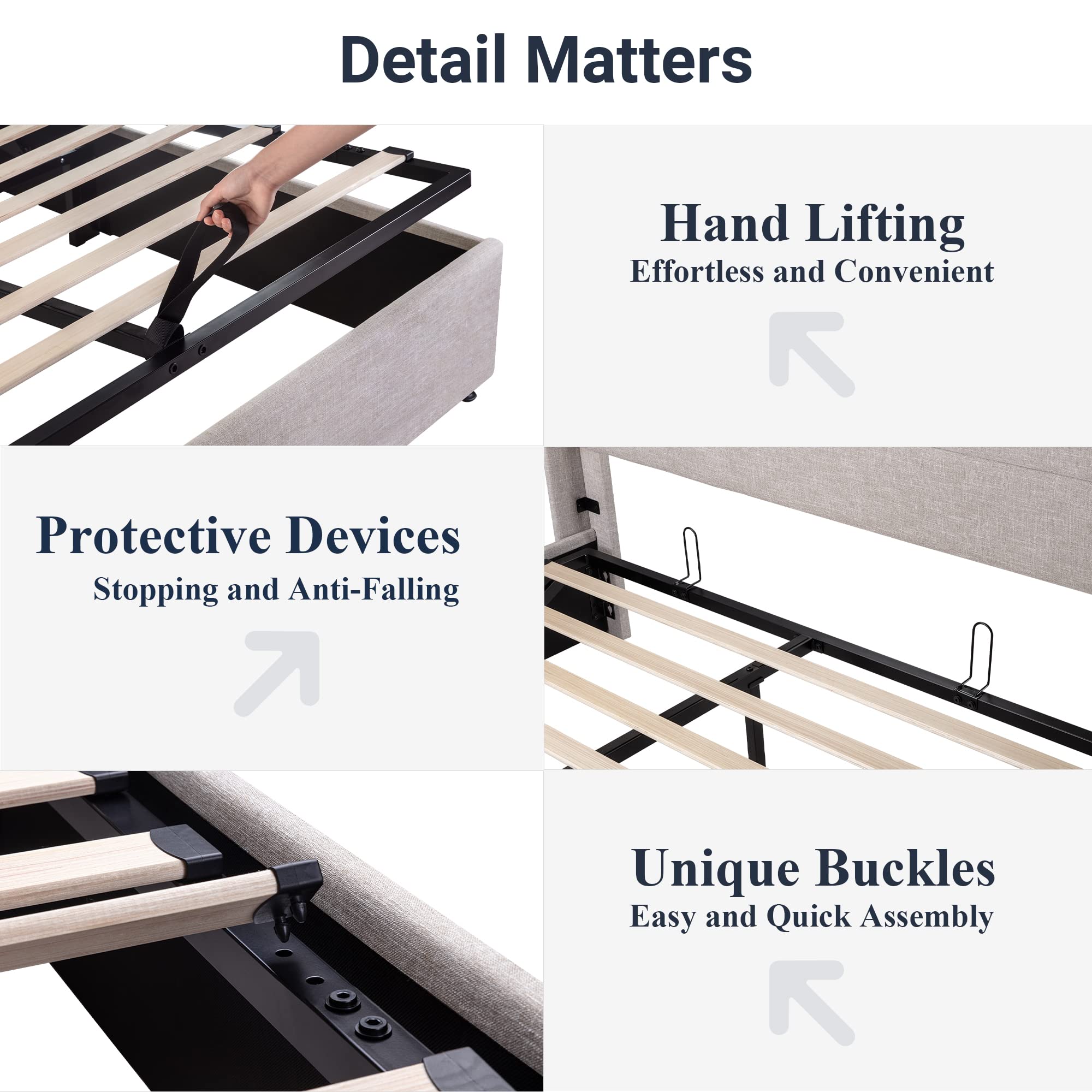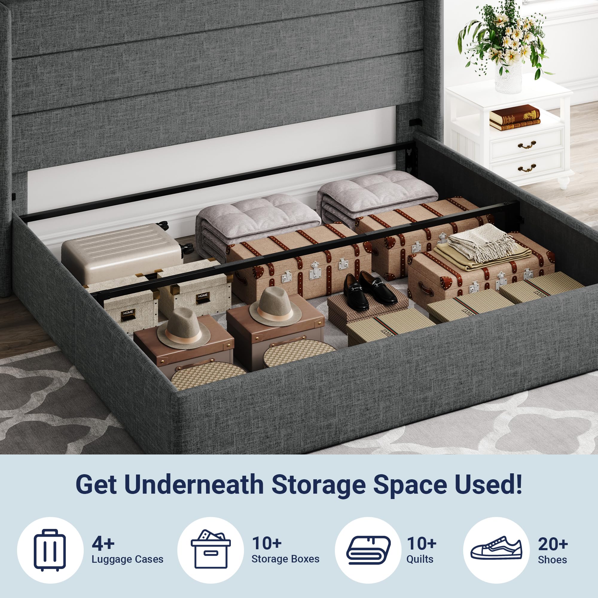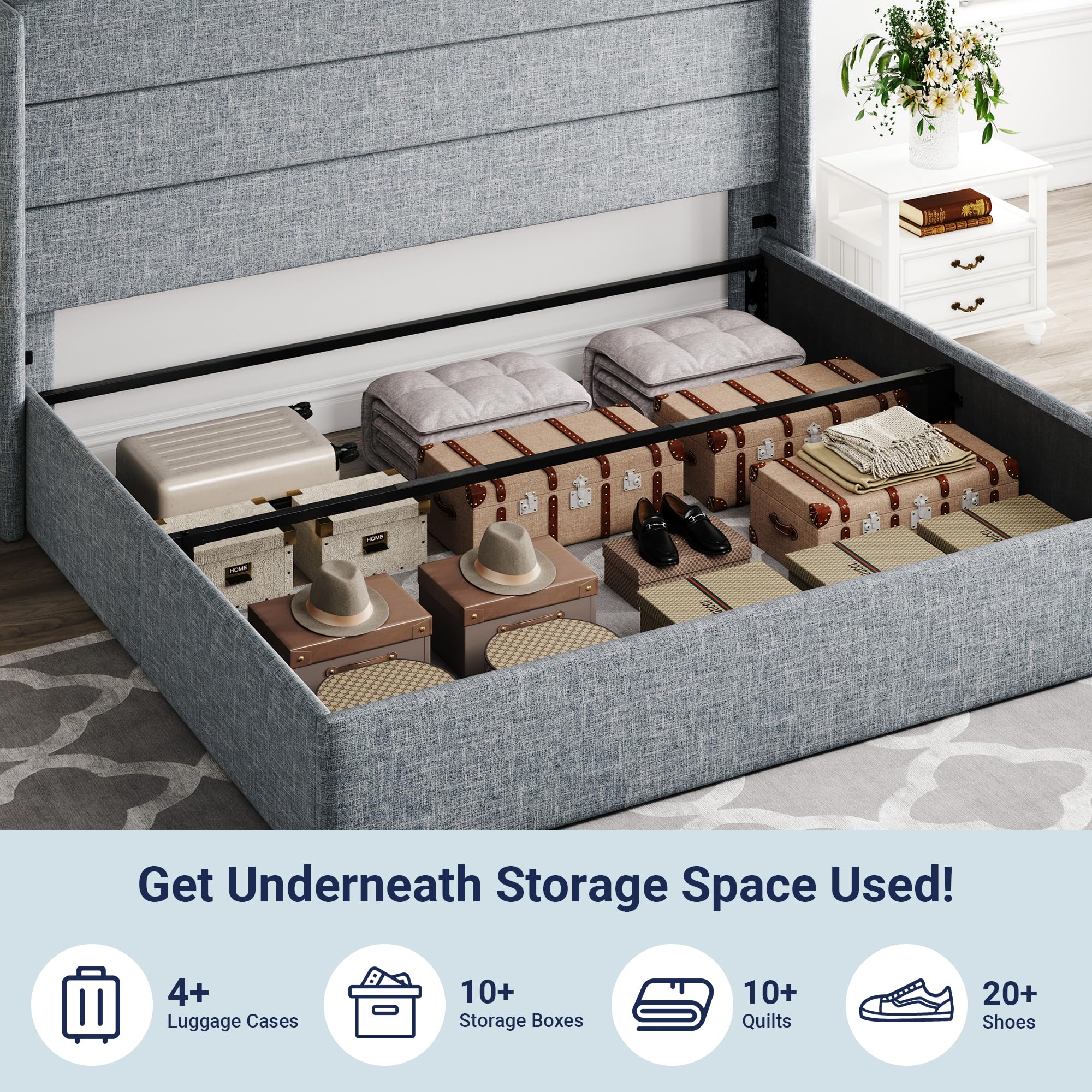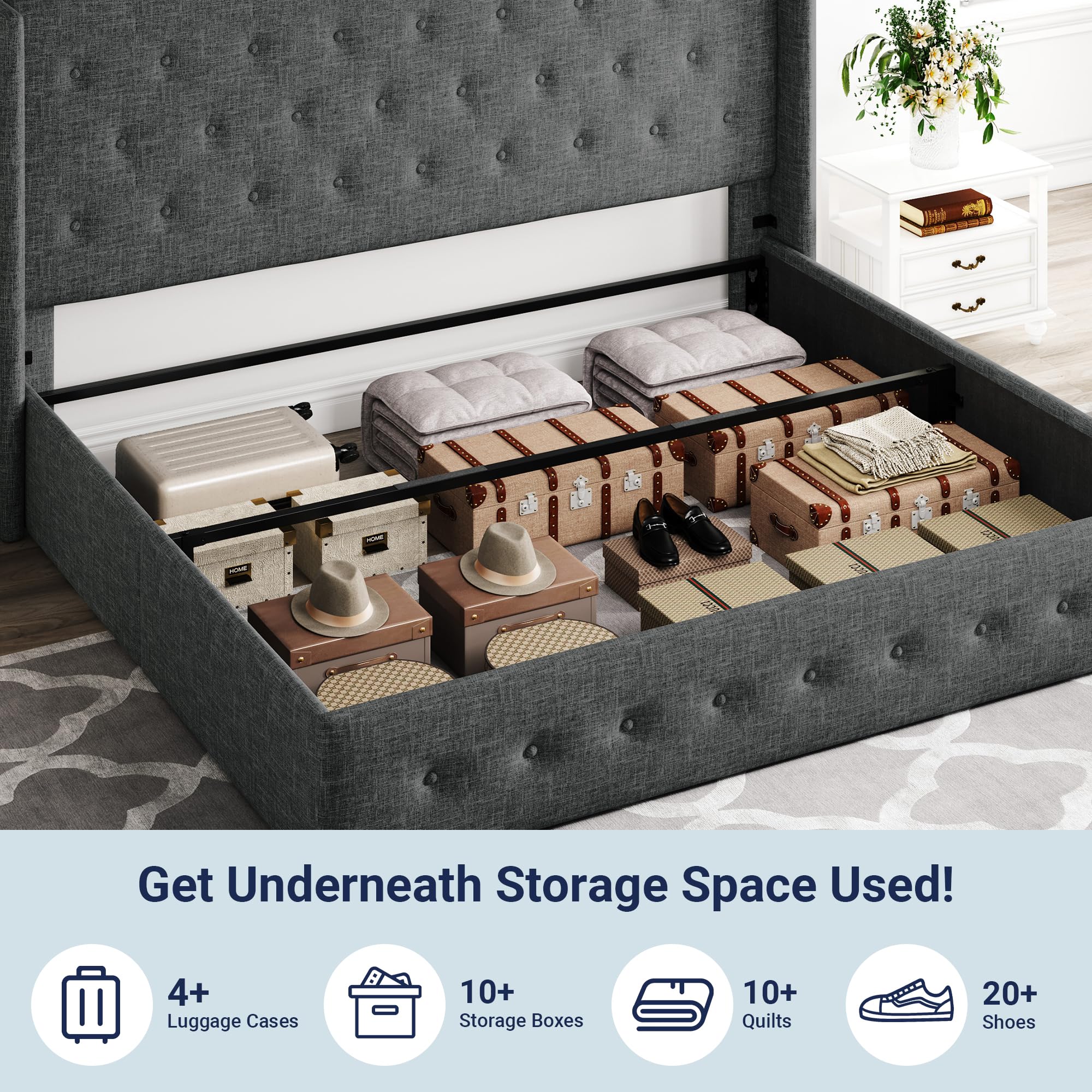 Space-Saving Storage: With its lifting up storage feature, this bed frame provides ample space to store extra bedding, clothing, shoes, and other items, especially helpful for smaller bedrooms or apartments where storage space is limited