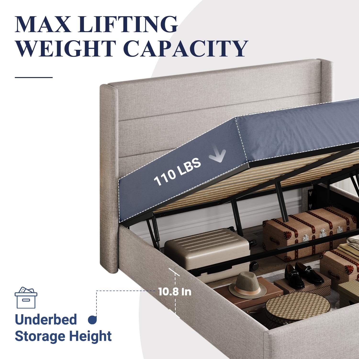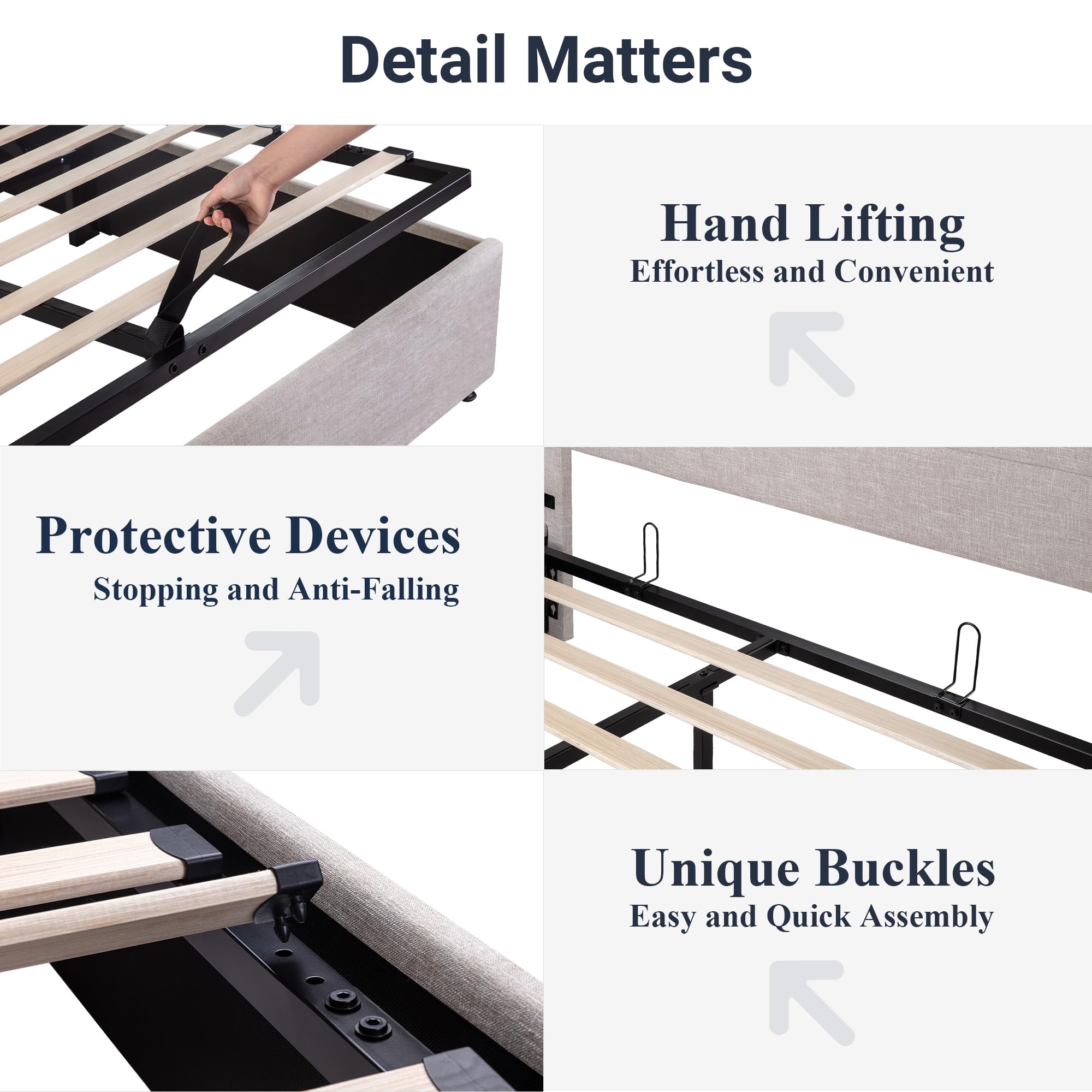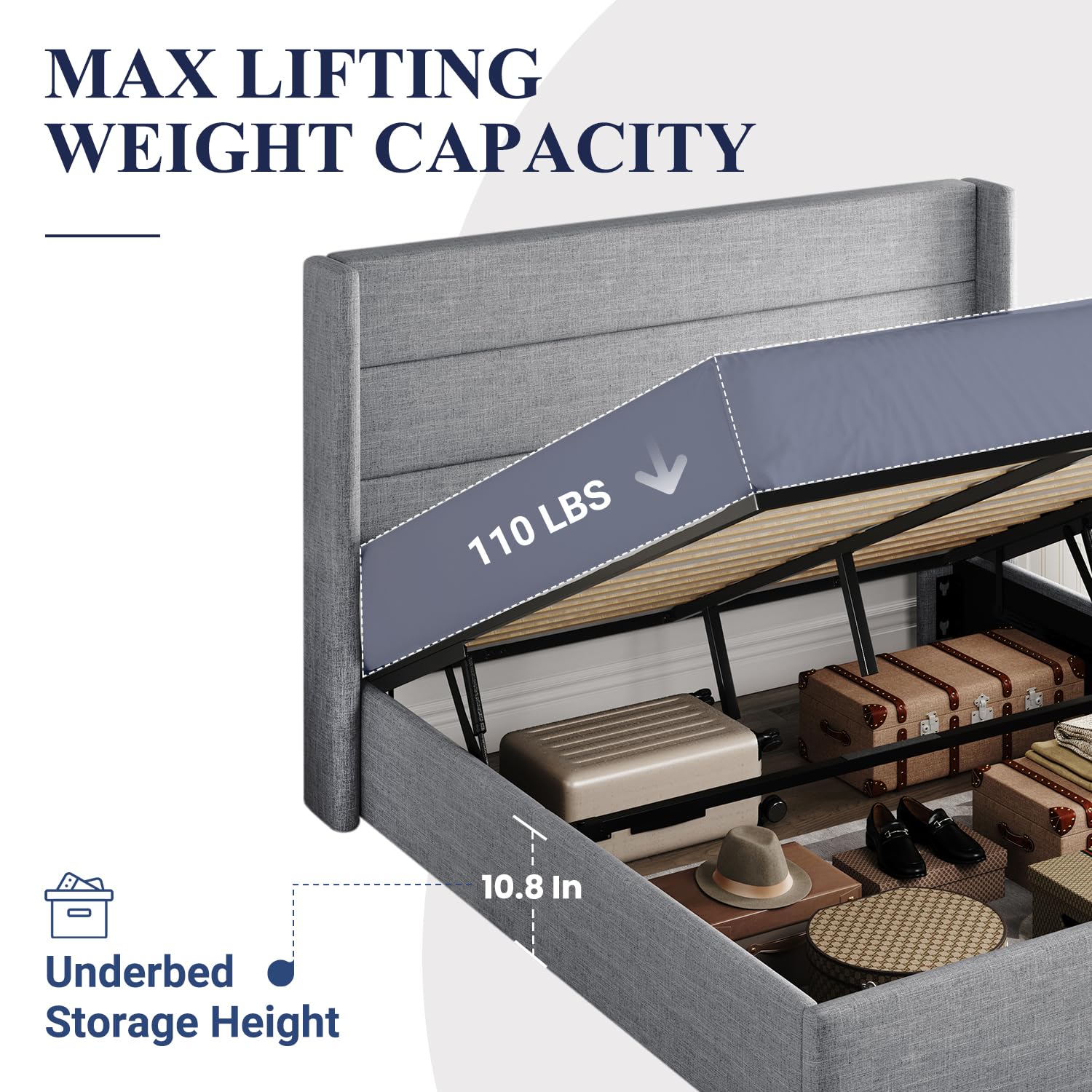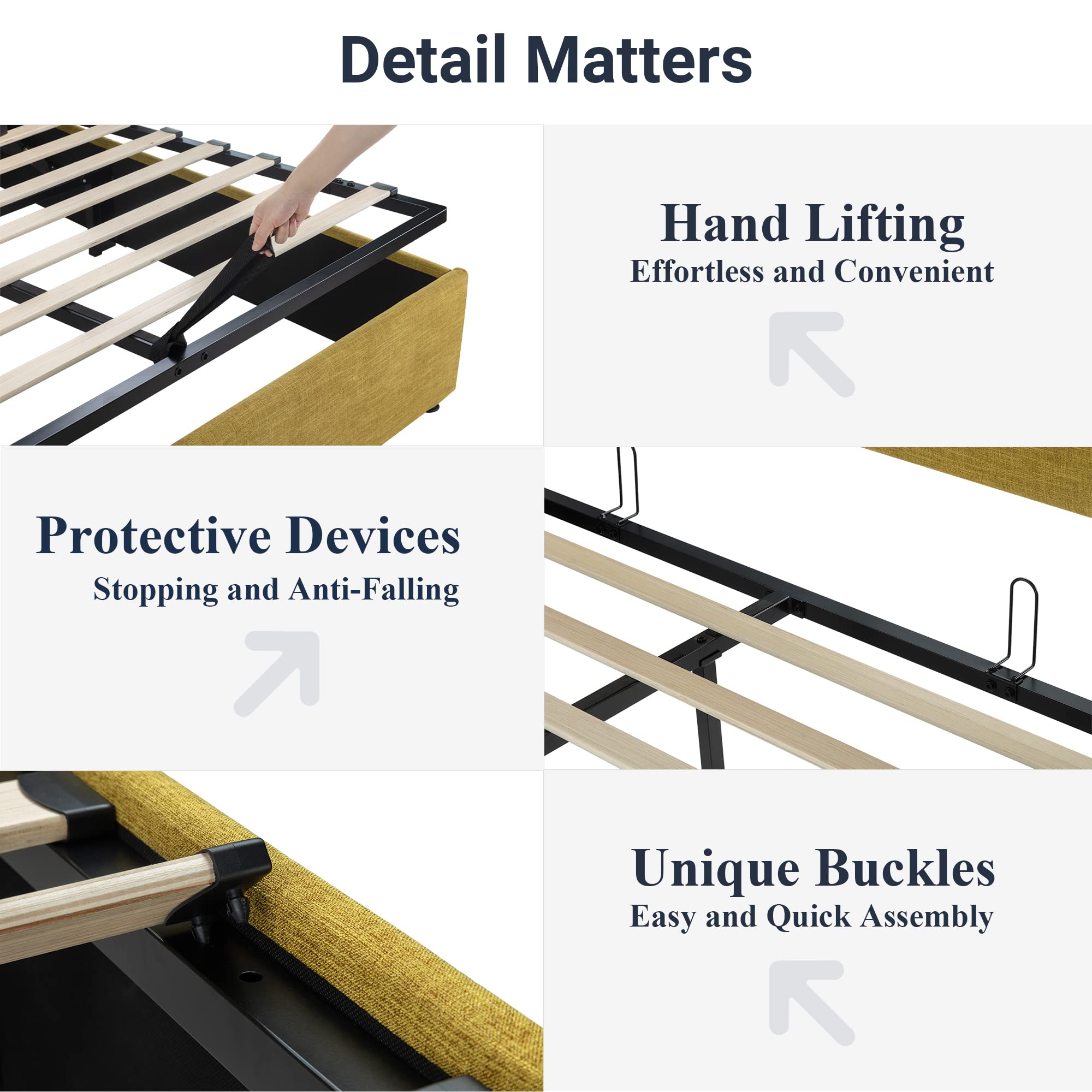 Space-Saving Storage: With its lifting up storage feature, this bed frame provides ample space to store extra bedding, clothing, shoes, and other items, especially helpful for smaller bedrooms or apartments where storage space is limited