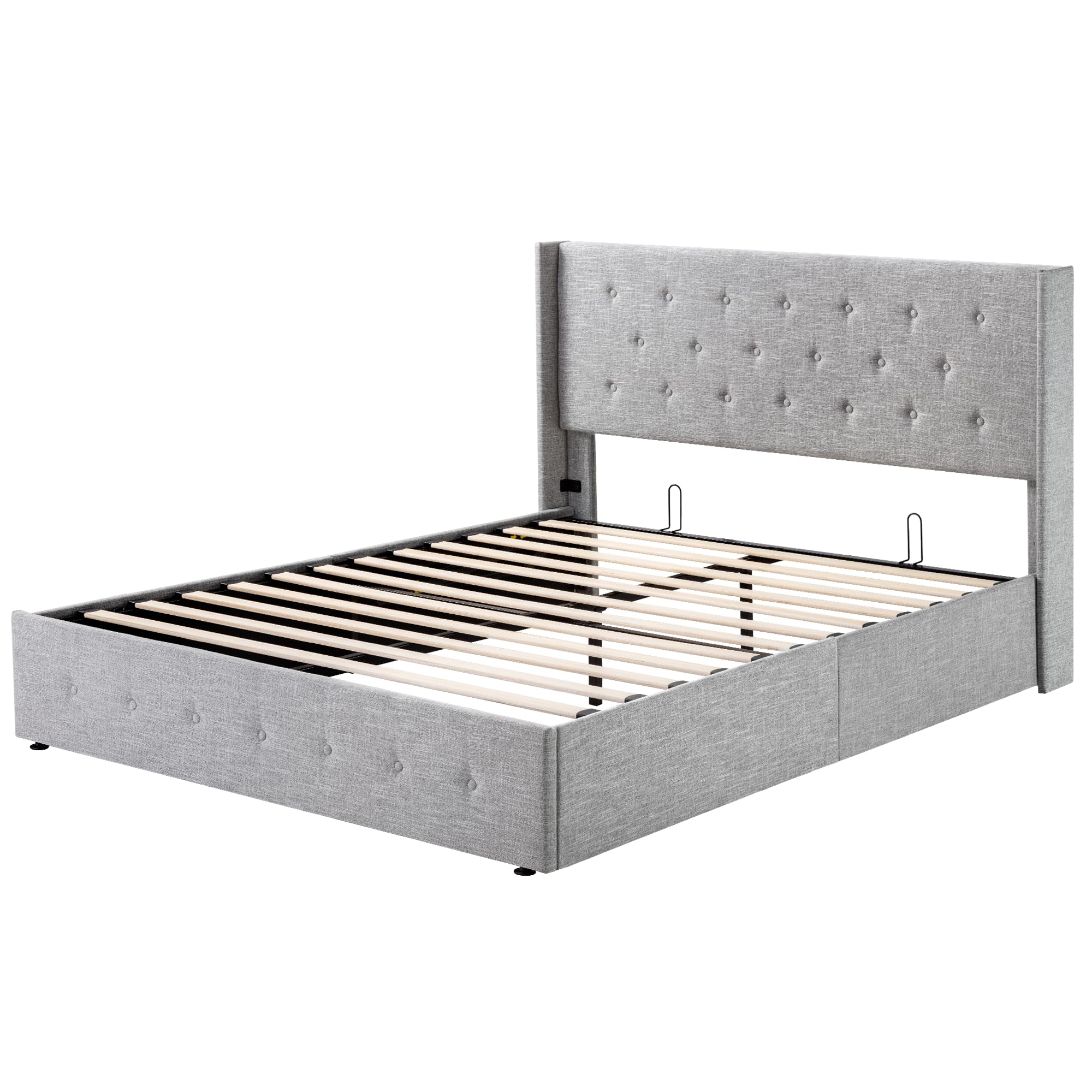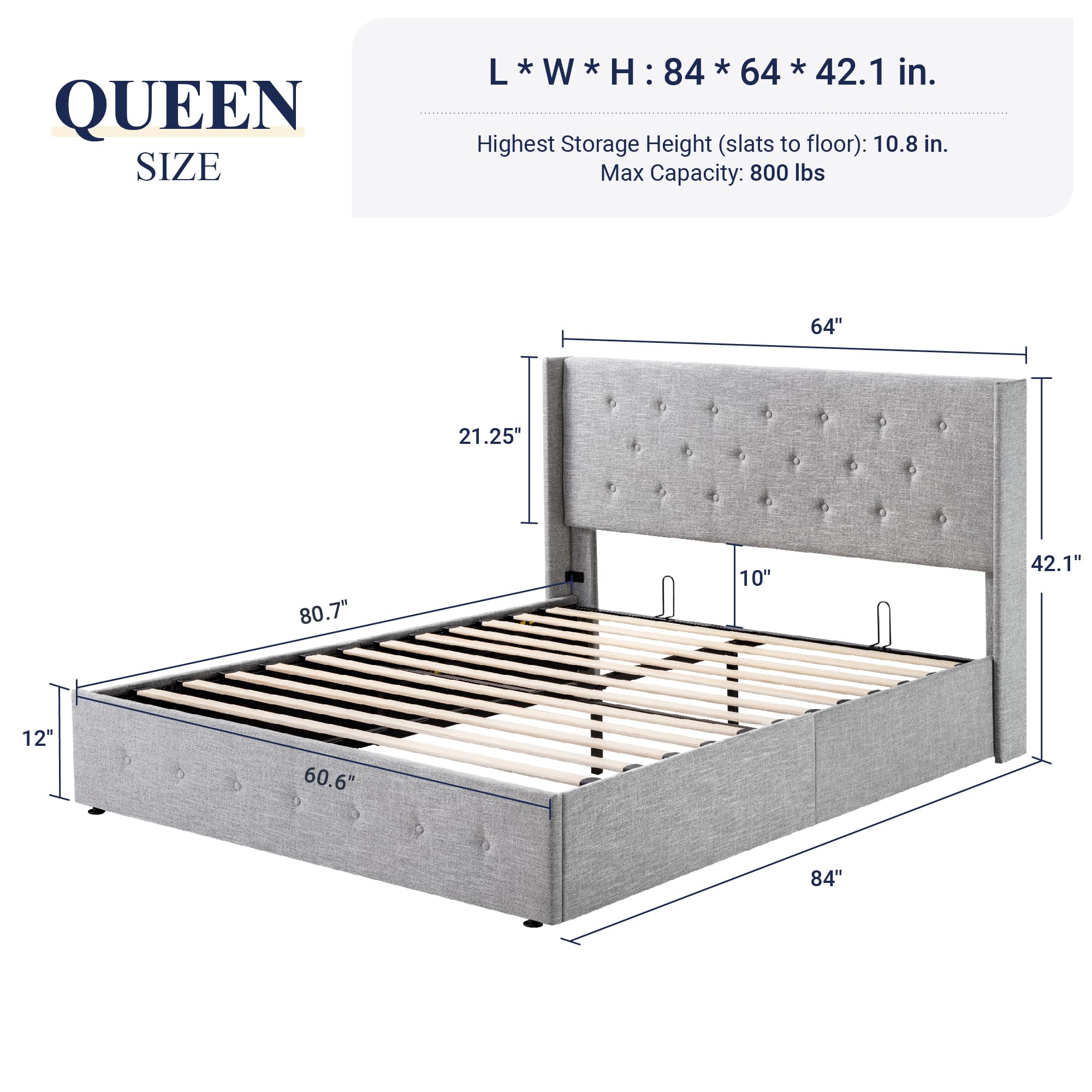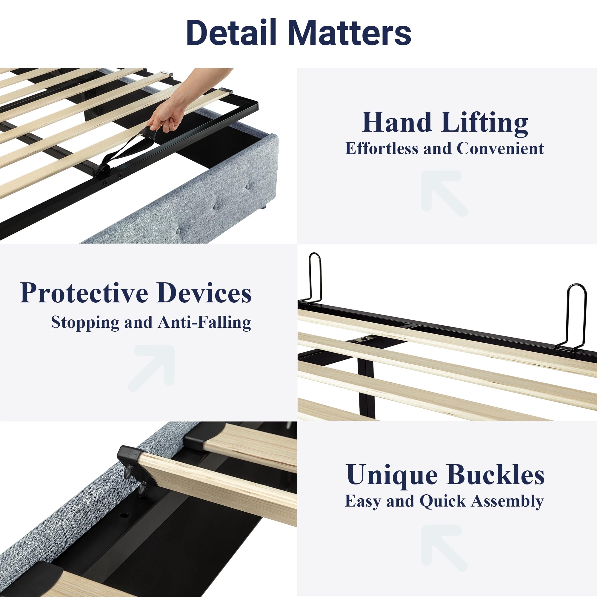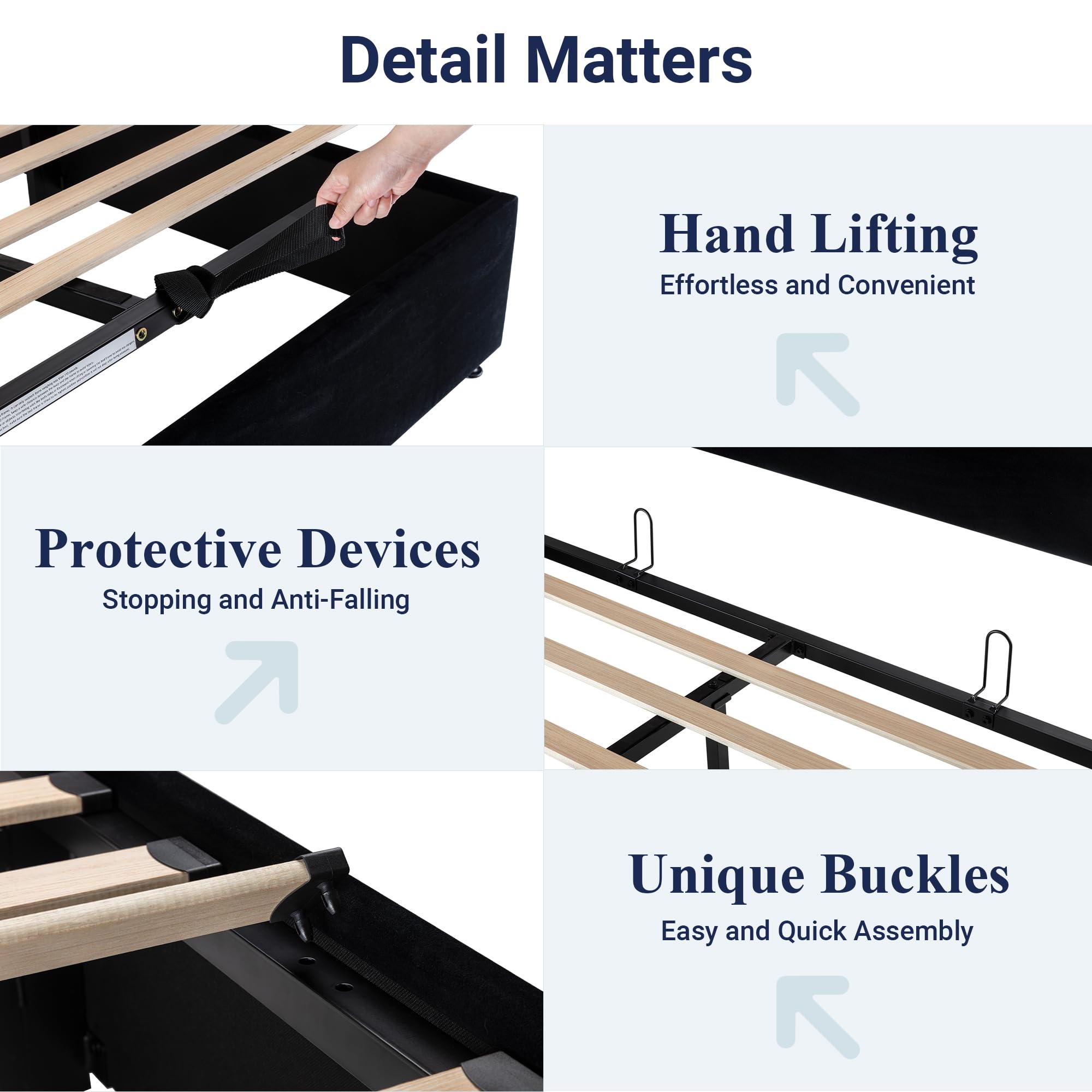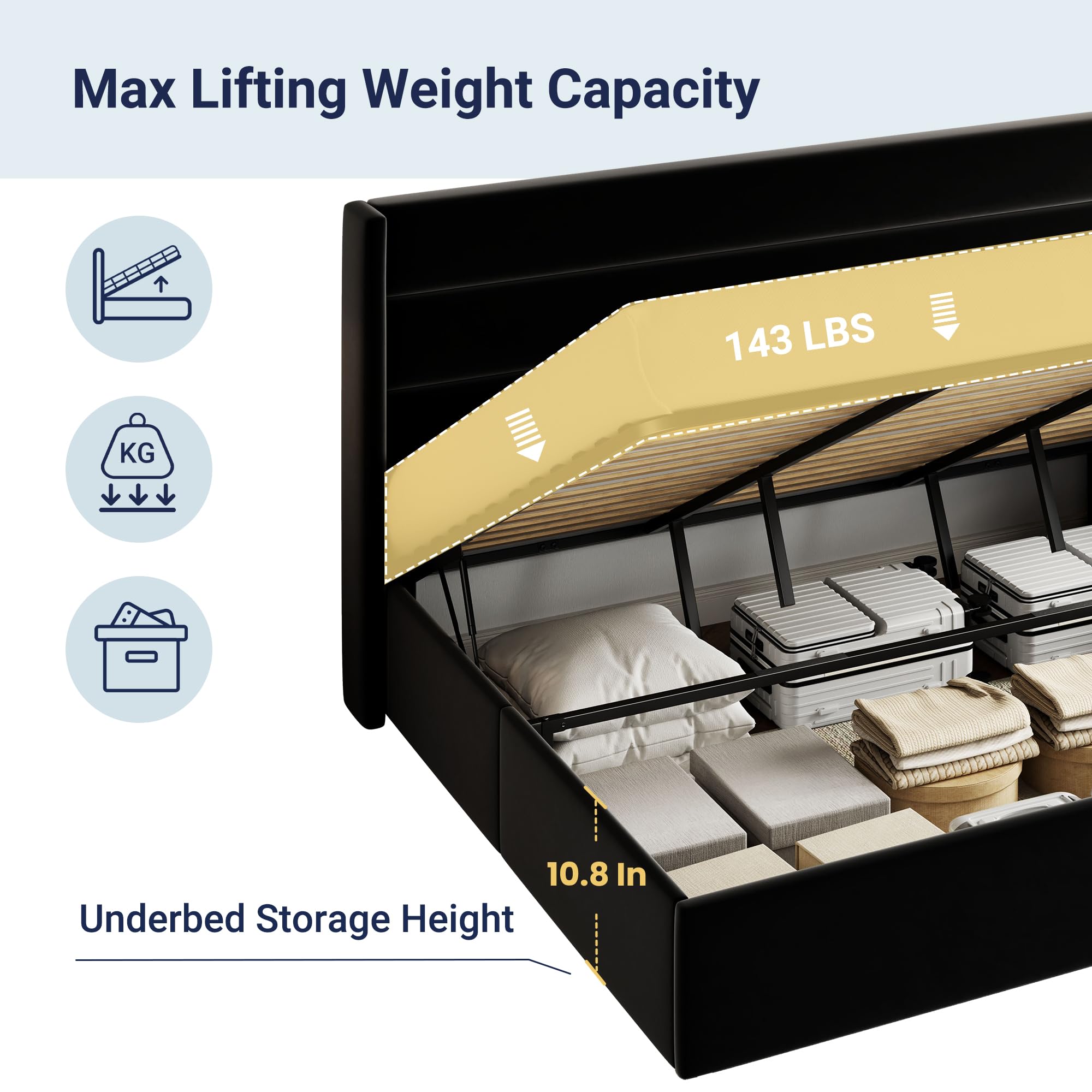 Space-Saving Storage: With its lifting up storage feature, this bed frame provides ample space to store extra bedding, clothing, shoes, and other items, especially helpful for smaller bedrooms or apartments where storage space is limited