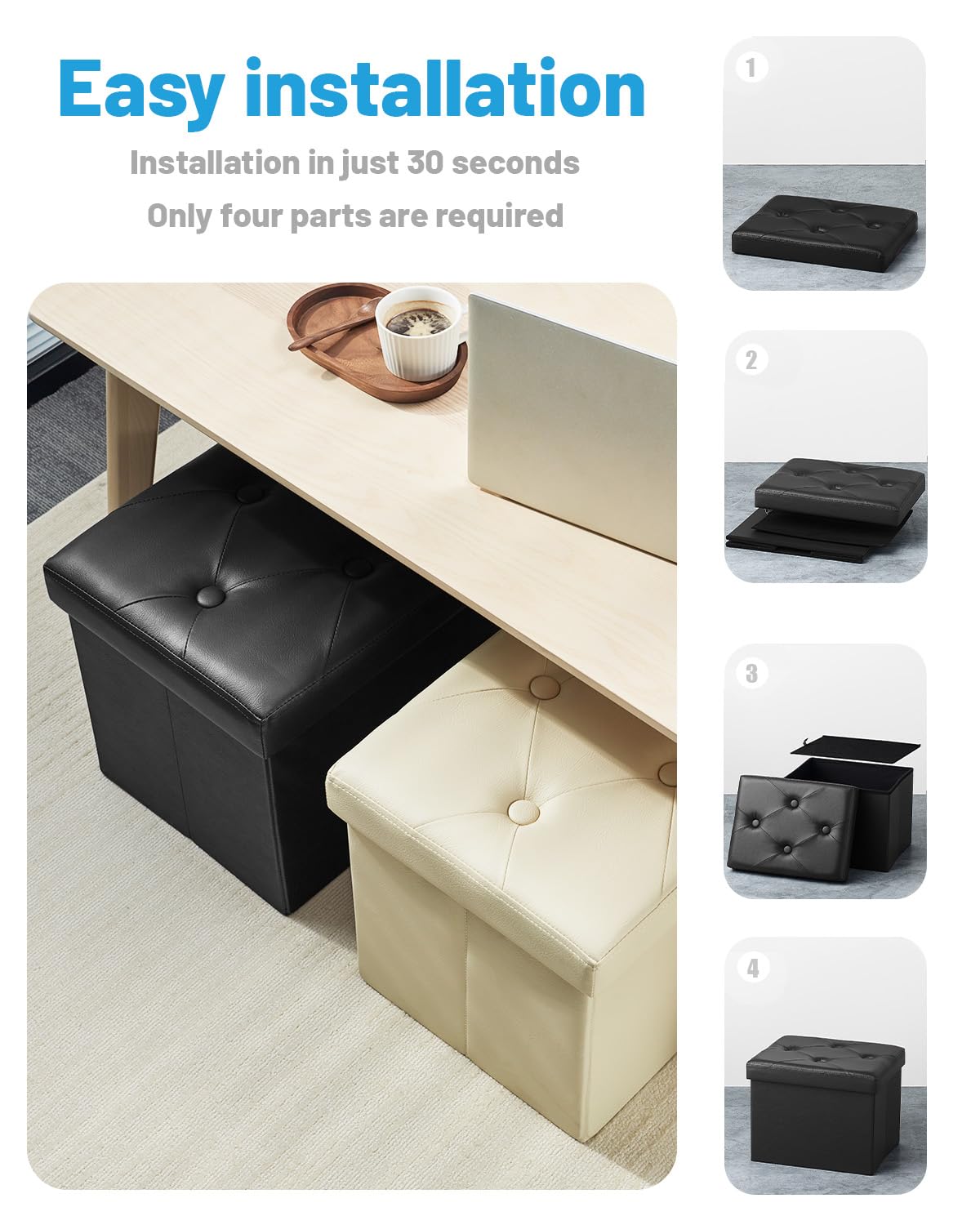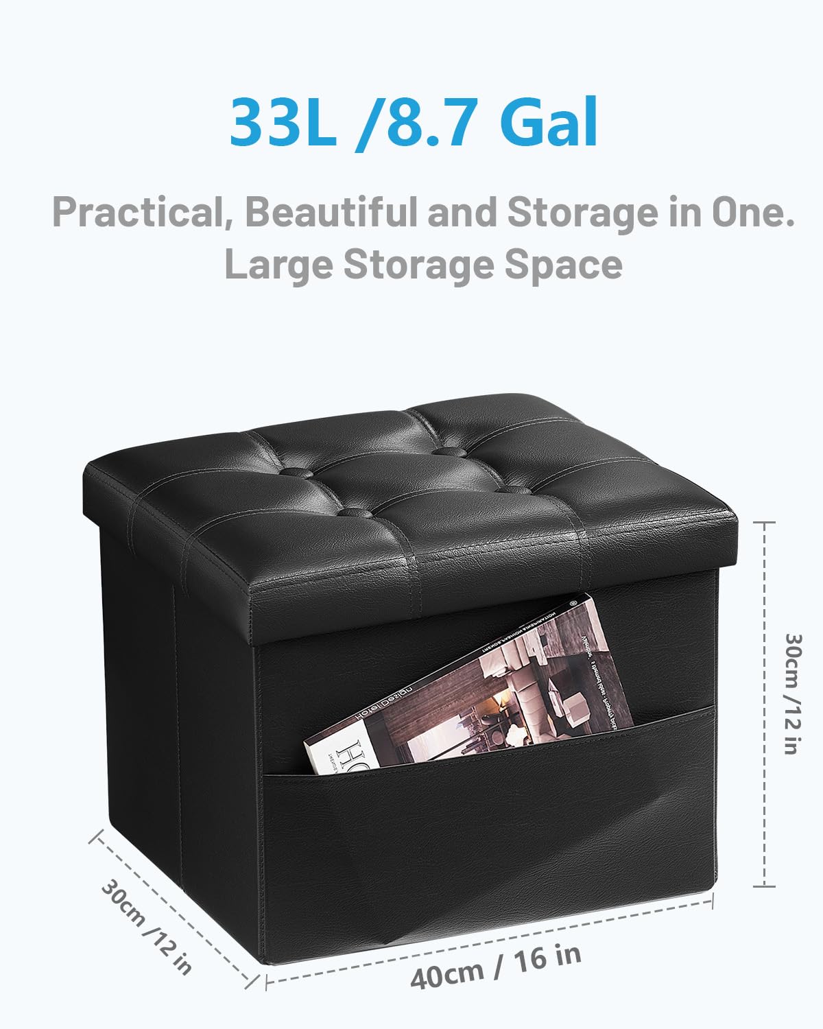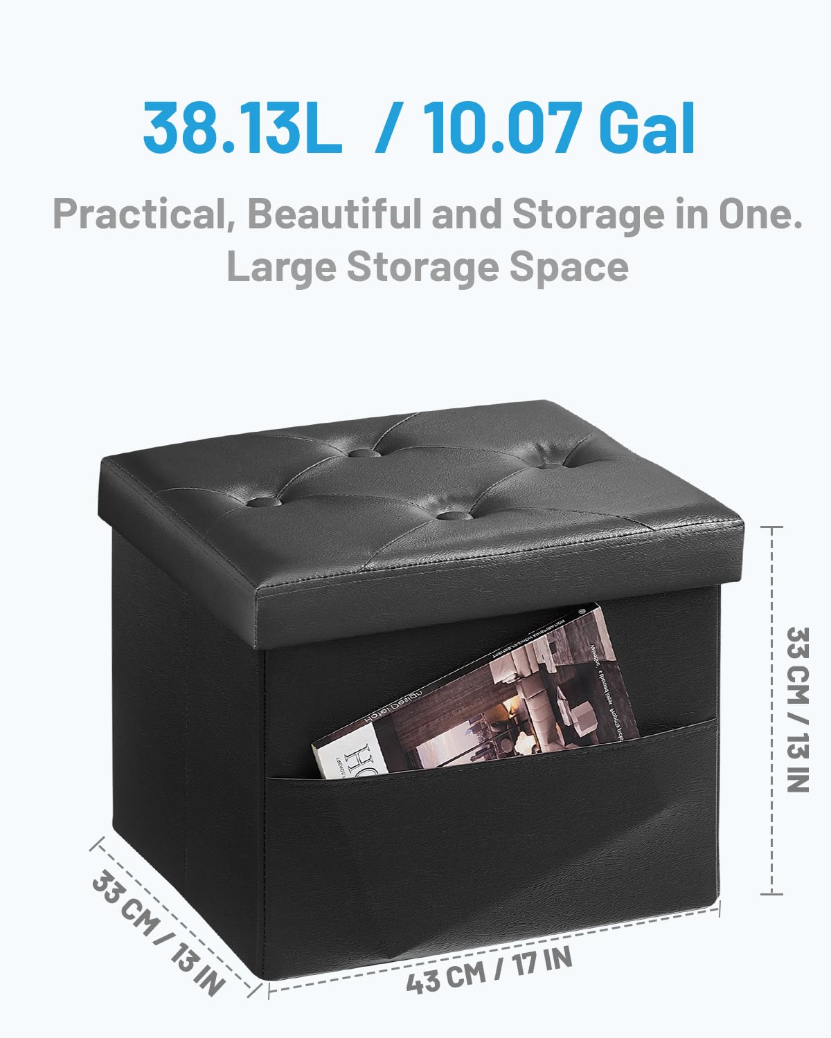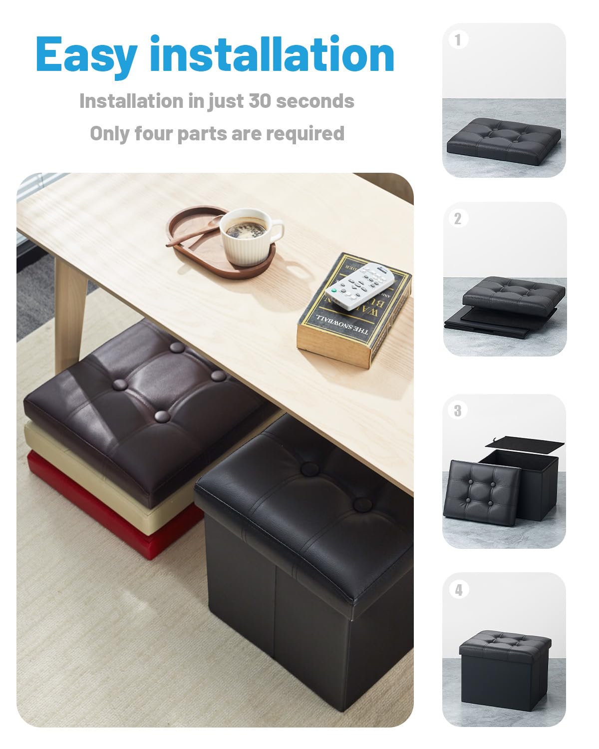 AmasSmile Storage Ottoman Folding Foot Rest Stool, Leather Footstool Bench, Short Ottoman Stool, Storage Foot Rest Store, Books (Black, 17" D x 13" W x 13" H)