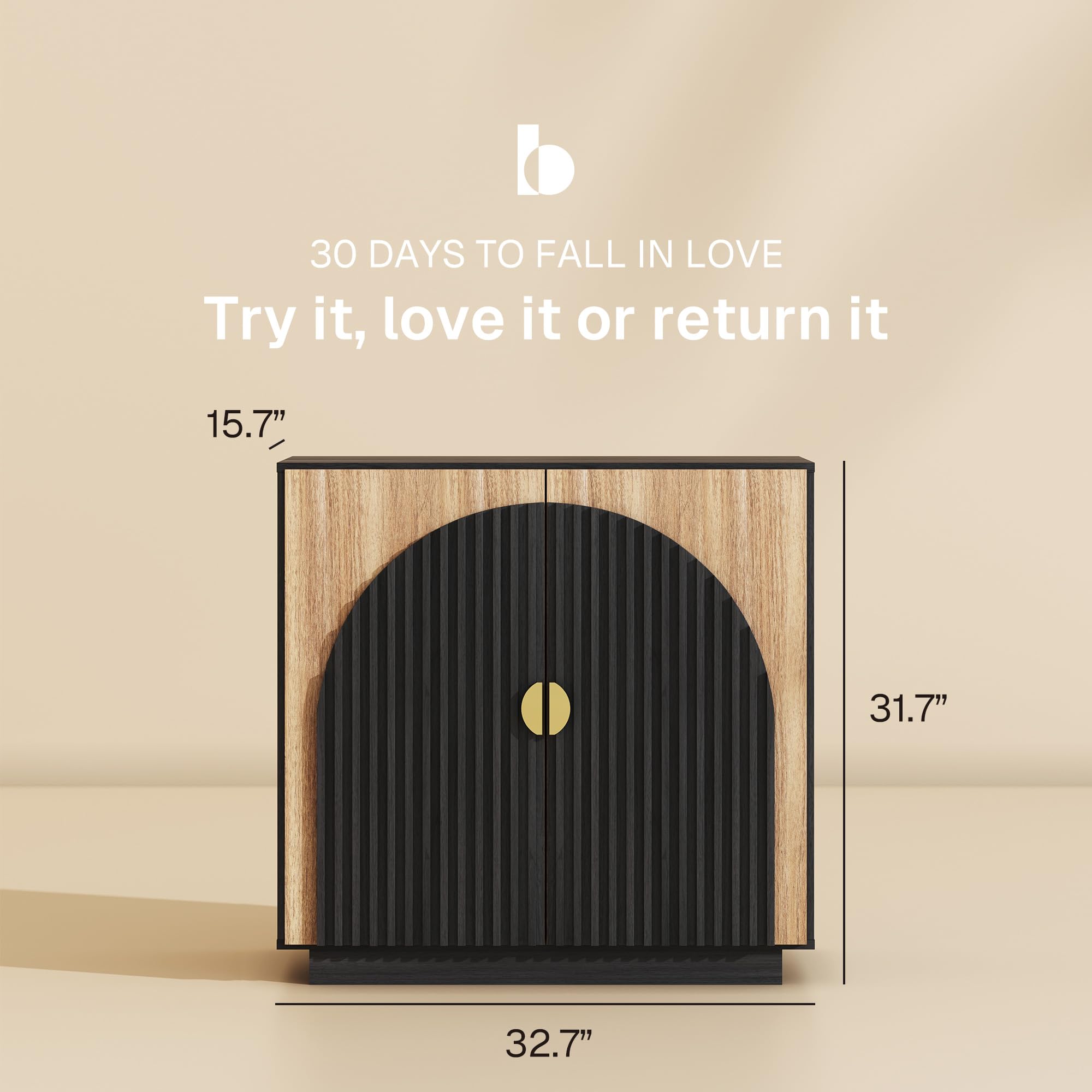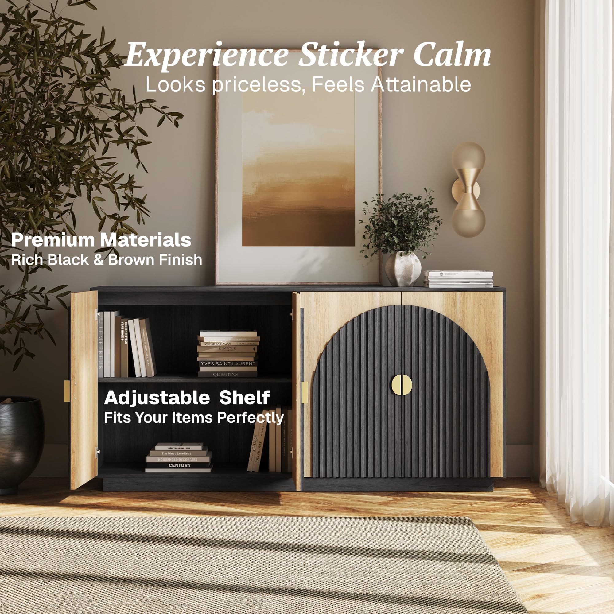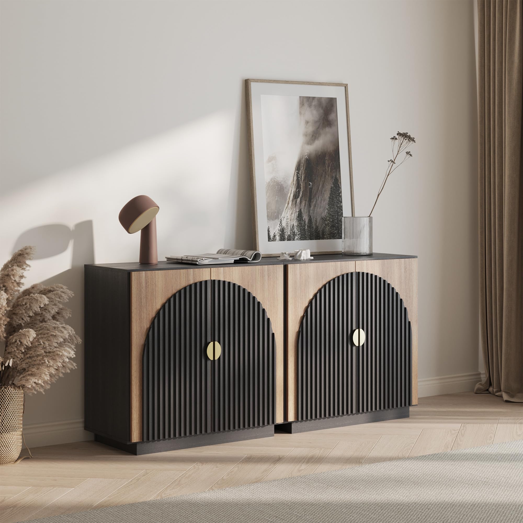 • Elegant Symmetrical Arc Design with U.S. Design Patent Pending: The sideboard cabinet showcases a striking symmetrical arc on its doors, crafted with thick panels and hand-nailed decorative strips. This unique design adds a touch of sophistication to any dining room, kitchen, or living room, elevating your home's aesthetic appeal.