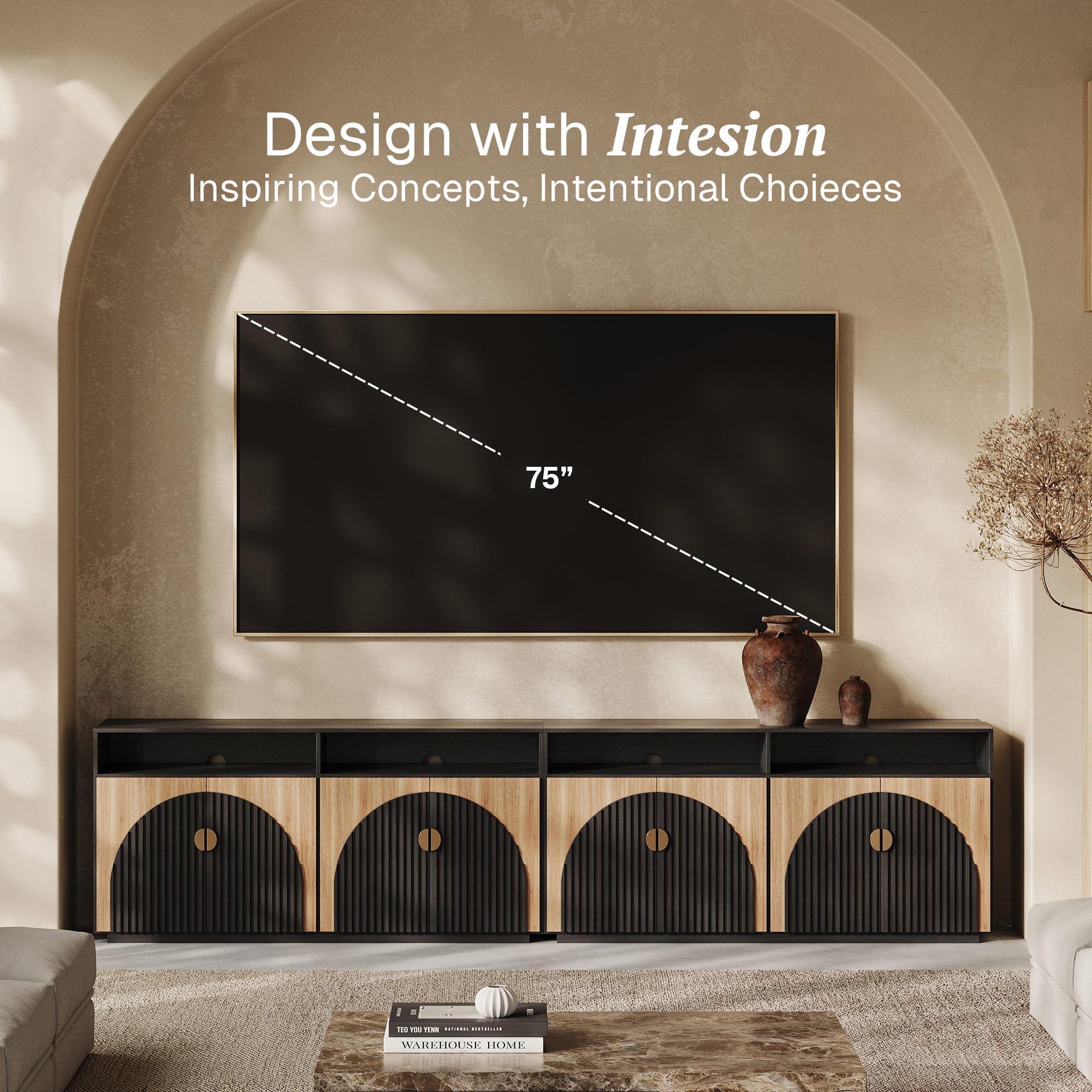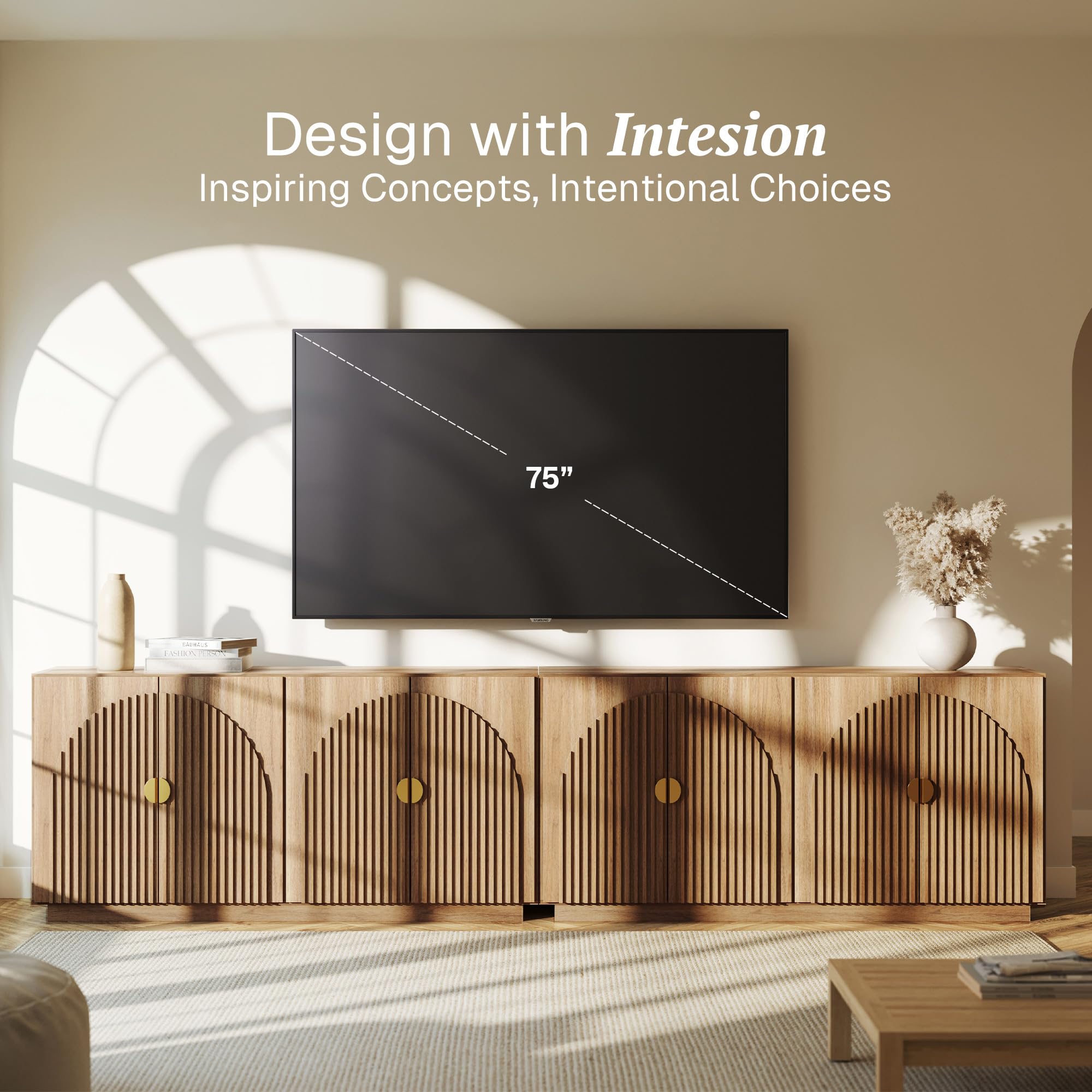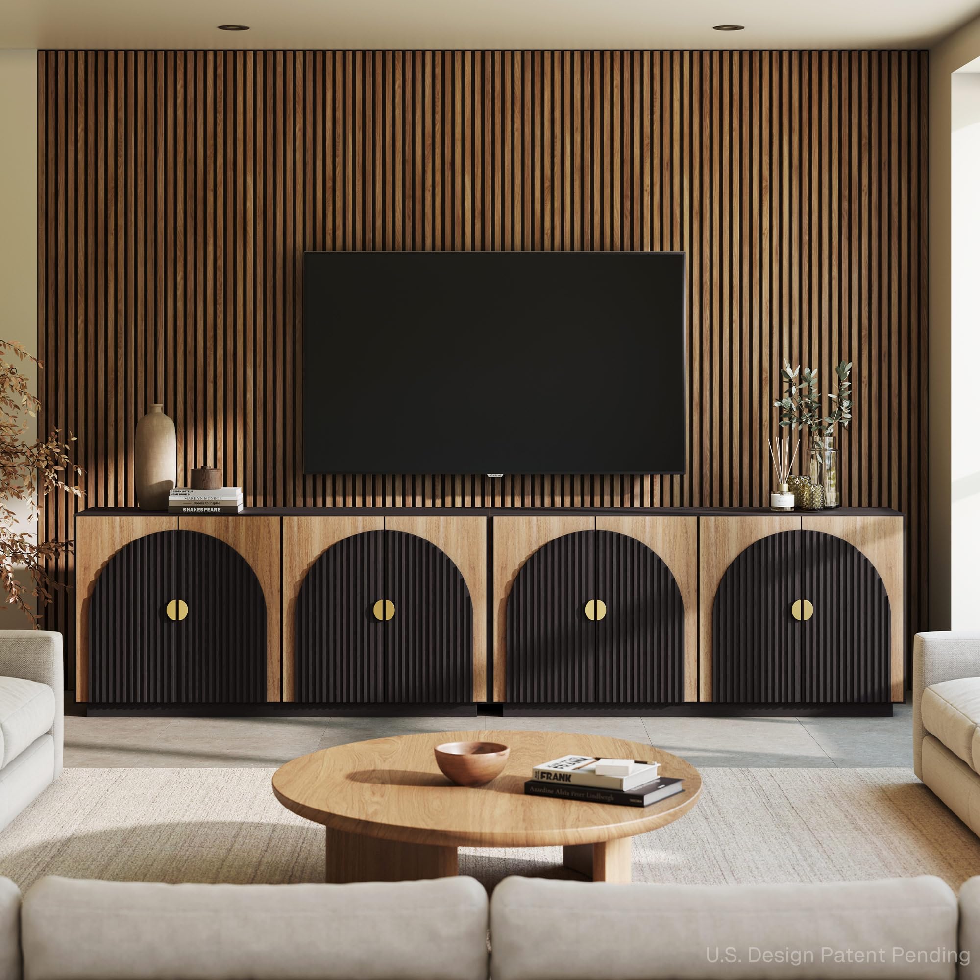 • Elegant Symmetrical Arc Design with U.S. Design Patent Pending: The sideboard cabinet showcases a striking symmetrical arc on its doors, crafted with thick panels and hand-nailed decorative strips. This unique design adds a touch of sophistication to any dining room, kitchen, or living room, elevating your home's aesthetic appeal.