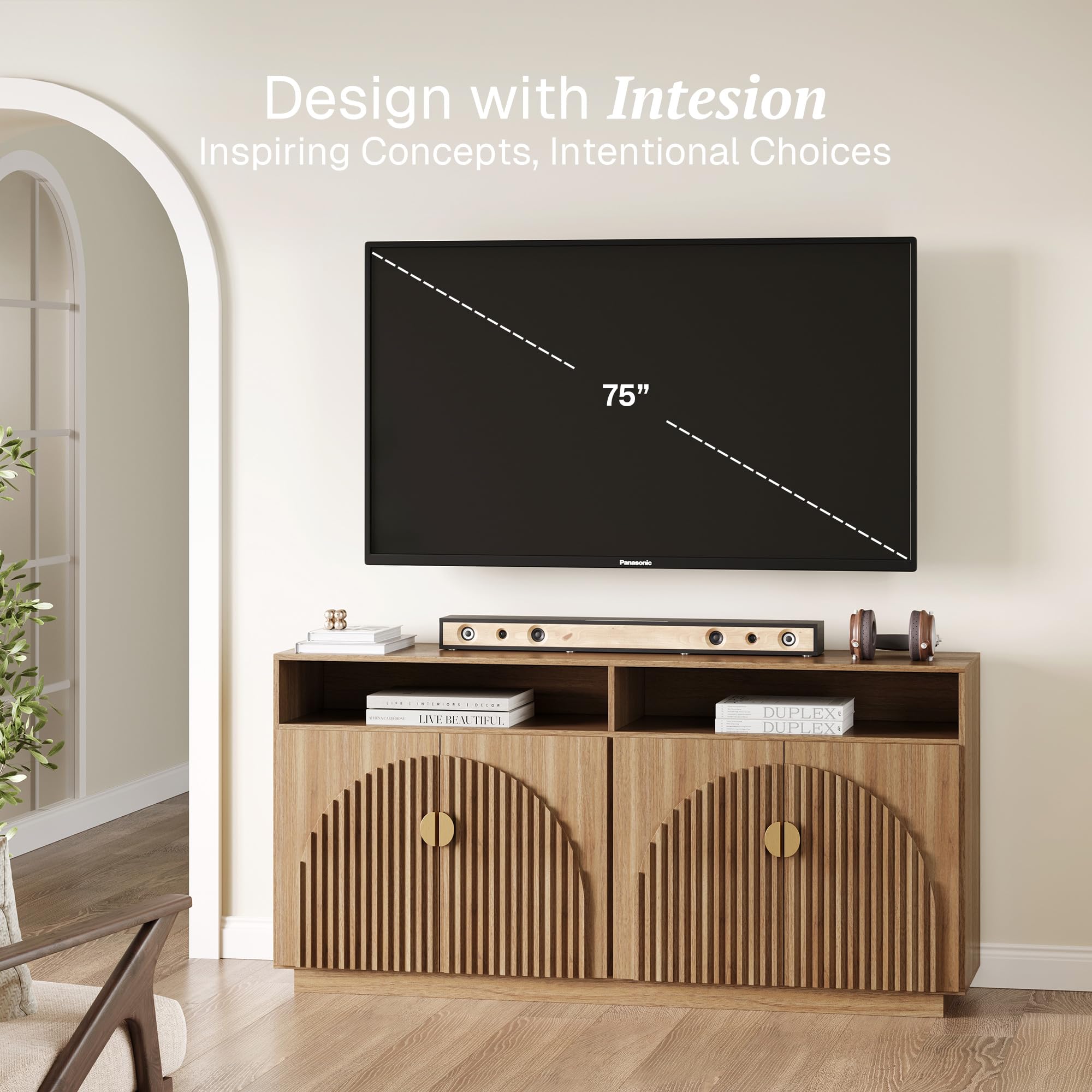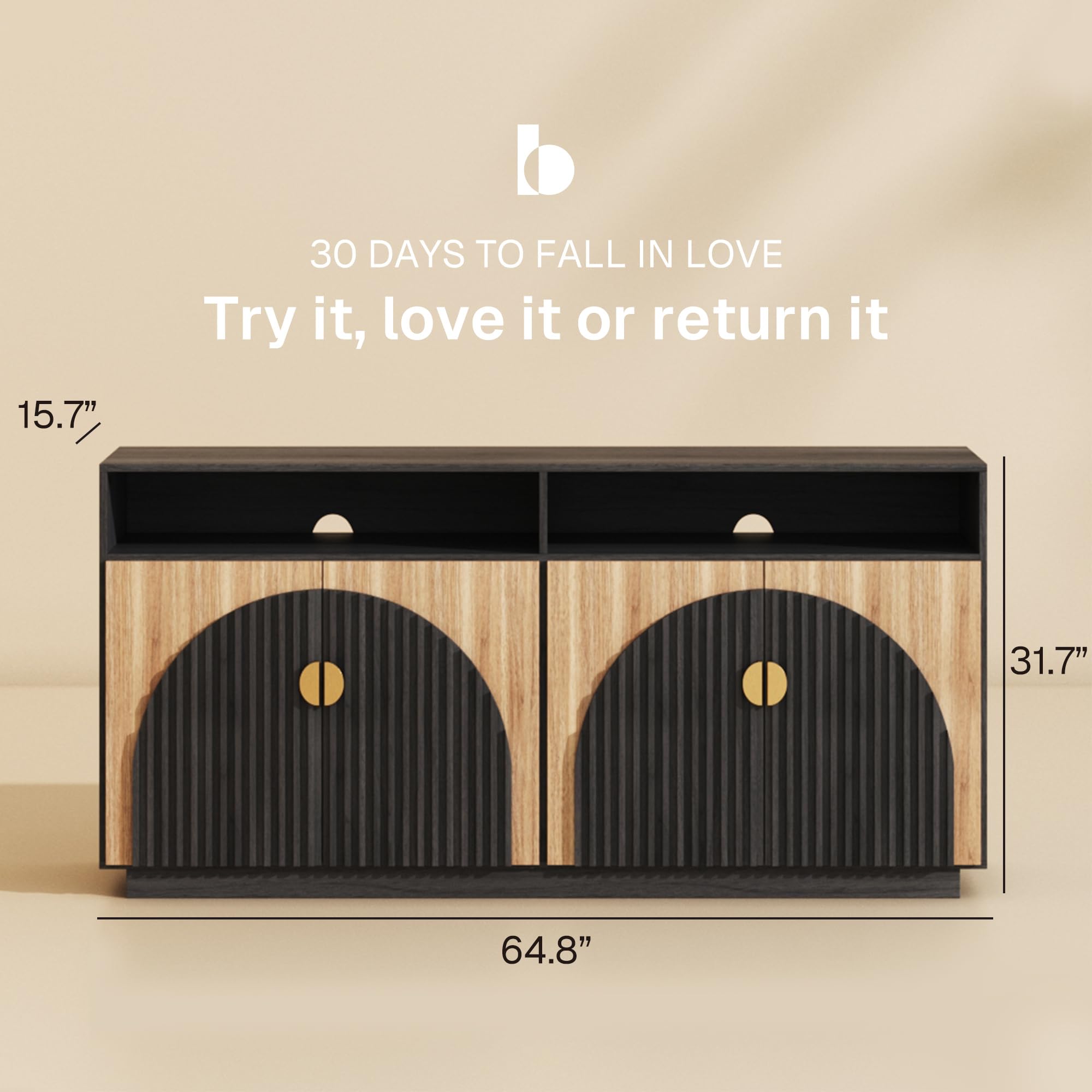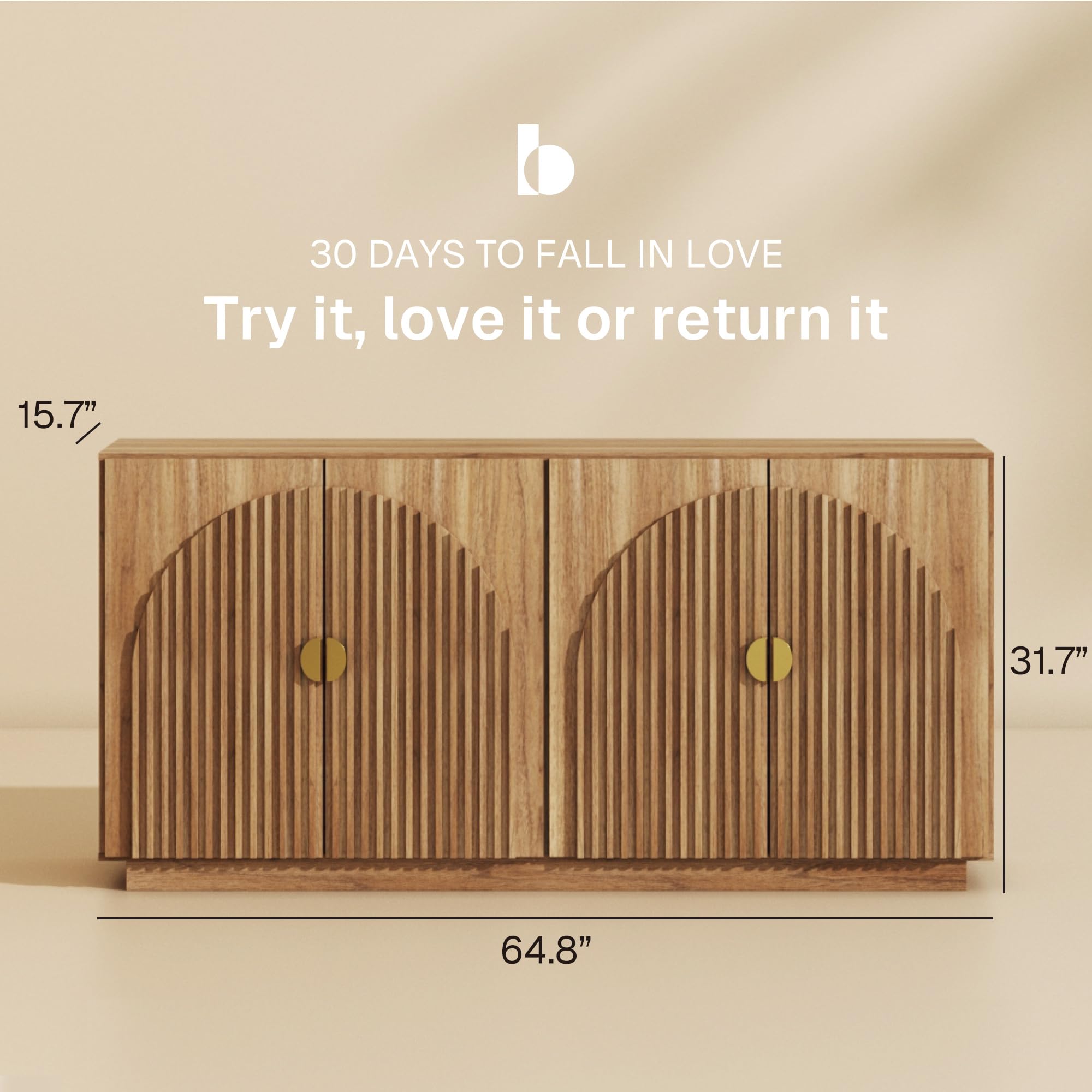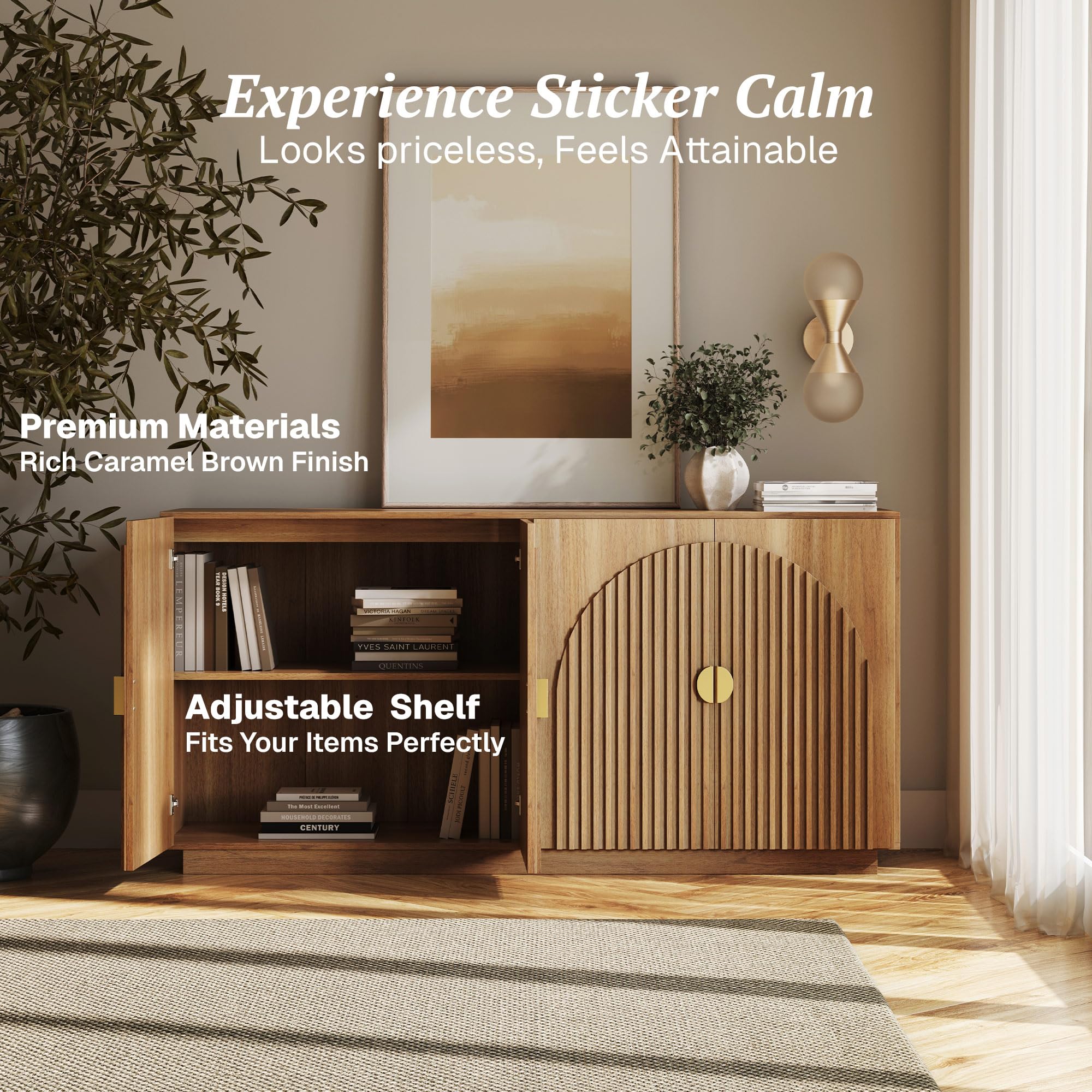 BELLEZE 65 Inch Fluted Buffet Cabinet with Storage, Symmetrical Arc Accent Sideboard Large Console Table for Dining Room, Kitchen, and Living Room (Caramel Brown)