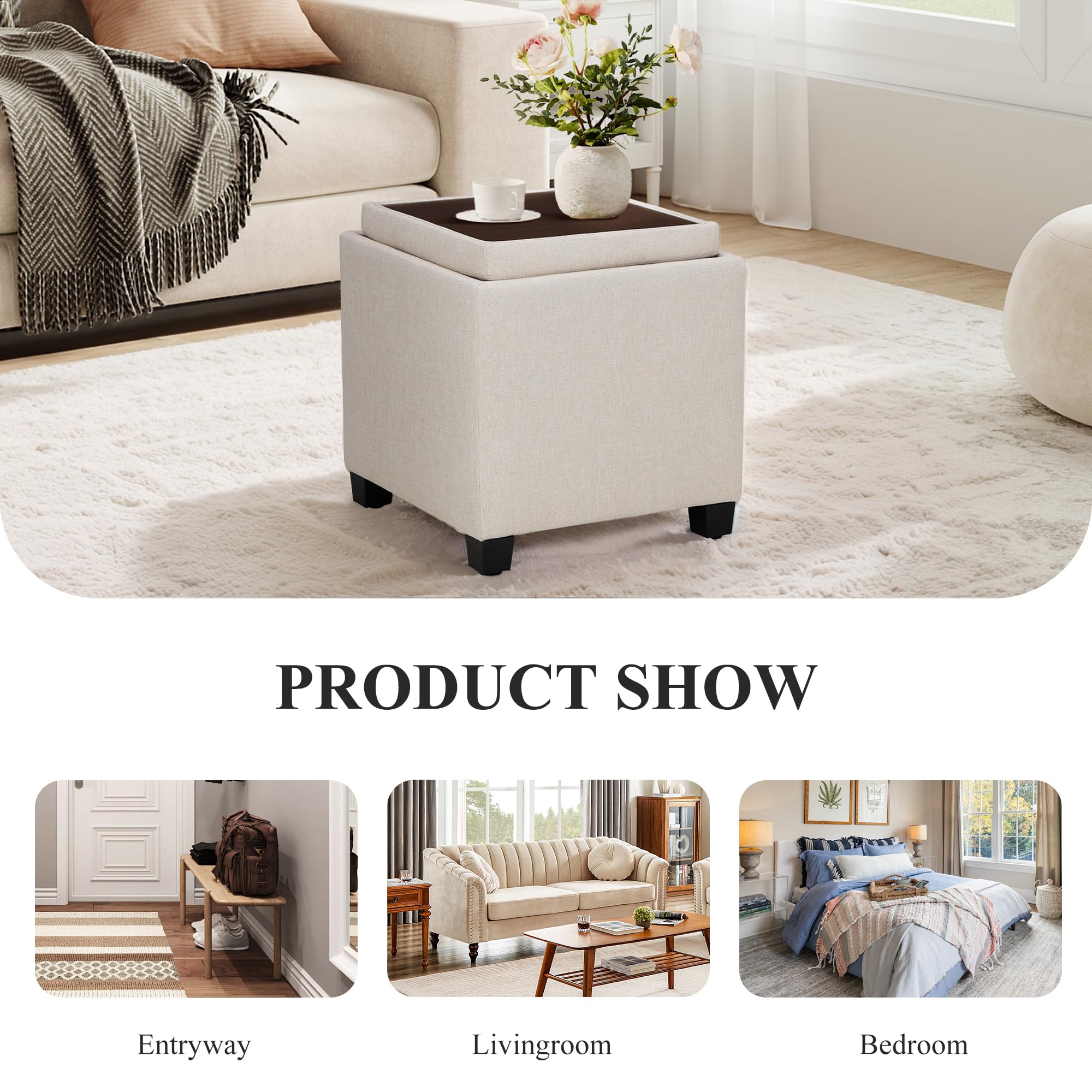COLAMY Fabric Square Storage Ottoman with Reversible Tray Lid – Multi-Functional Footrest, Hidden Storage, Sturdy & Stylish Small Coffee Table for Living Room, Bedroom, or Entryway(Beige)
