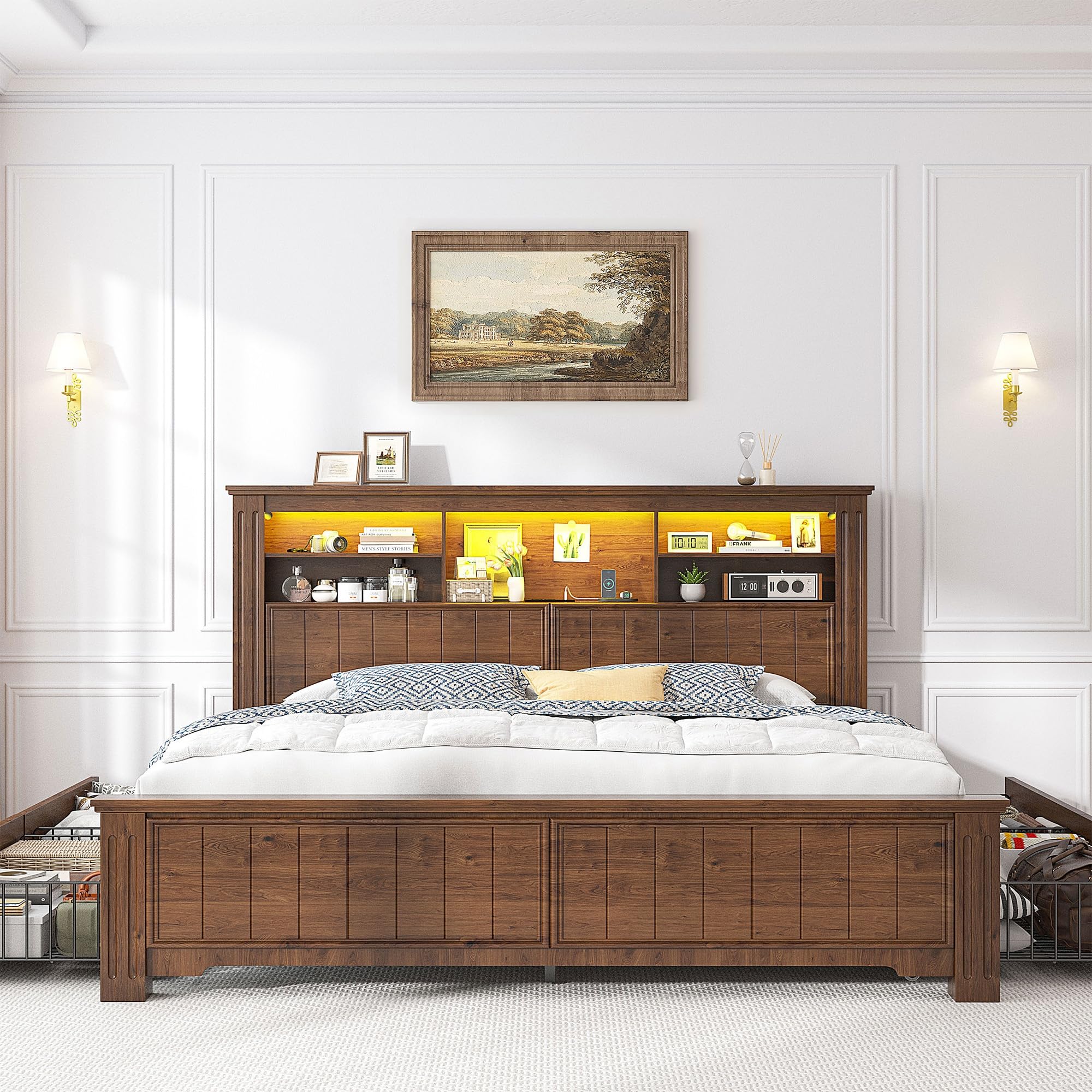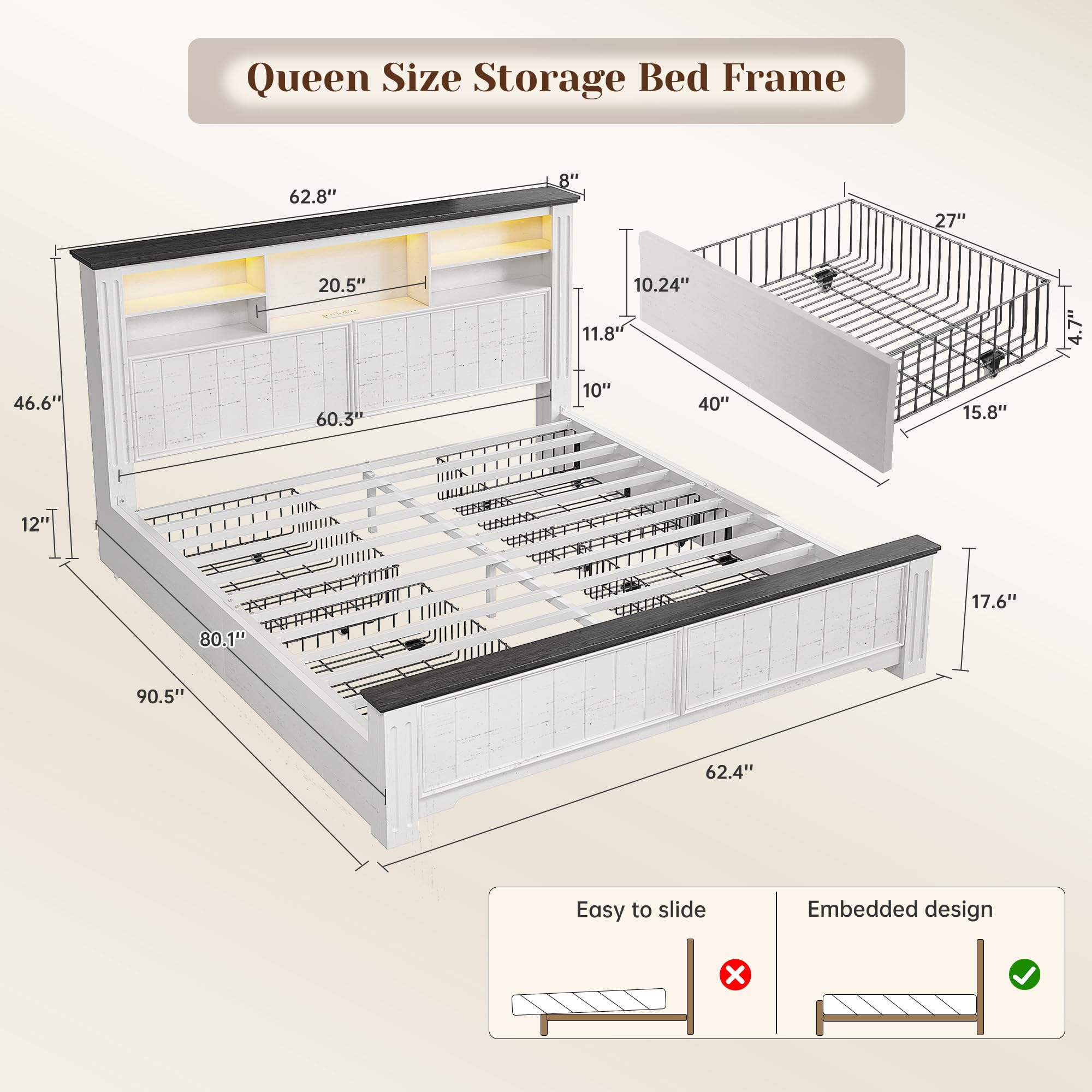 EnHomee King Size Bed Frame and Headboard & Storage, 4 Drawers and LED Built in Charging Station King Bed Frame with Storage Farmhouse,NO Noise,No Box Spring Needed,White