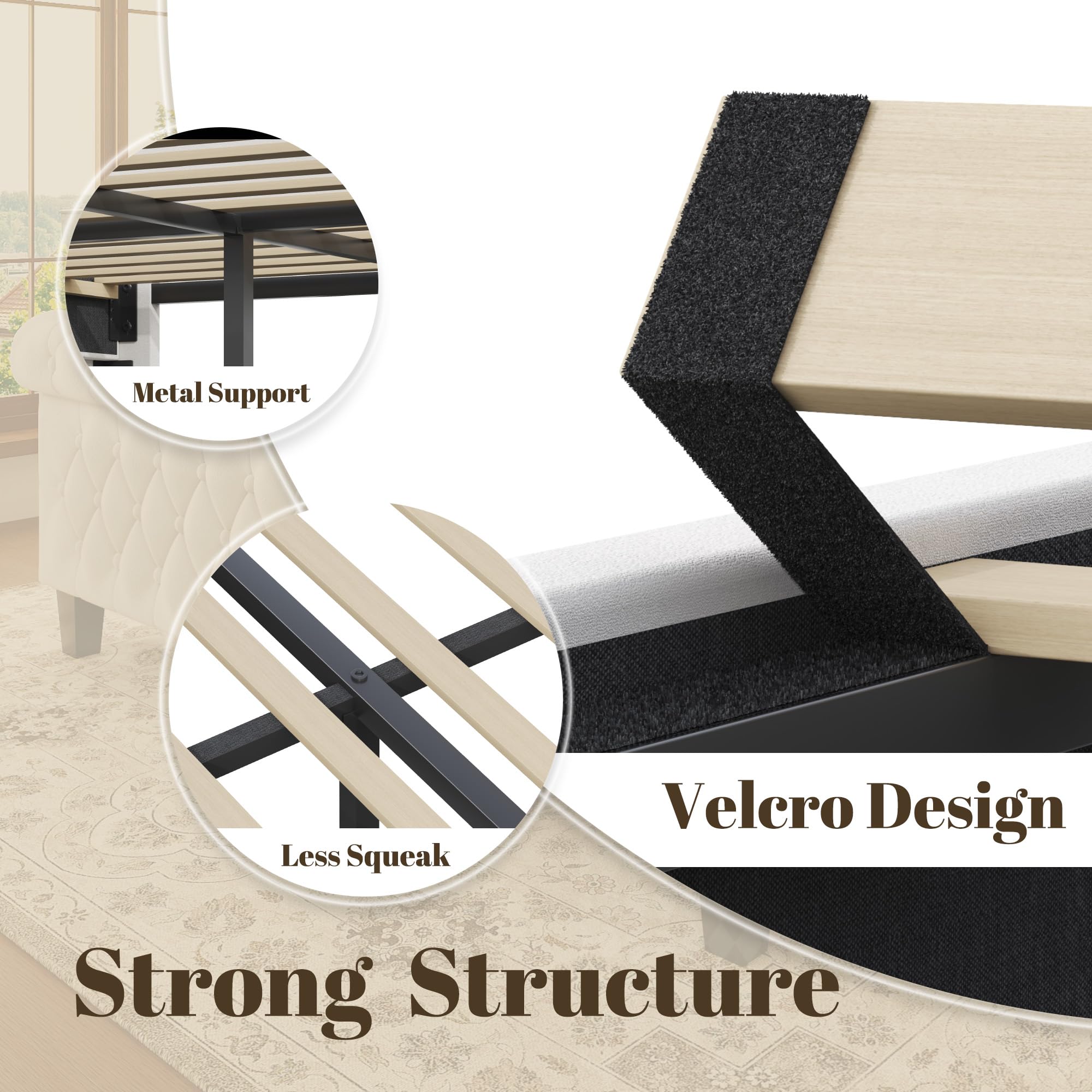 - 【Quiet Stability & 800LB Strong Support】 Say goodbye to squeaky disruptions. Engineered for uninterrupted sleep, the Velcro-locked solid wood slats and EVA noise-absorbing strips eliminate shifting and squeaking. Rigorously tested to support 800 lbs—equivalent to two adults and a large pet—this frame guarantees silent stability through restless nights and all movements
