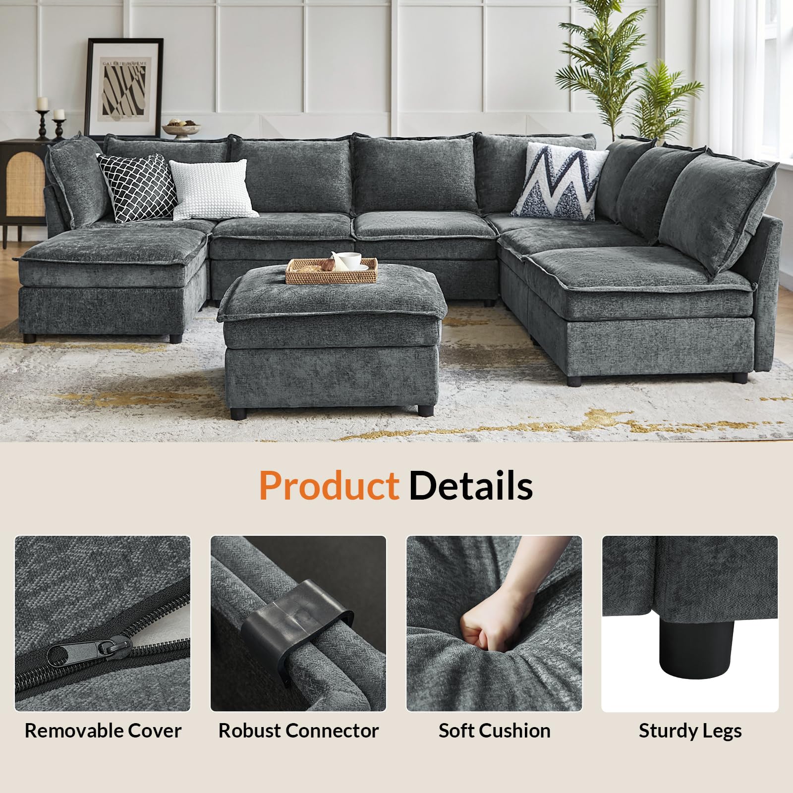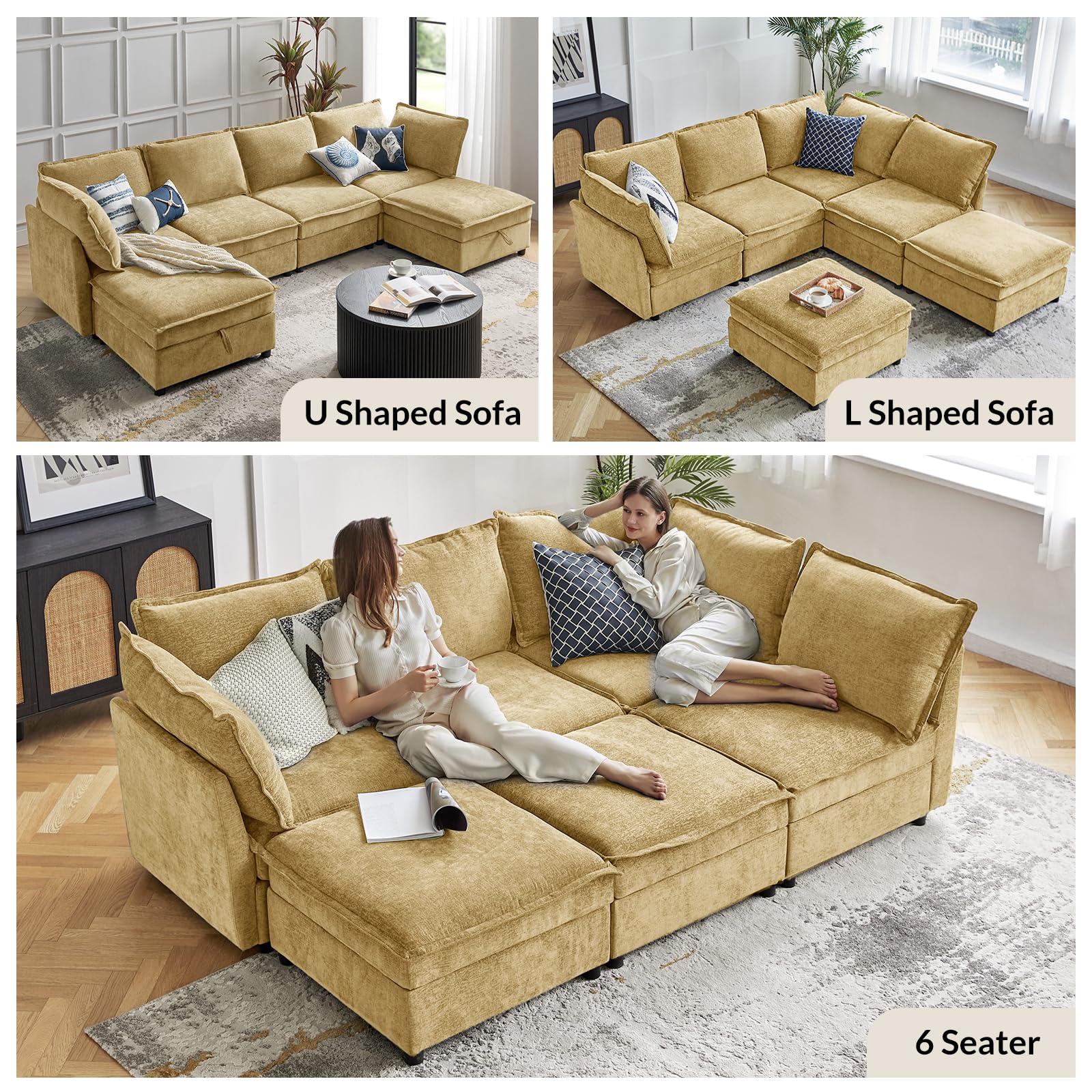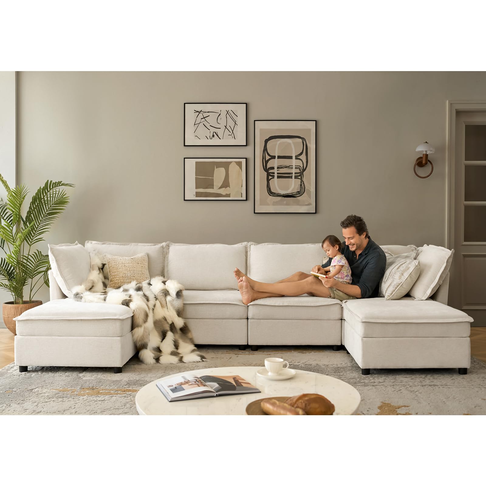 HULALA HOME 127'' Modular Sectional Sofa, Oversized U Shaped Couch with Storage Ottoman, Comfy Chenille Sofa with Deep Seat, 6 Seat Convertible Couches for Living Room, Beige