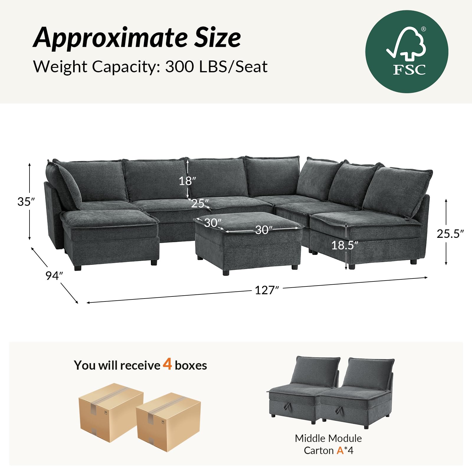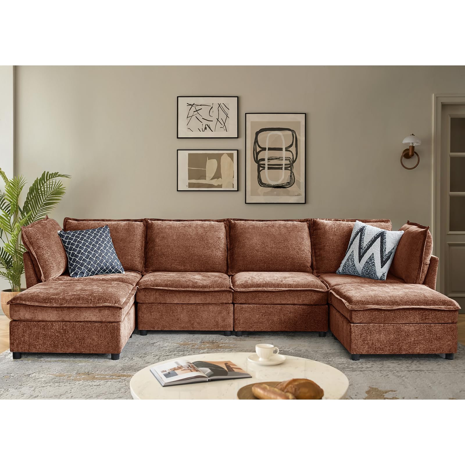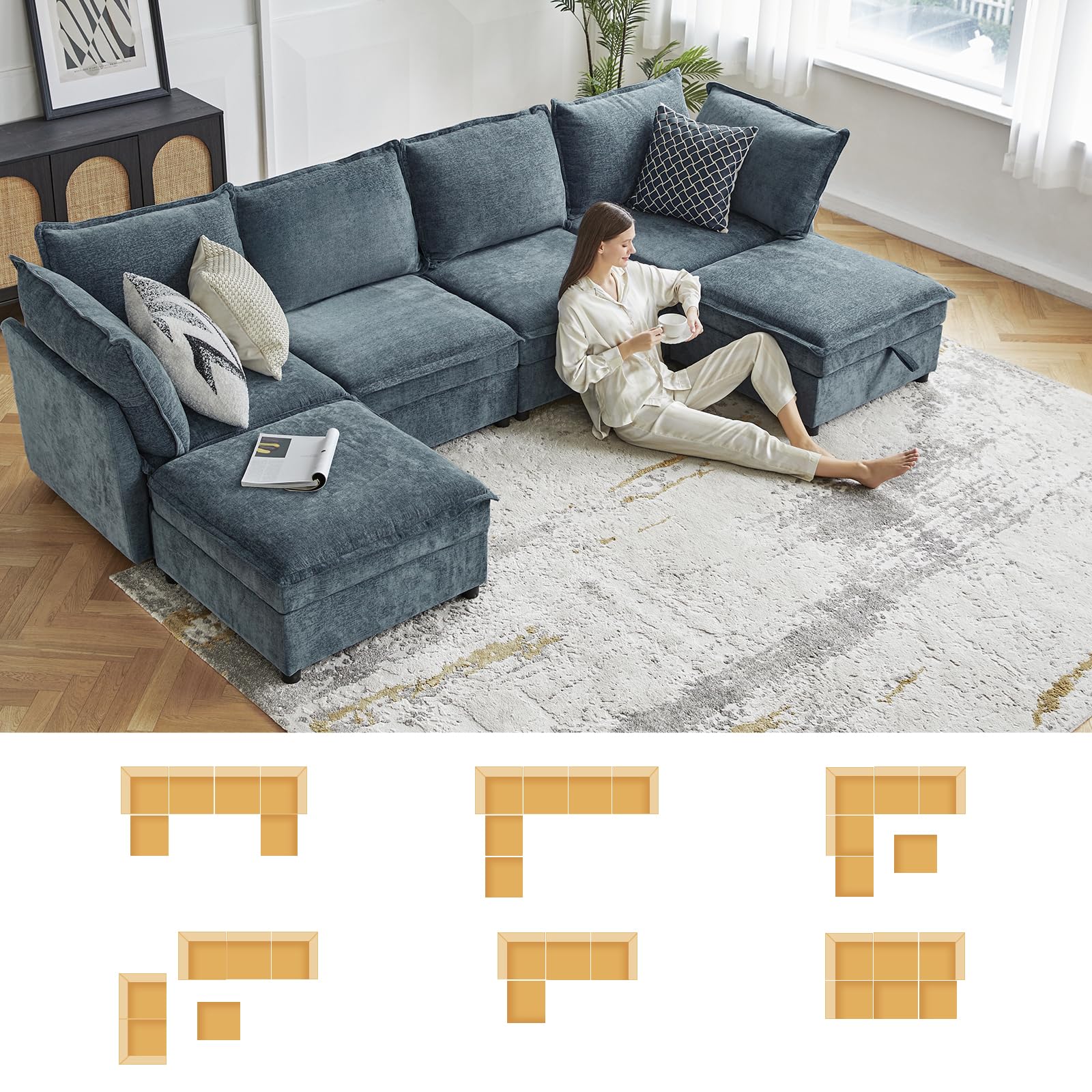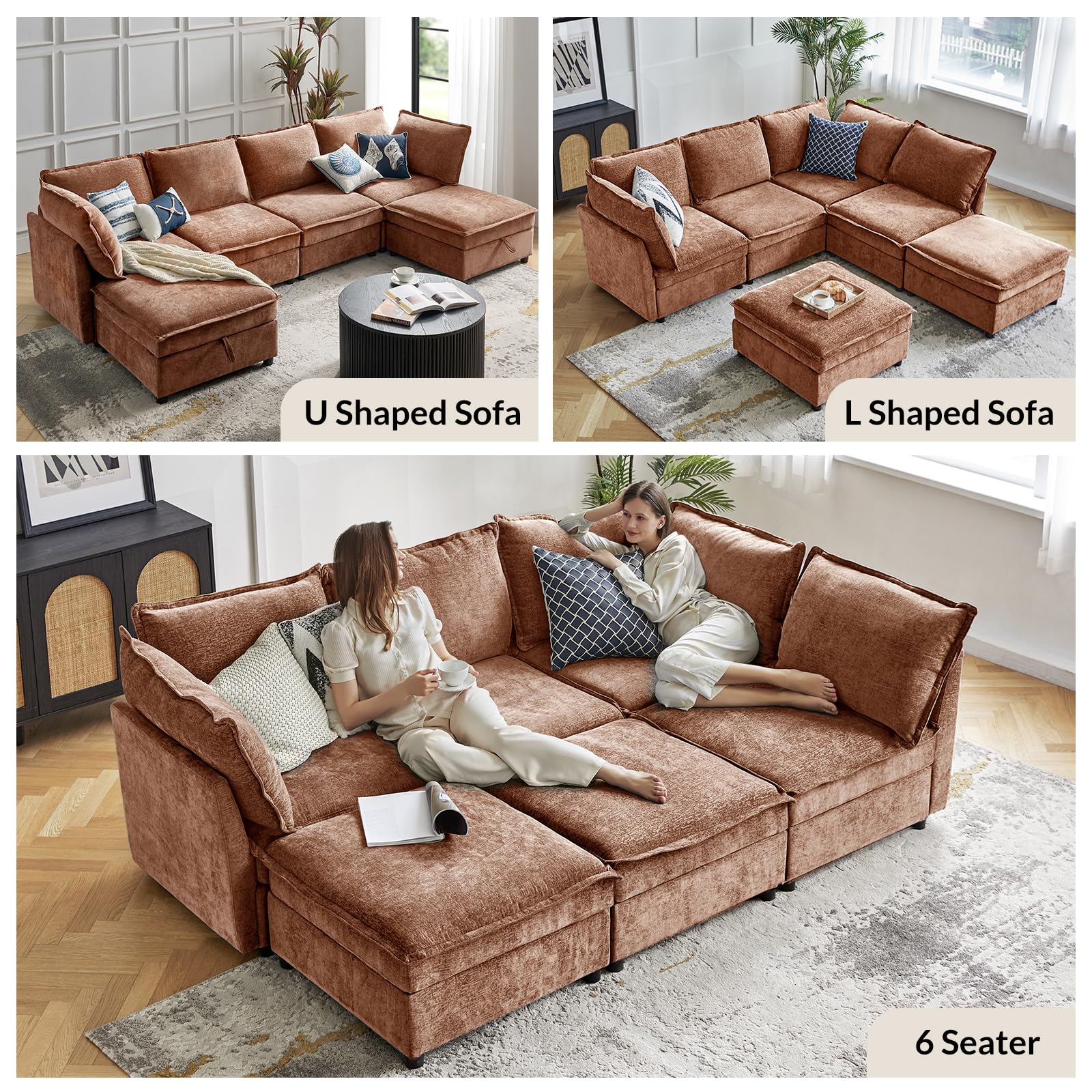 HULALA HOME 127'' Modular Sectional Sofa, Oversized U Shaped Couch with Storage Ottoman, Comfy Chenille Sofa with Deep Seat, 6 Seat Convertible Couches for Living Room, Beige