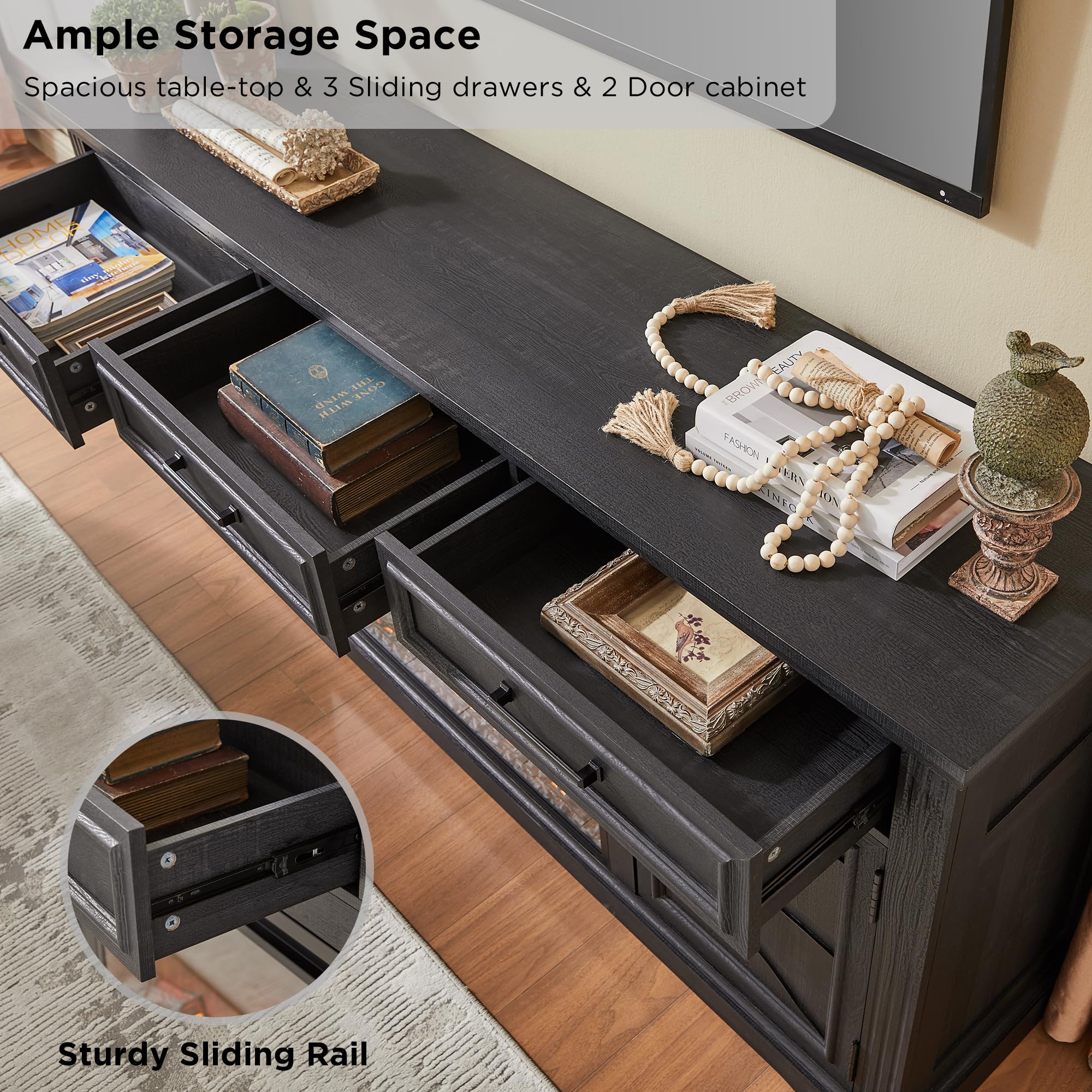 • Ample Storage Space: This TV stand features a spacious stand top, 2 storage cabinets, and 3 big drawers, providing ample space to organize and store your media accessories, remote controls, DVDs, and other decor items. Keep your entertainment area clutter-free and organized.