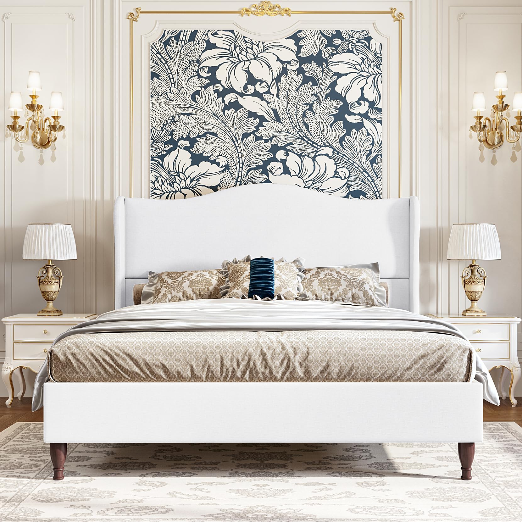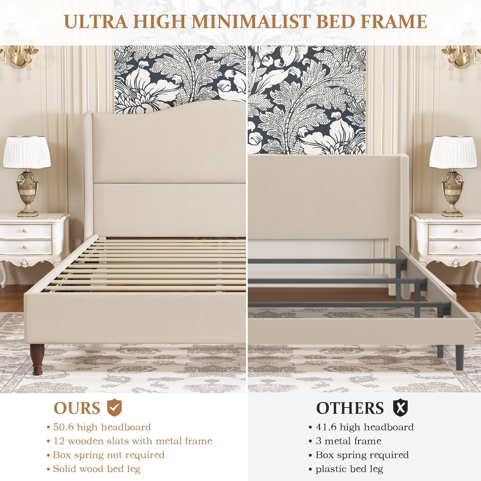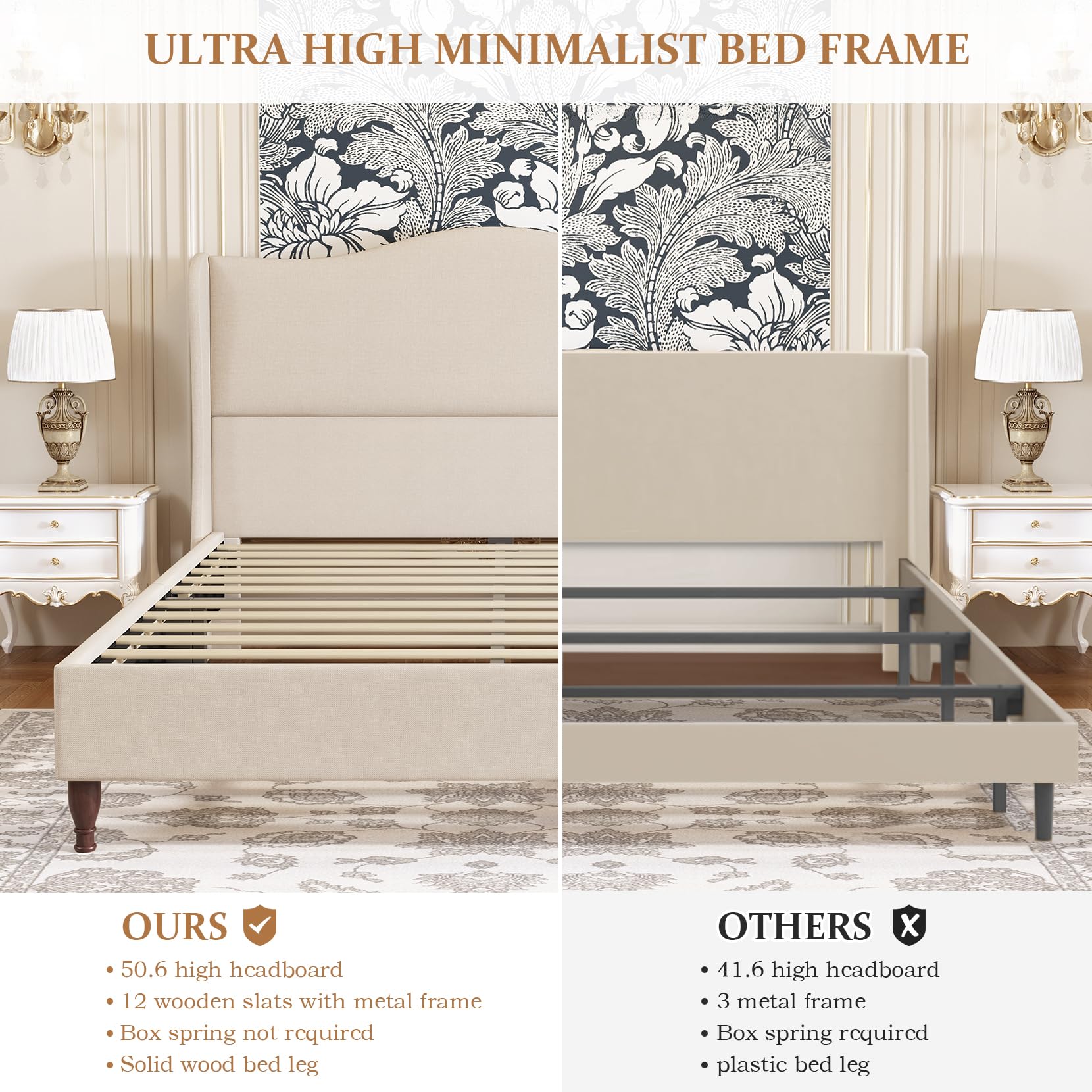koorlian King Size Bed Frame Upholstered Platform Bed with 51" Tall Headboard Wingback, Soft Fabric, Retro Simple Style Platform Bed No Box Spring Needed, Easy Assembly, Beige