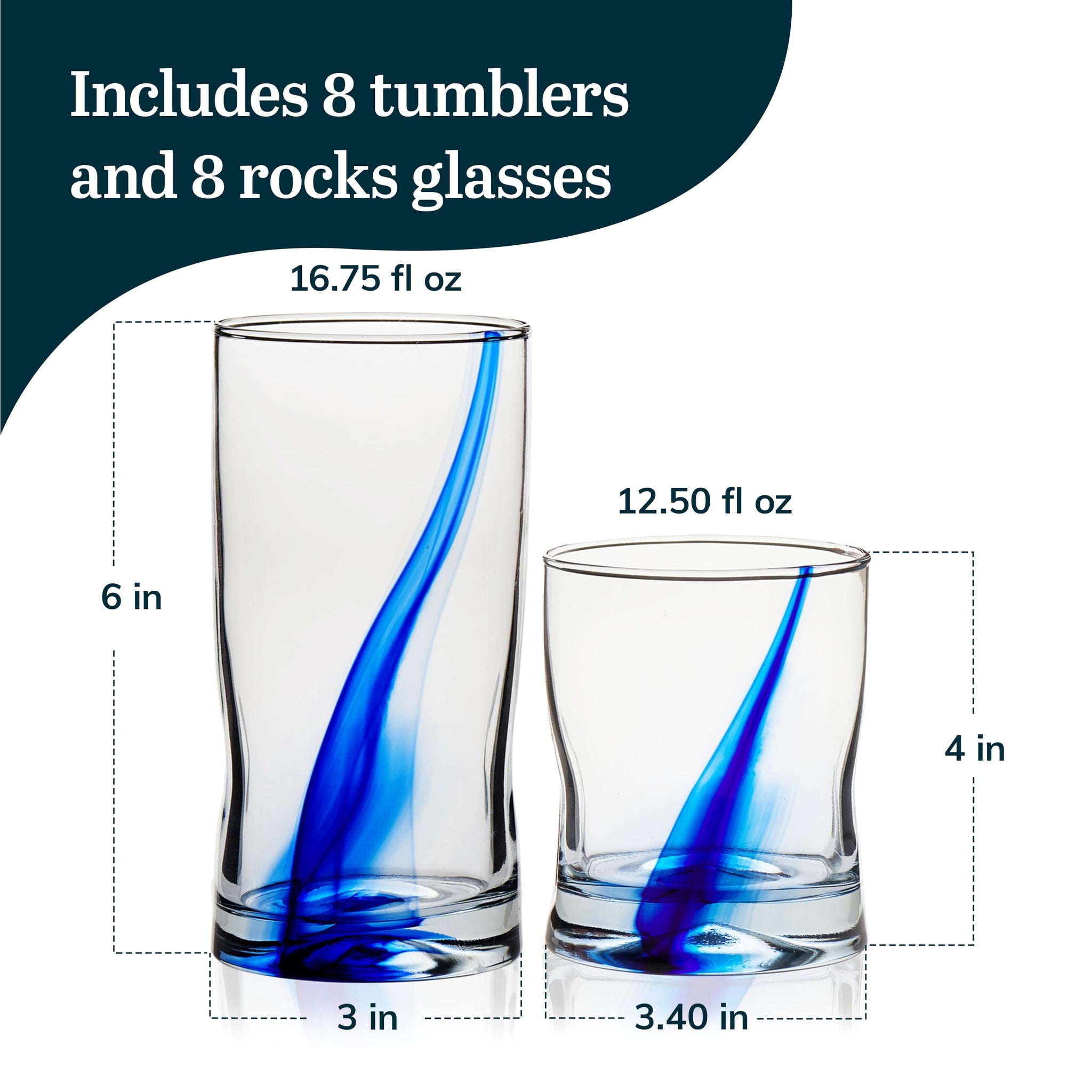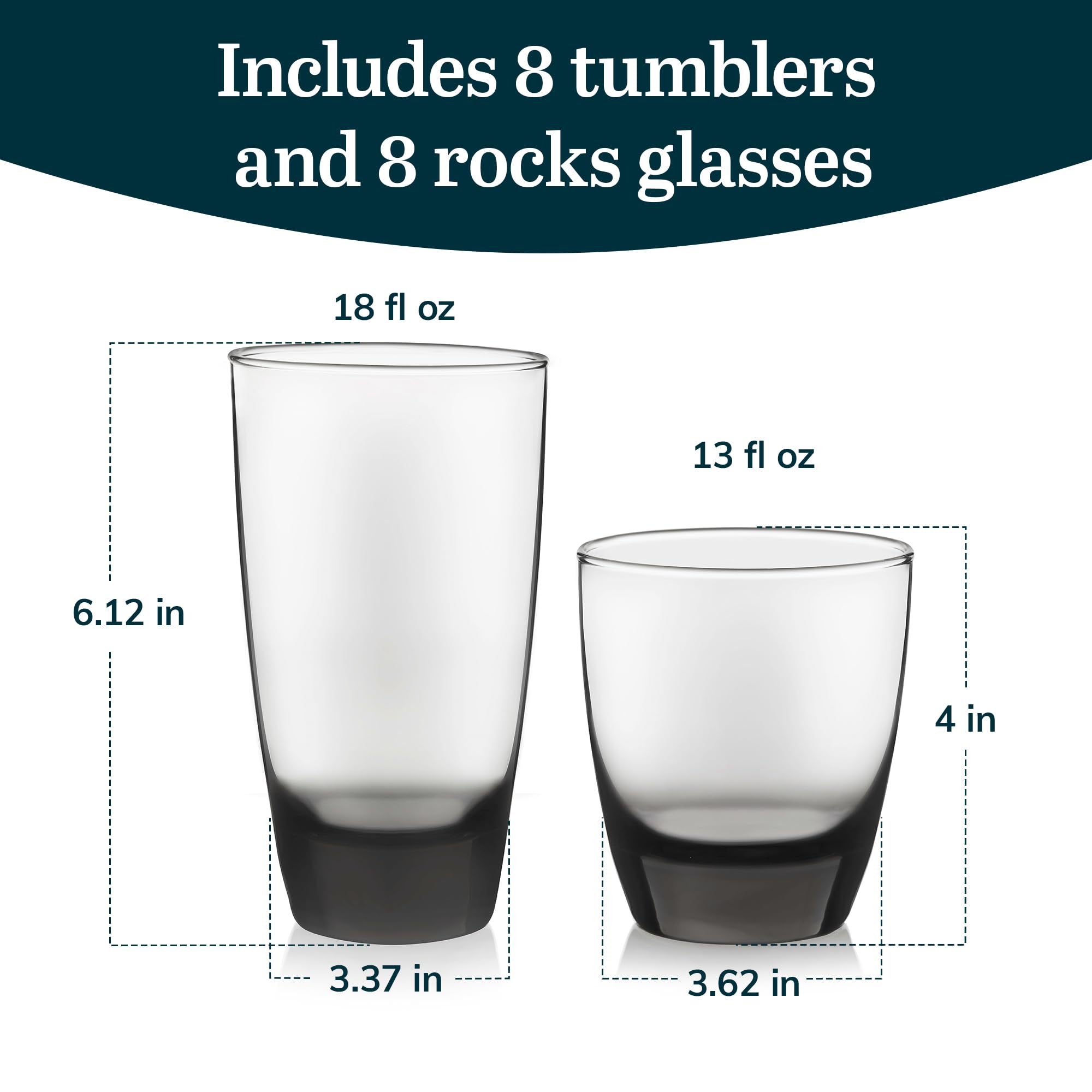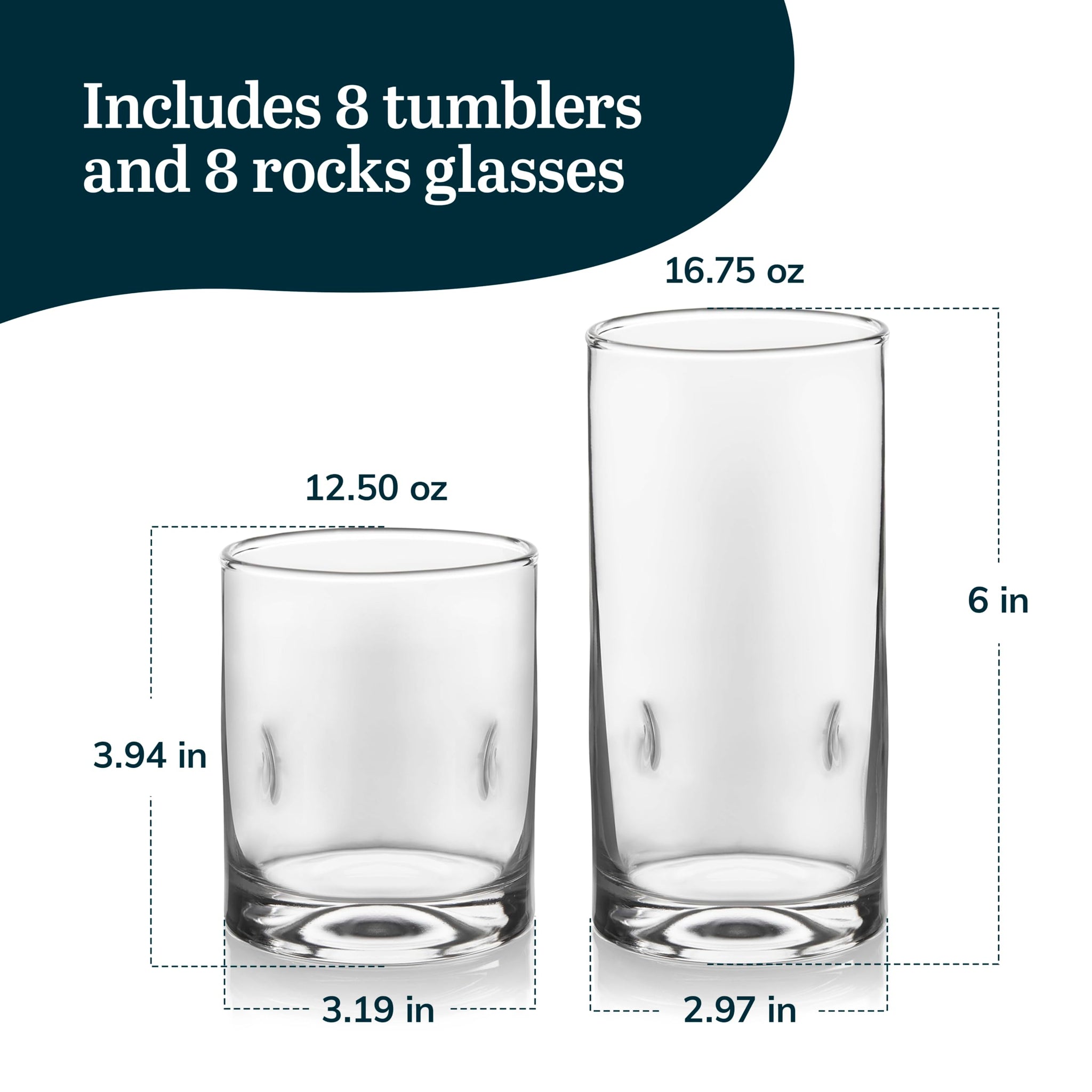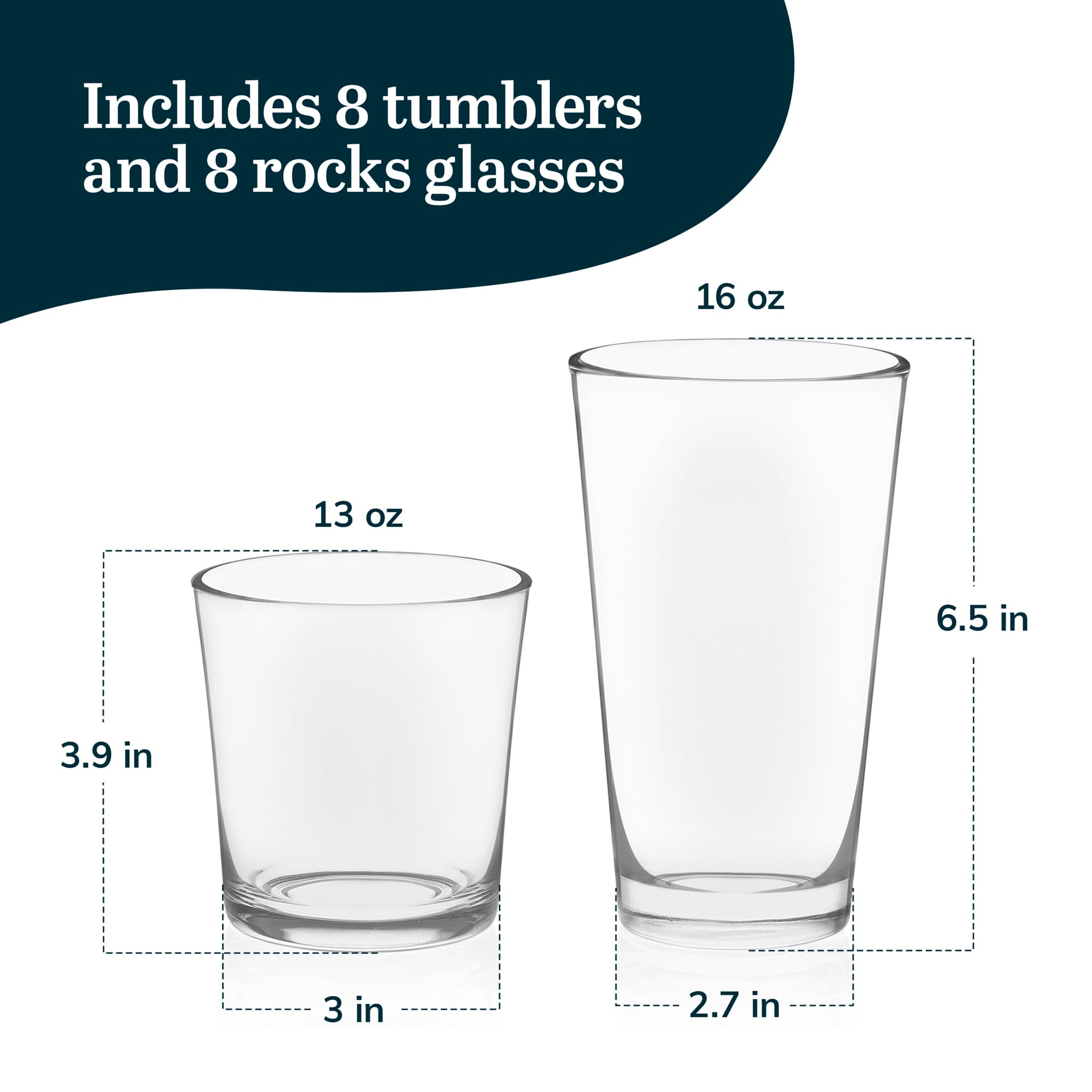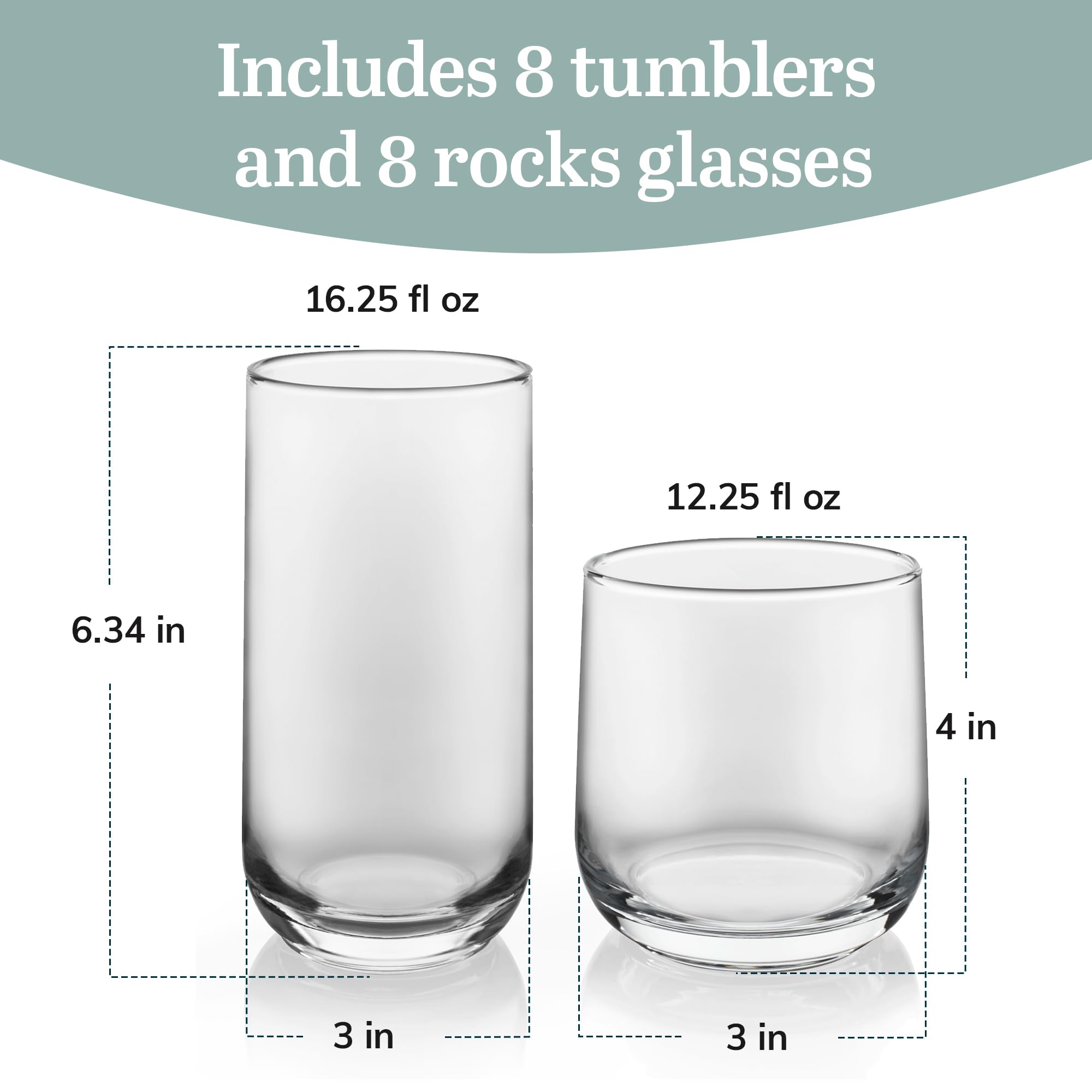 • Tumbler and Rocks Glass Set: Level up your hosting game with the perfect balance and elegance of our everyday glasses drinking set – this set of glasses includes eight 16 oz tumbler glasses and eight 13.3 oz rocks glasses