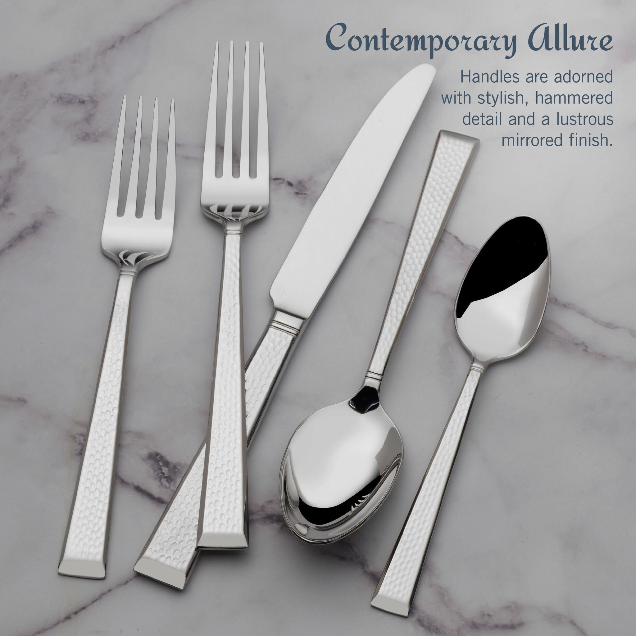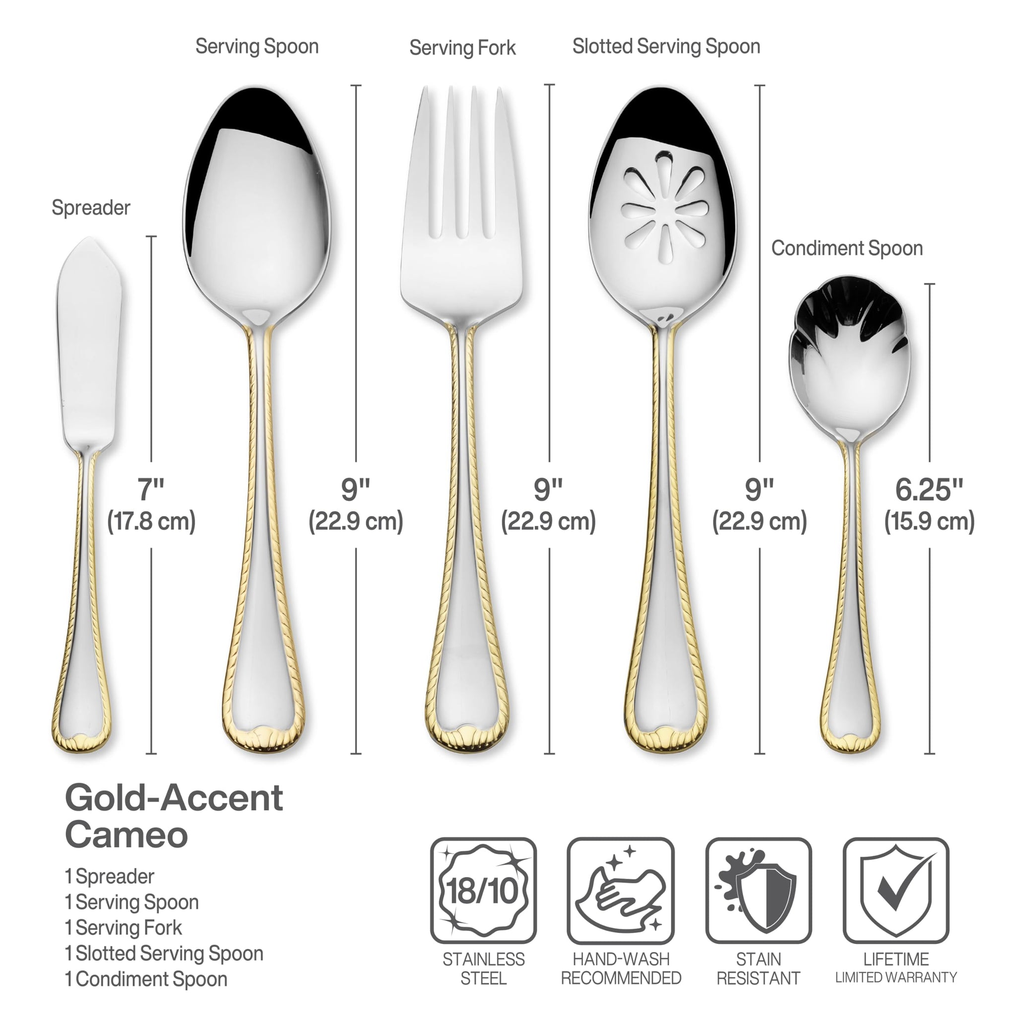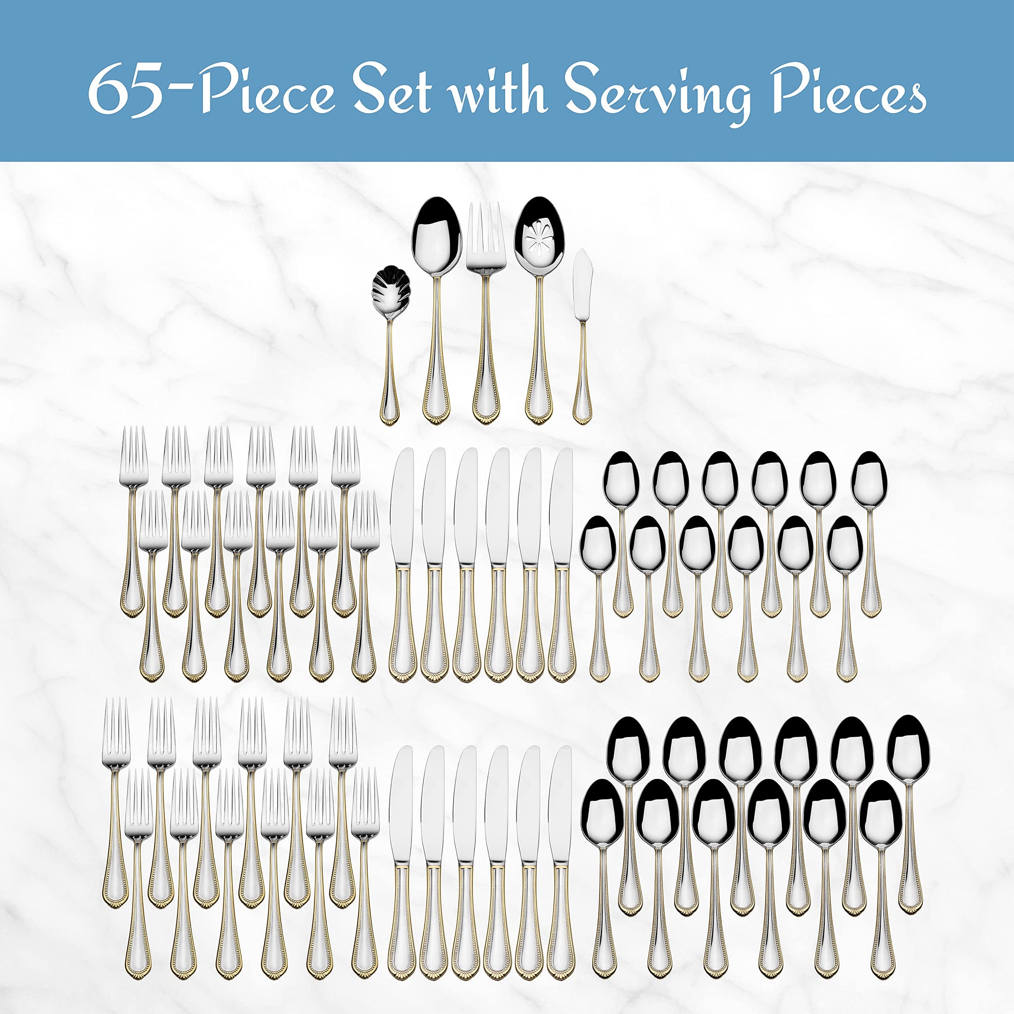 • 65-PIECE SET: includes 12 each of dinner fork, salad fork, dinner knife, dinner spoon, and teaspoon, plus 1 each of serving tablespoon, pierced tablespoon, cold meat fork, butter knife, and sugar spoon