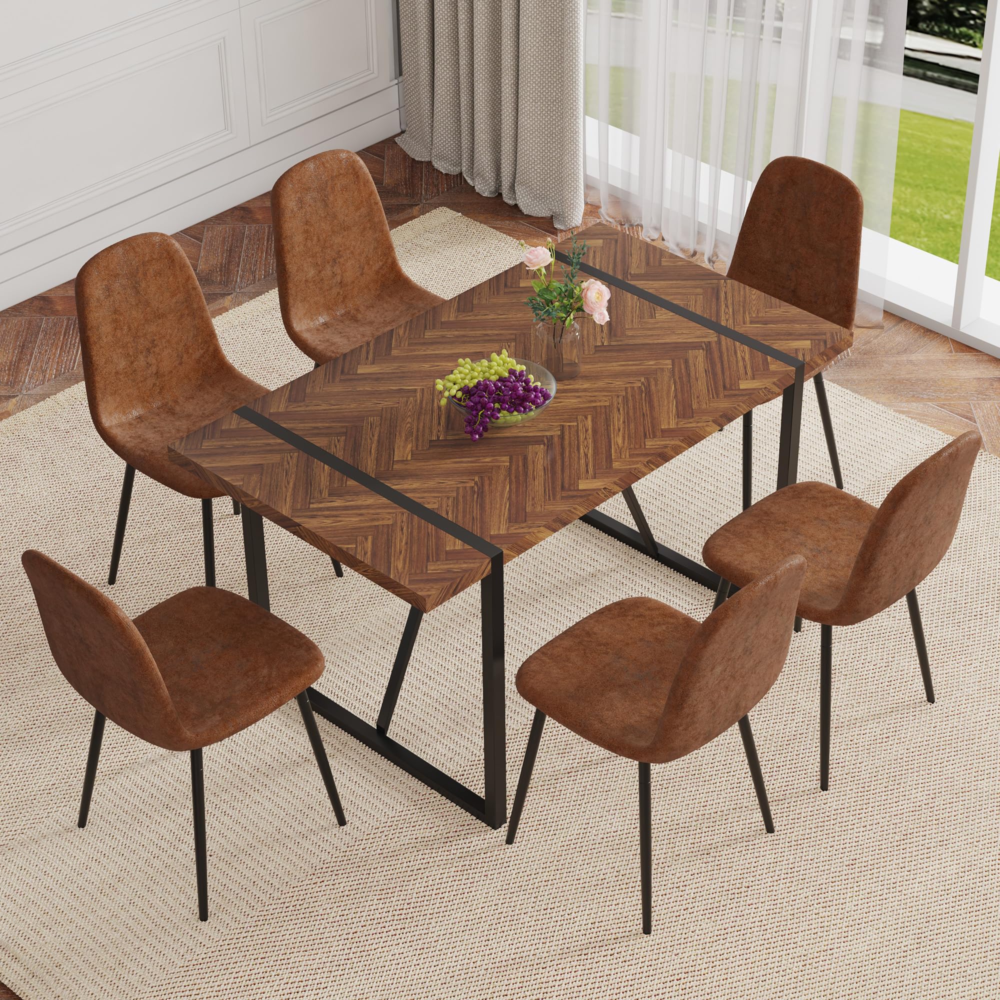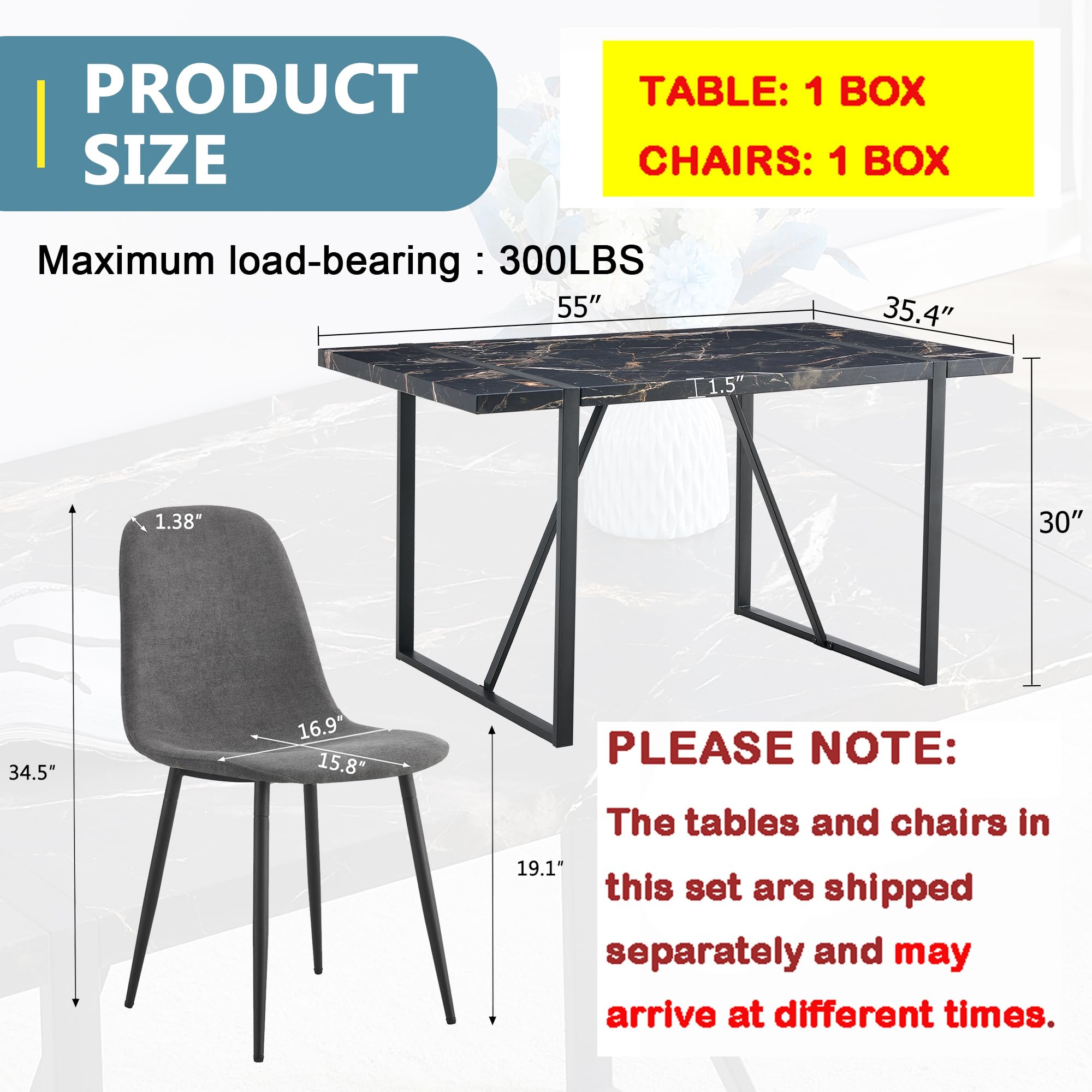 Space-Saving Design: Table Size: 55''(W)*31.4''(D)*29.9''(H) Chair Size: 16.90''(D) x 15.80''(W) x 34.50''(H). Perfect for cozy dining spaces, this set is designed to maximize your room's potential without sacrificing style or functionality. It comfortably seats four, making it ideal for family dinners or gatherings with friends