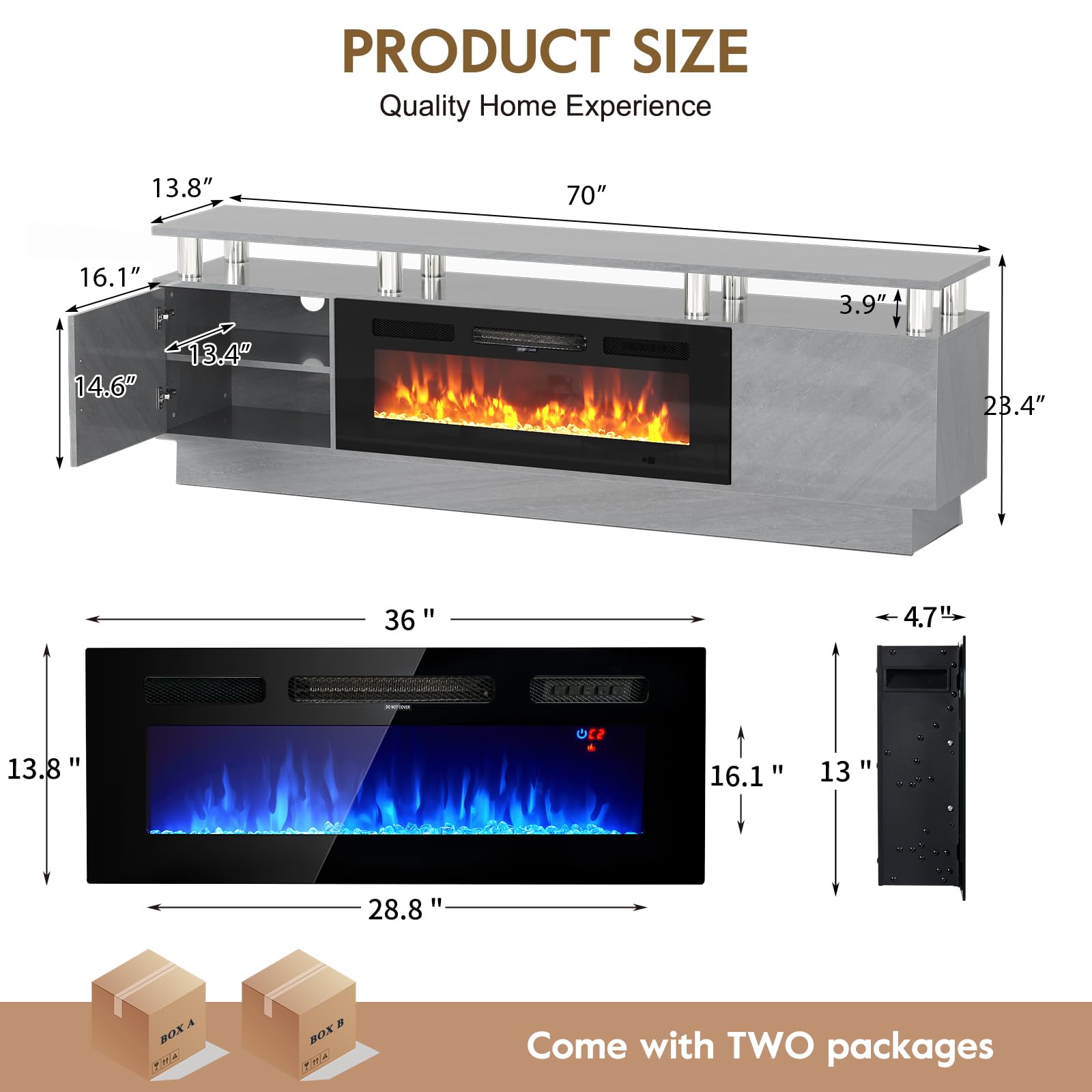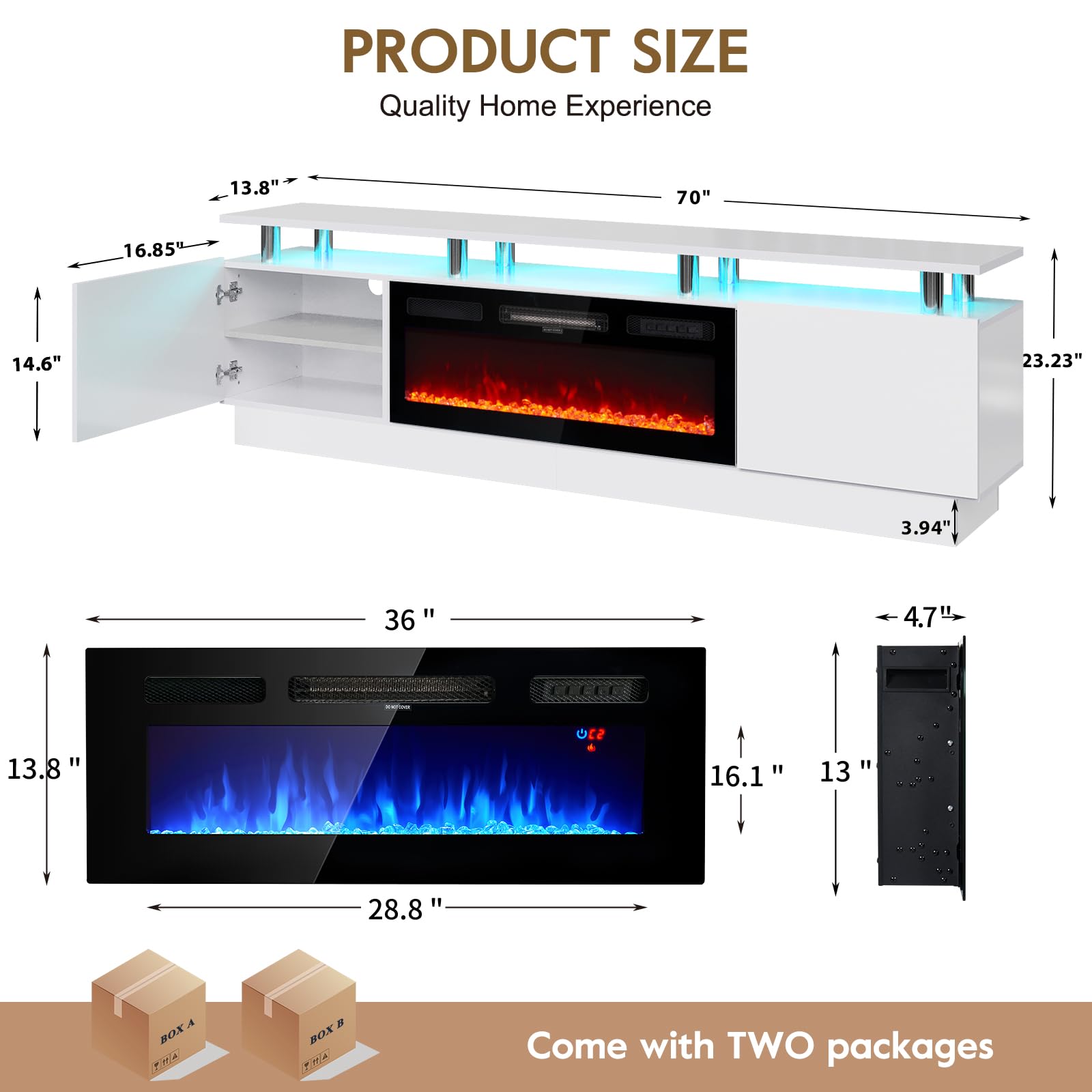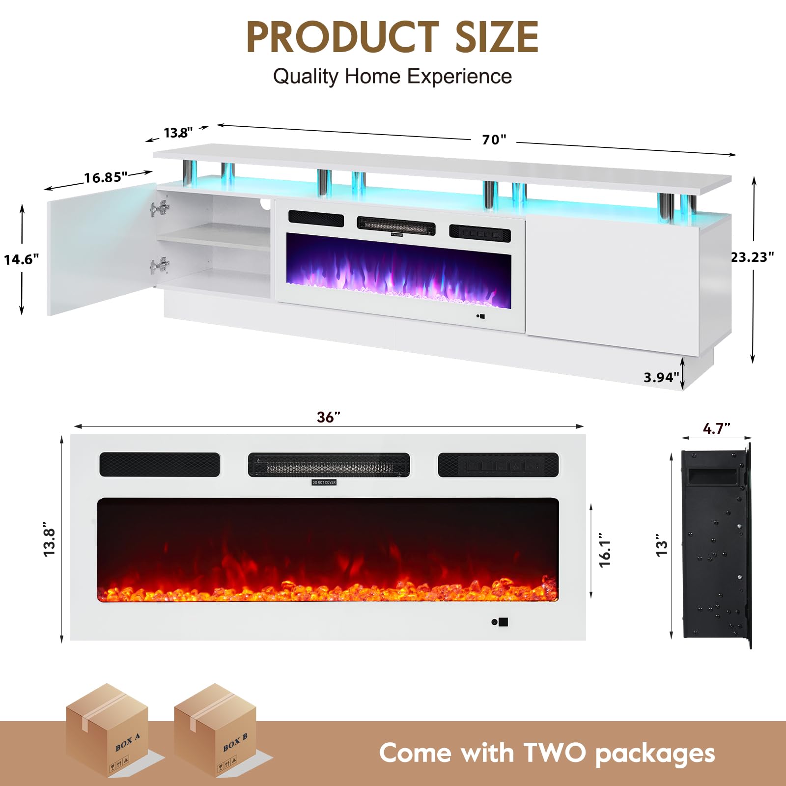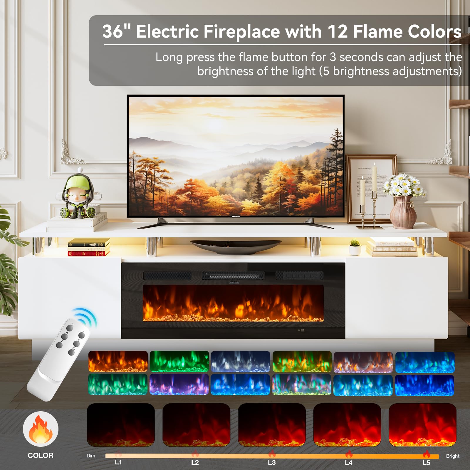 • TV Stand with 36" Fireplace: 70"L stand integrates 12-color electric fireplace with 5 dimmer levels & 36 LED color combos for a customizable viewing & heating experience.
