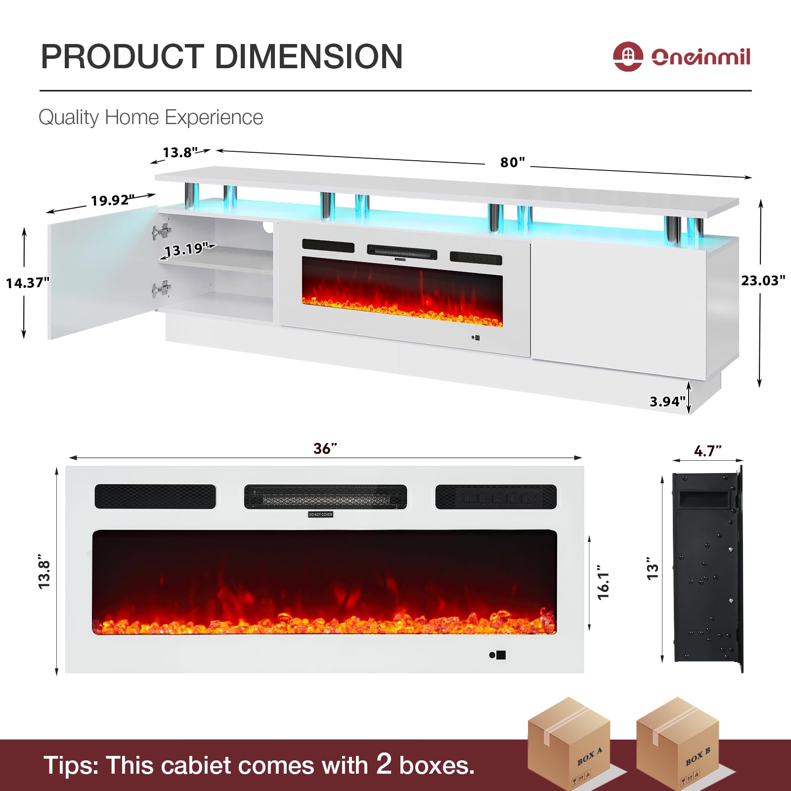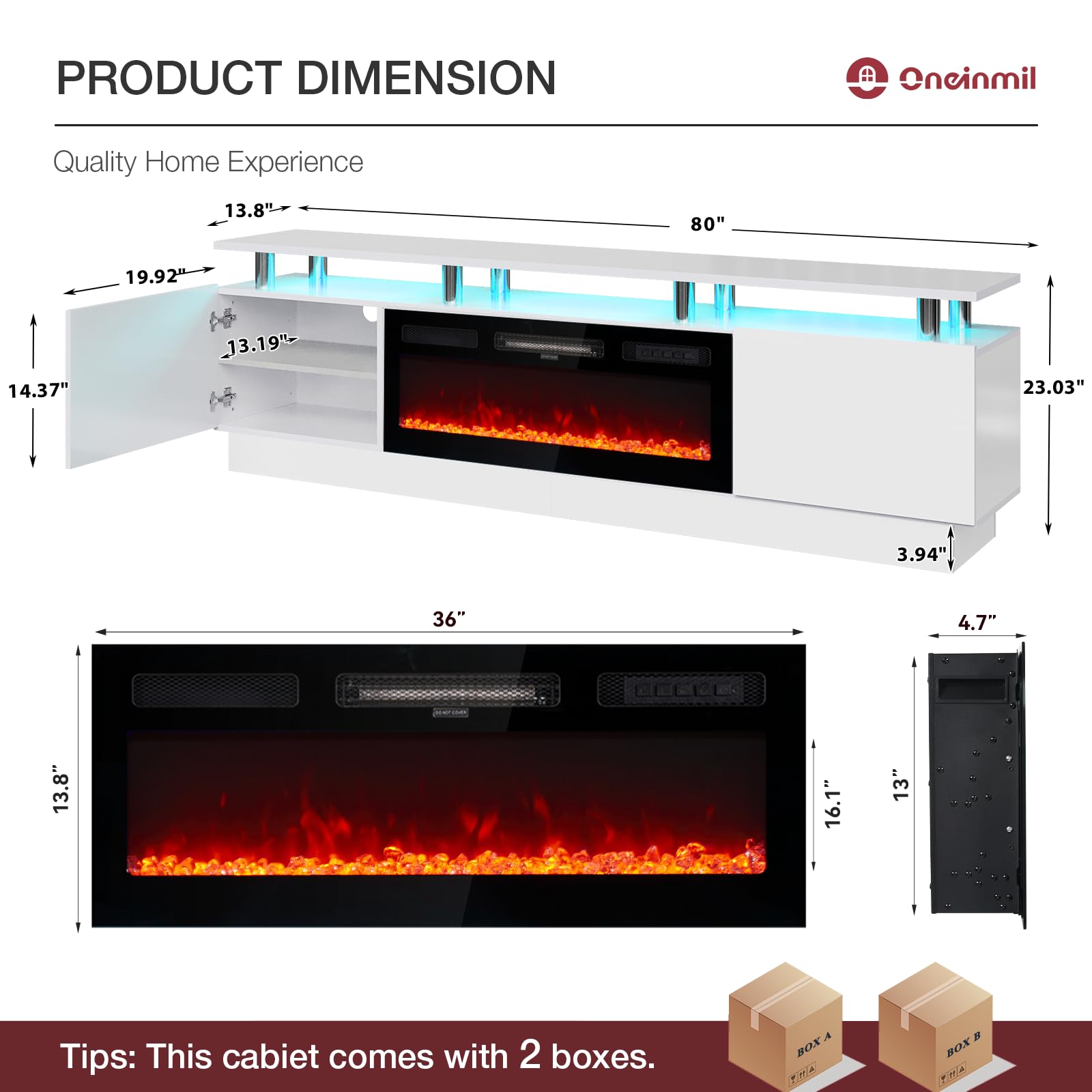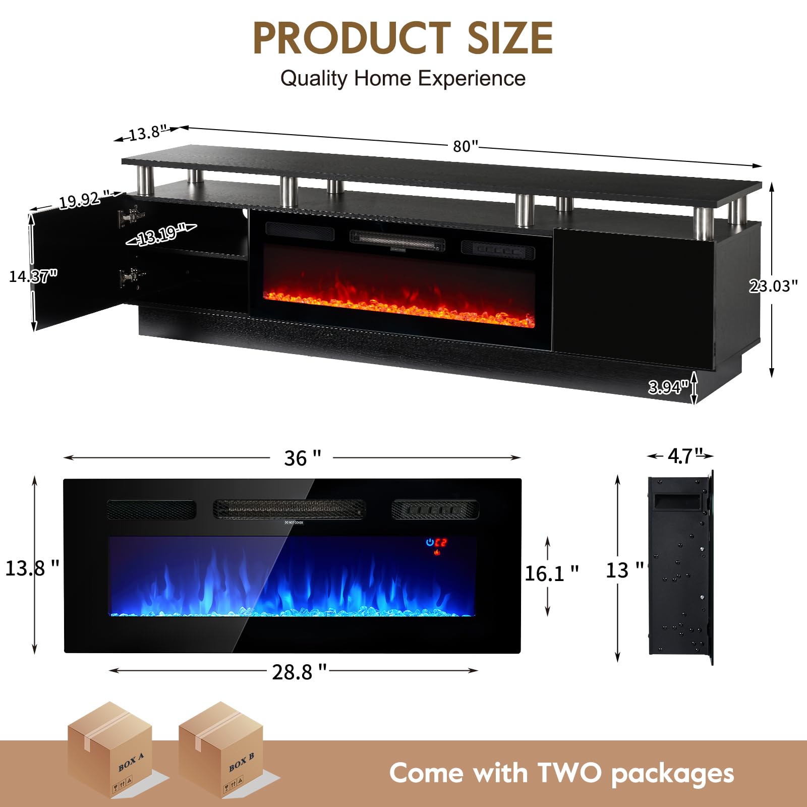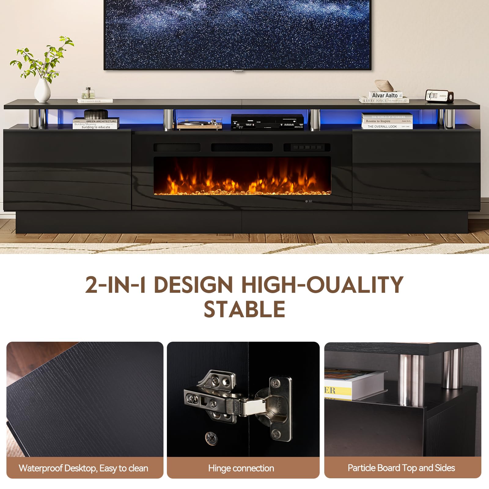 • TV Stand with 36" Fireplace: 70"L stand integrates 12-color electric fireplace with 5 dimmer levels & 36 LED color combos for a customizable viewing & heating experience.