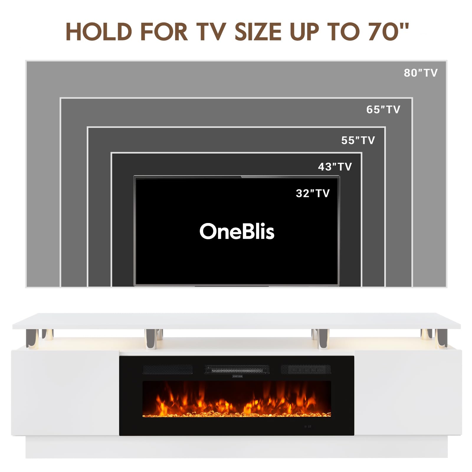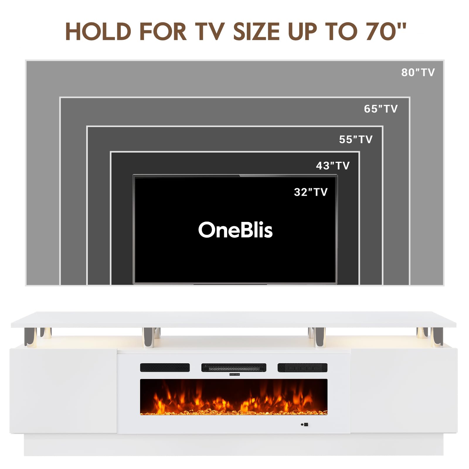 OneBlis 70" TV Stand for Living Room, Modern Entertainment Center & Media Console, Fits TVs up to 80", Storage Cabinet with Shelves, 36" Electric Fireplace with LED Flame (All Black)