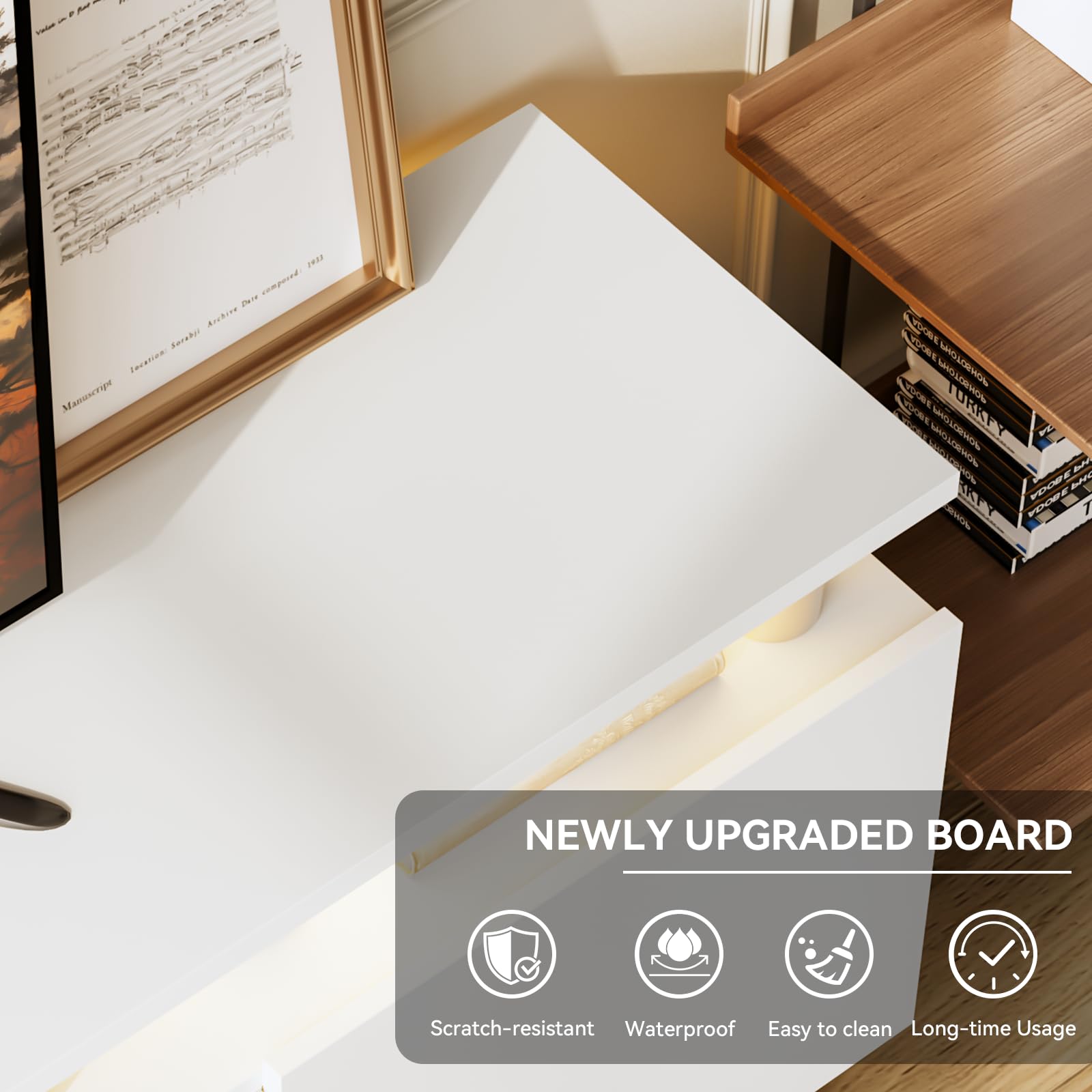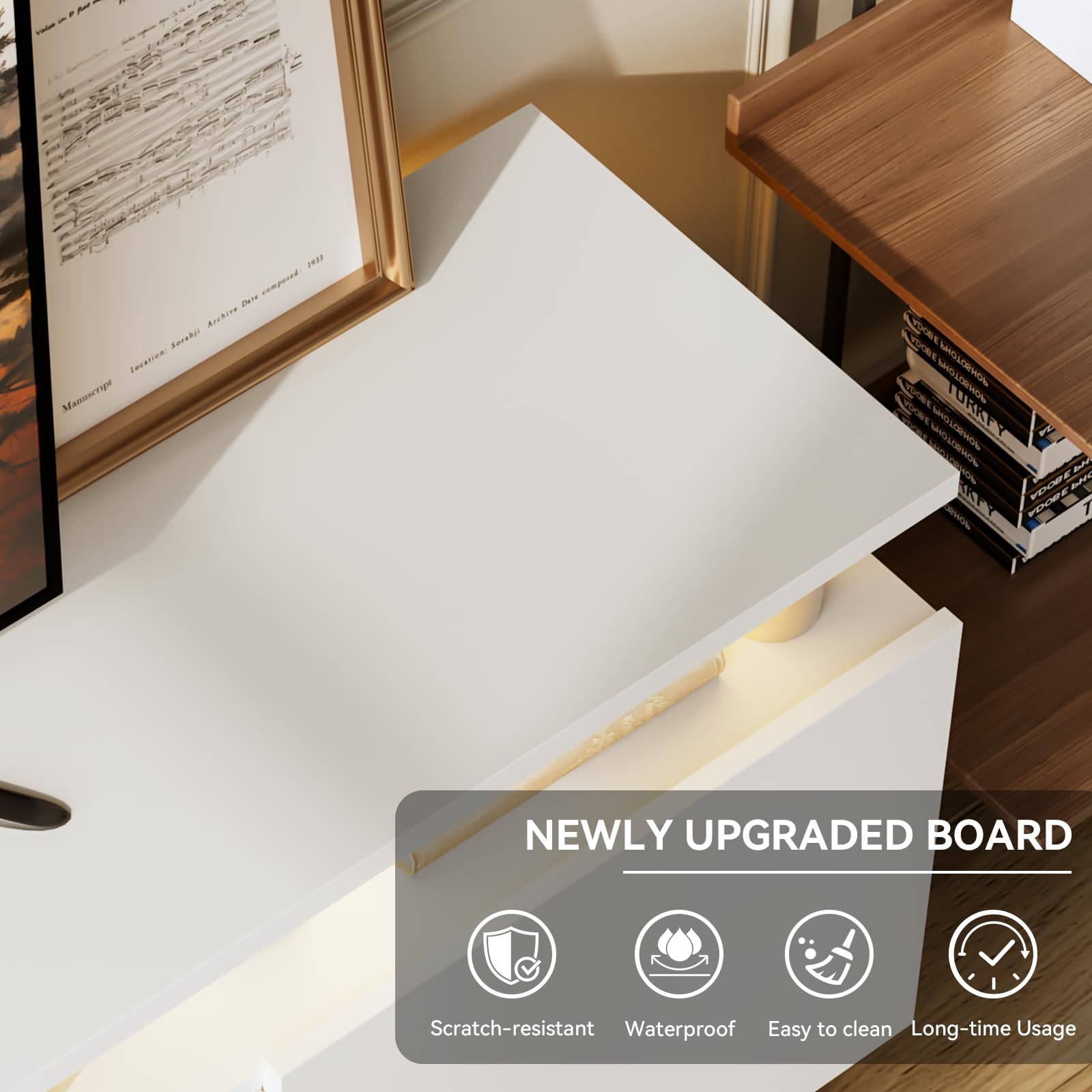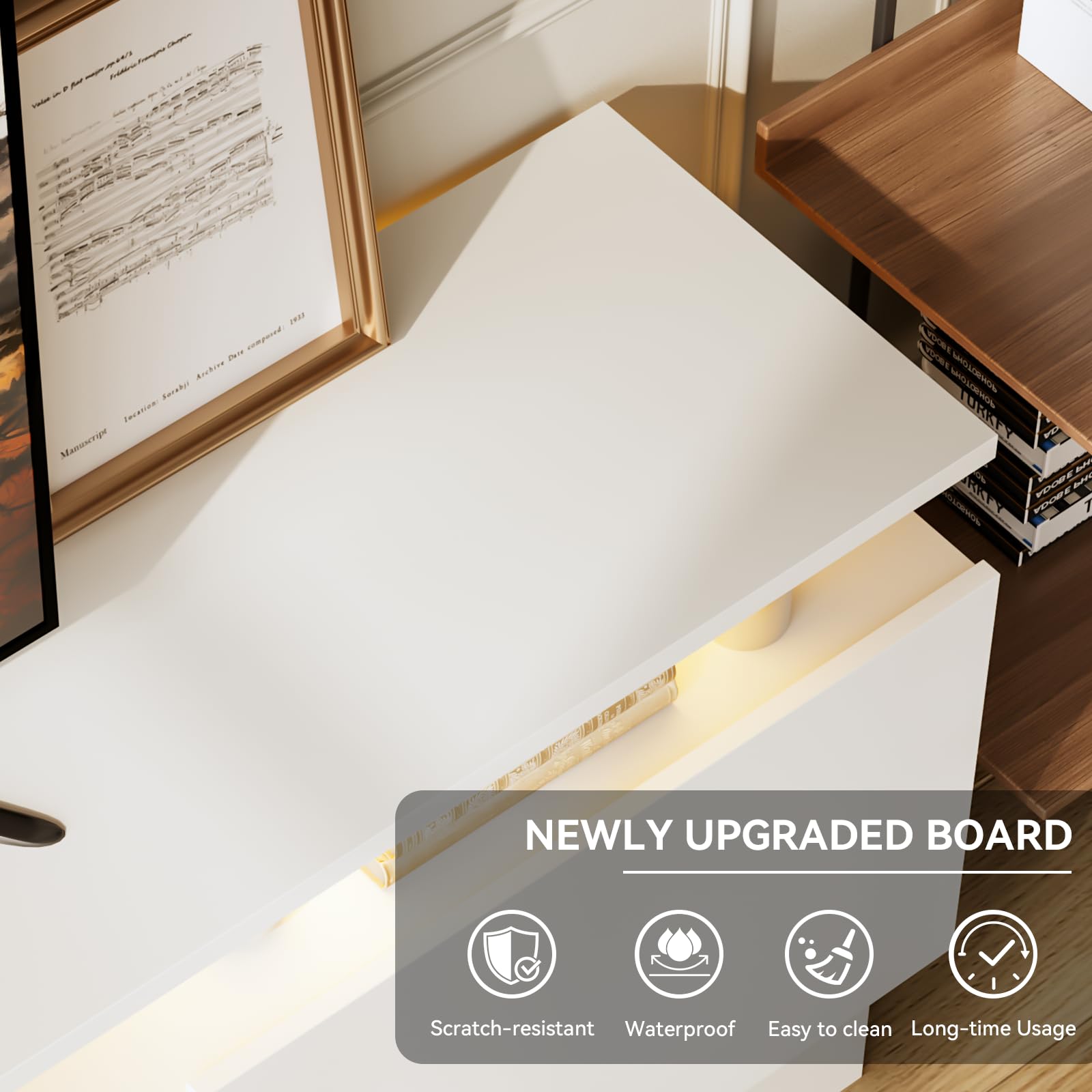 • Ample Storage & Cable Management: Double-layer cabinets offer space for entertainment gear, while cable holes keep wires organized for a cleaner look.