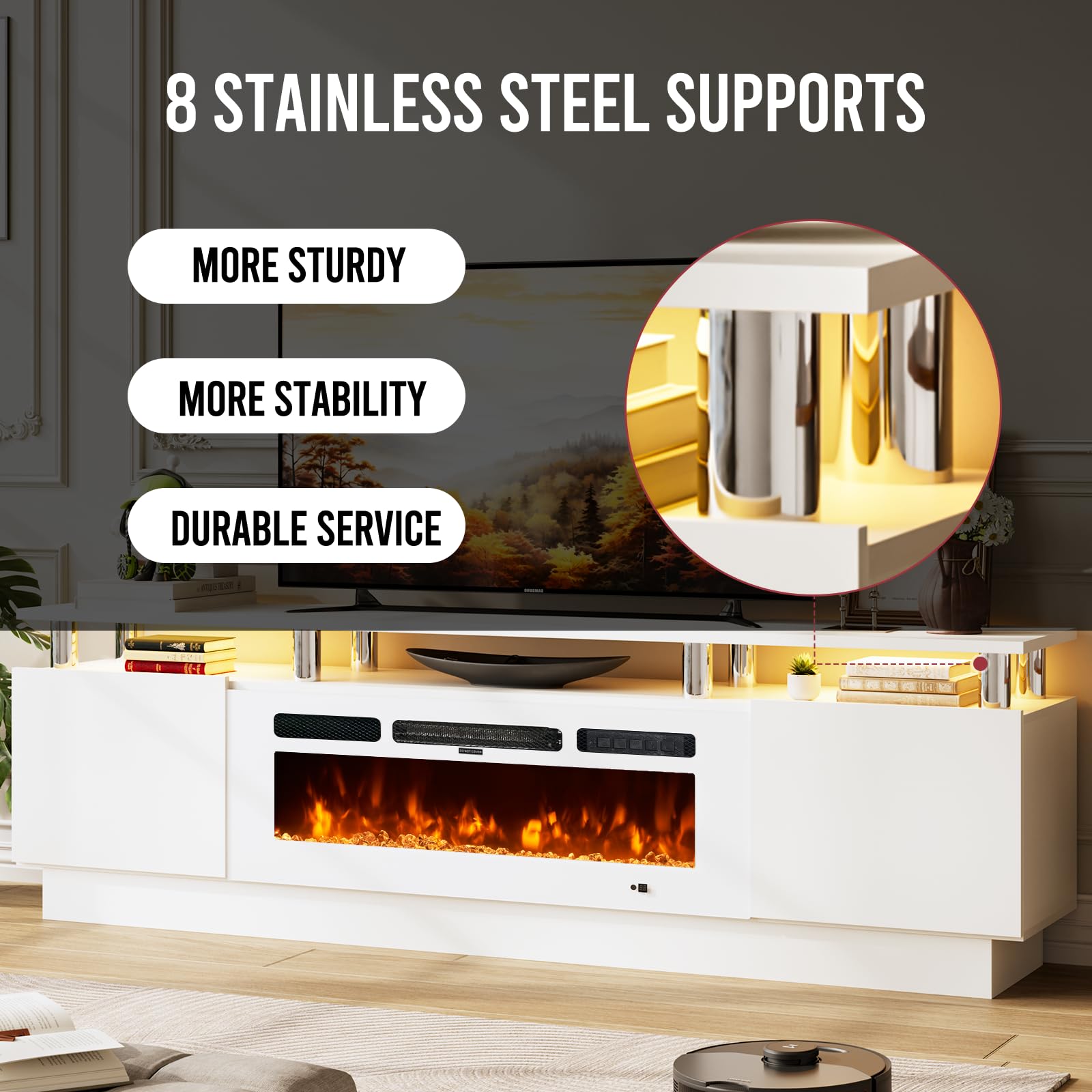 • Sturdy Stainless Steel Supports: 8 heat-resistant columns ensure long-lasting durability & stability, perfect for TV support & storage.