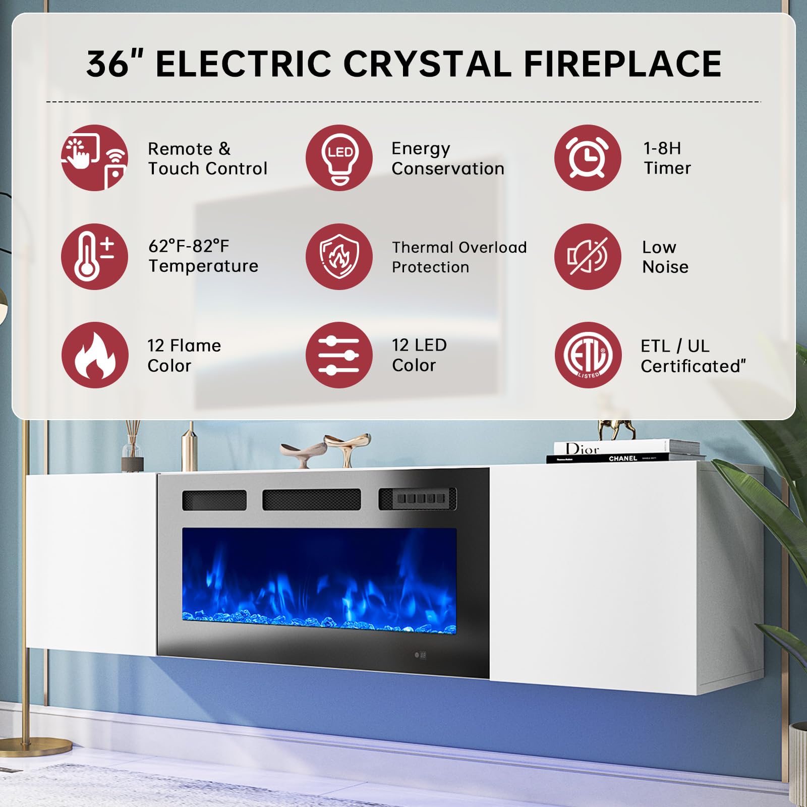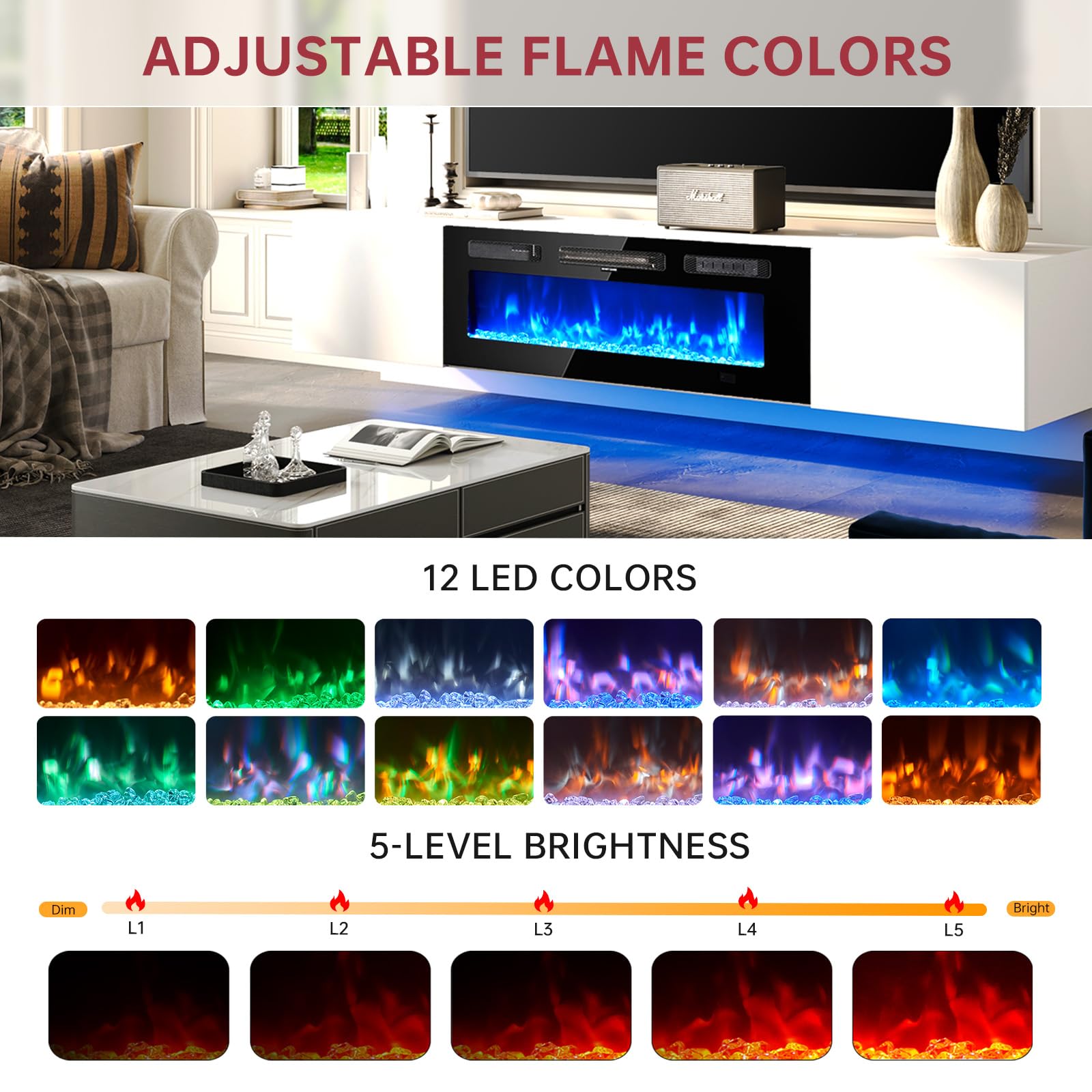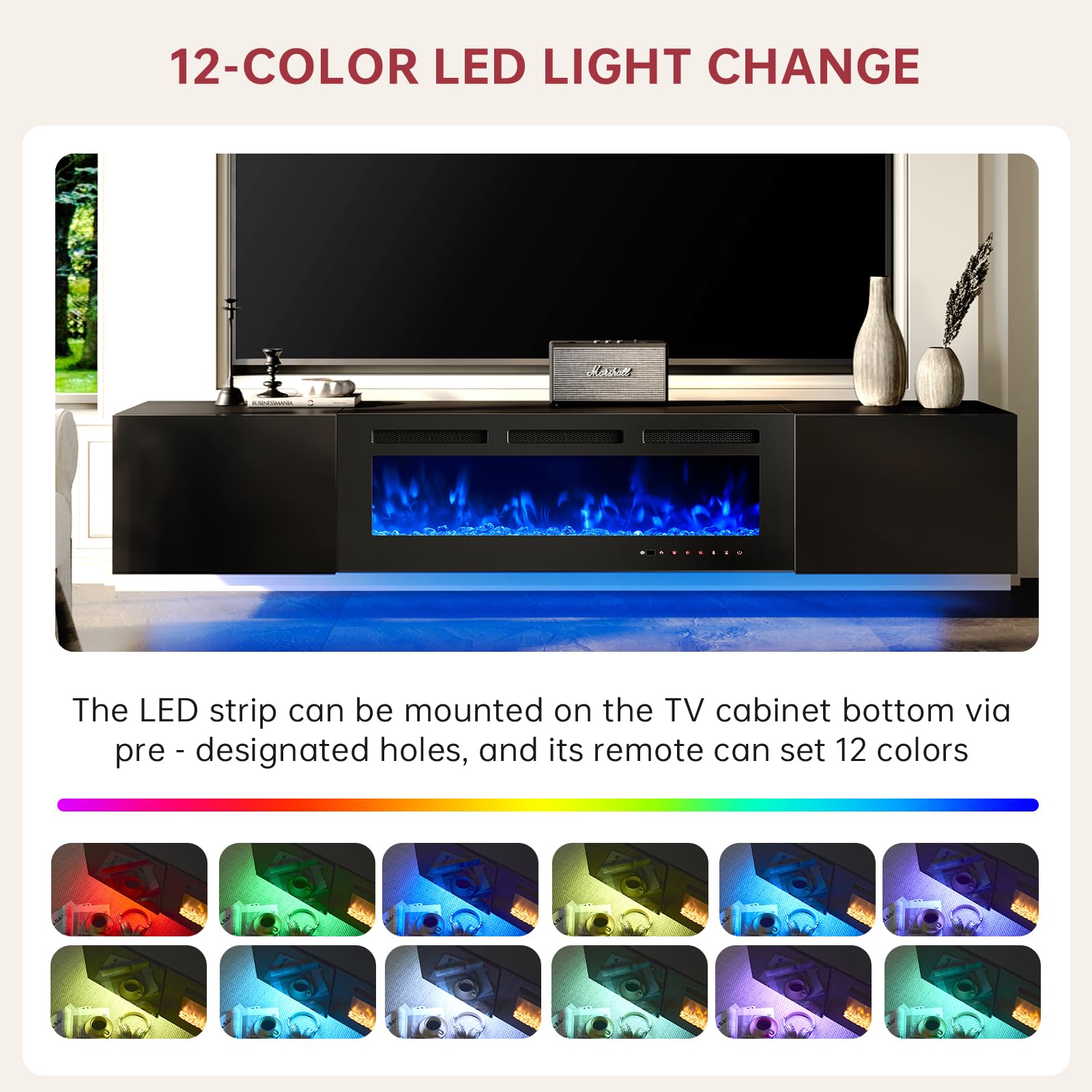 • TV Stand with Electric Fireplace: With 12 colors of backlight and 12 LED colors of light strips, users are able to create various ambience according to different needs. Besides, it allows you to adjust the temperature from 62°F to 82°F and the time setting is from 0 to 8 hours with the remote control. The 36 inch size fireplace with realistic crystal stones can offer 5 levels of flame brightness and 12 flame colors, creating a stunning visual effect and keep you warm