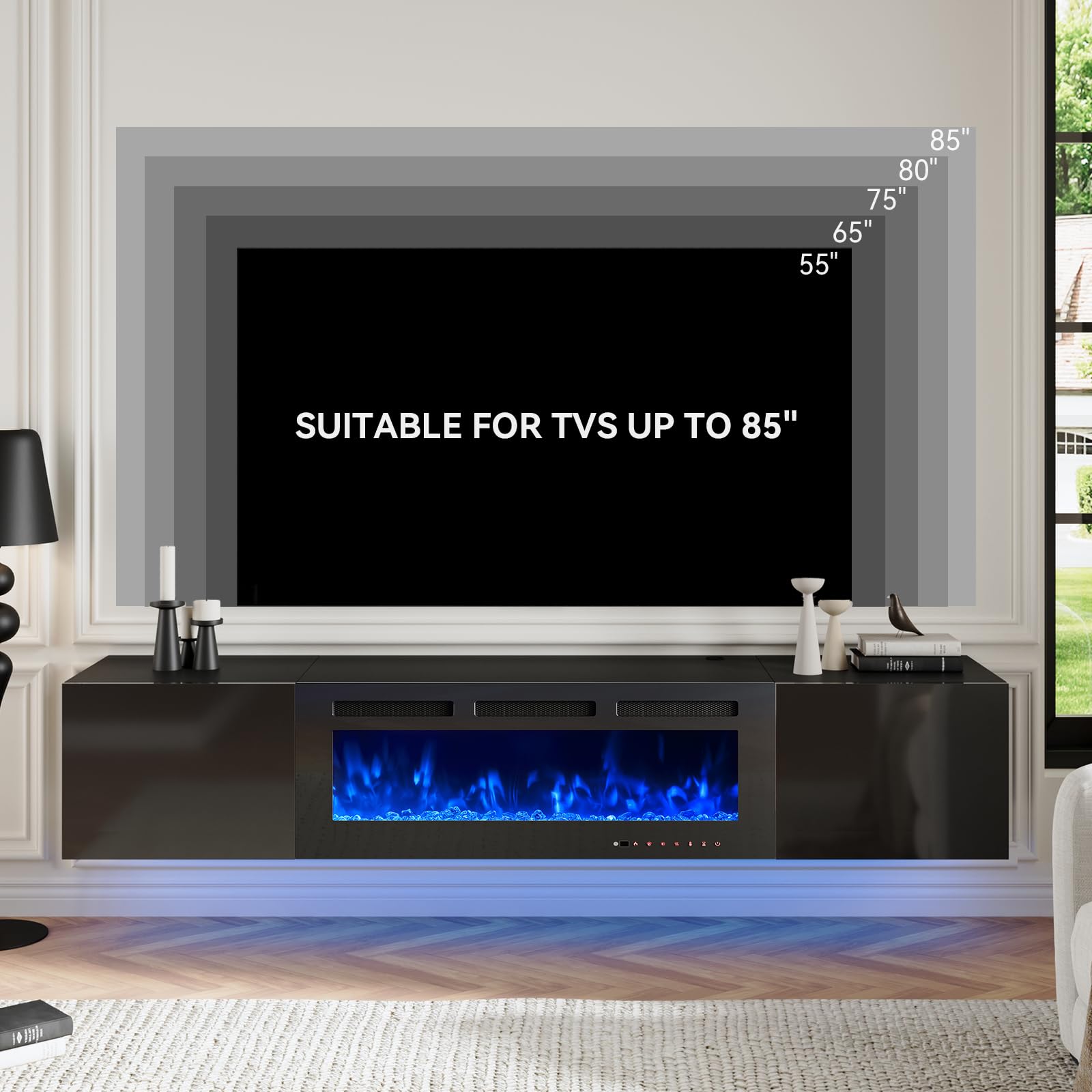 oneinmil 70" Floating TV Stand with 36" Electric Fireplace, Wall Mounted Fireplace Entertainment Center with Storage, Fire Place TV Console for Living Room, All Black