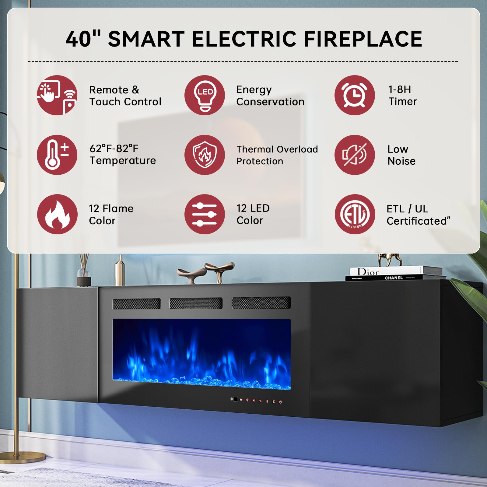 • Unique Floating Design: The TV stand with fireplace is characterized by its suspended design, which creates a modern and sleek appearance in a room. It typically mounts directly on the wall without visible legs, offering a clean and minimalist look. The black piece of furniture can elevate the aesthetic of any object or space, lending a sense of elegance and refinement