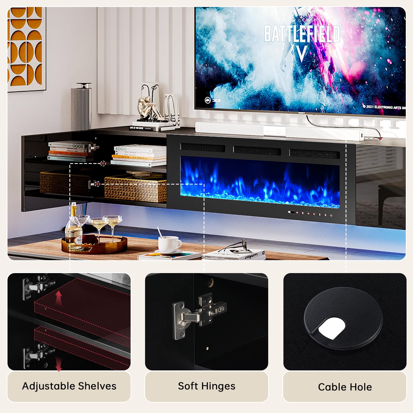 • Ample Storage Space: The fireplace TV stand has 2 closed cabinets with adjustable shelves of each, providing much convenience for storage and offering ample storage for media devices, gaming consoles, DVDs, and accessories. It includes cable holes to maintain organization and tidiness. Dimensions: 70"L x 14.2" W x 14.2"H