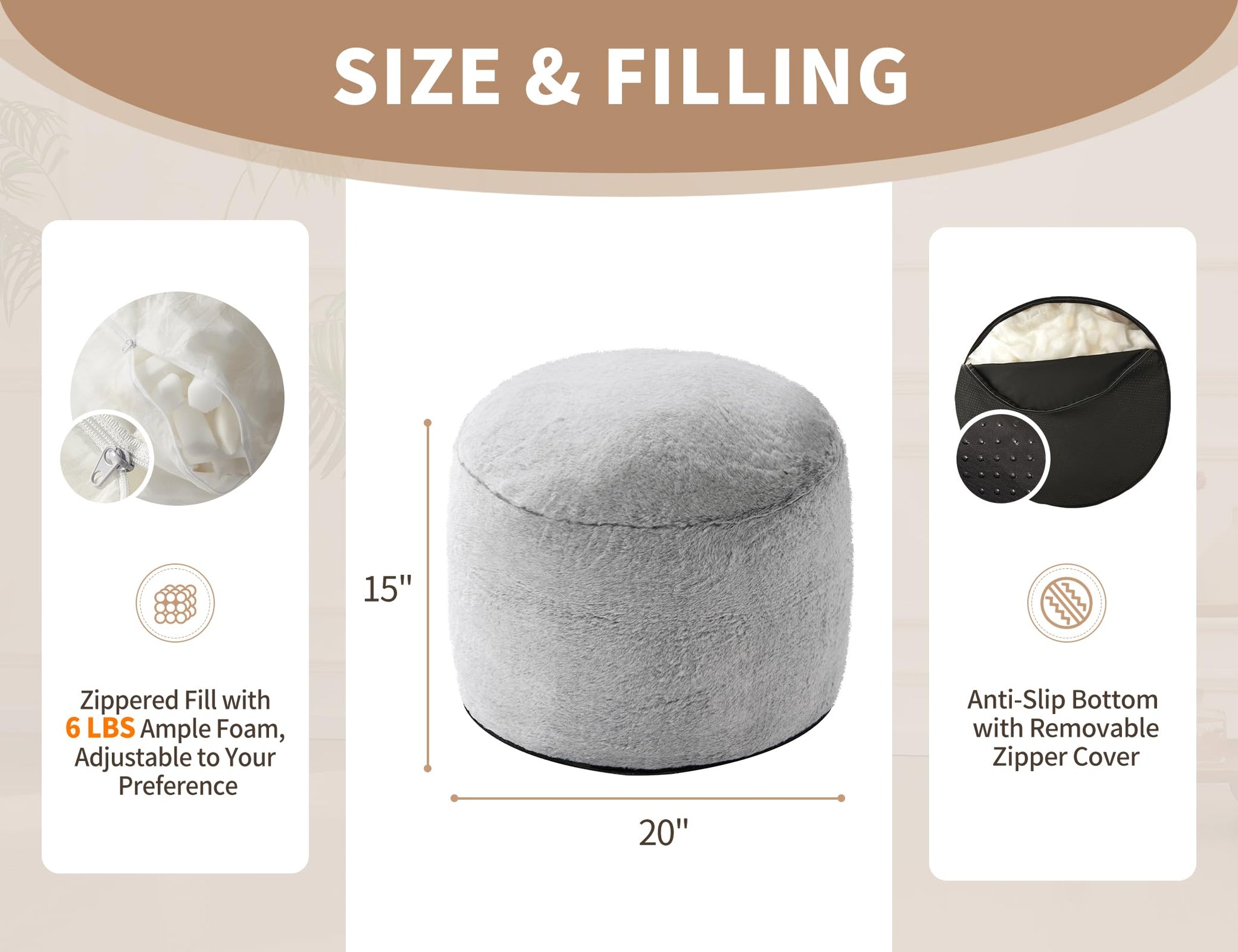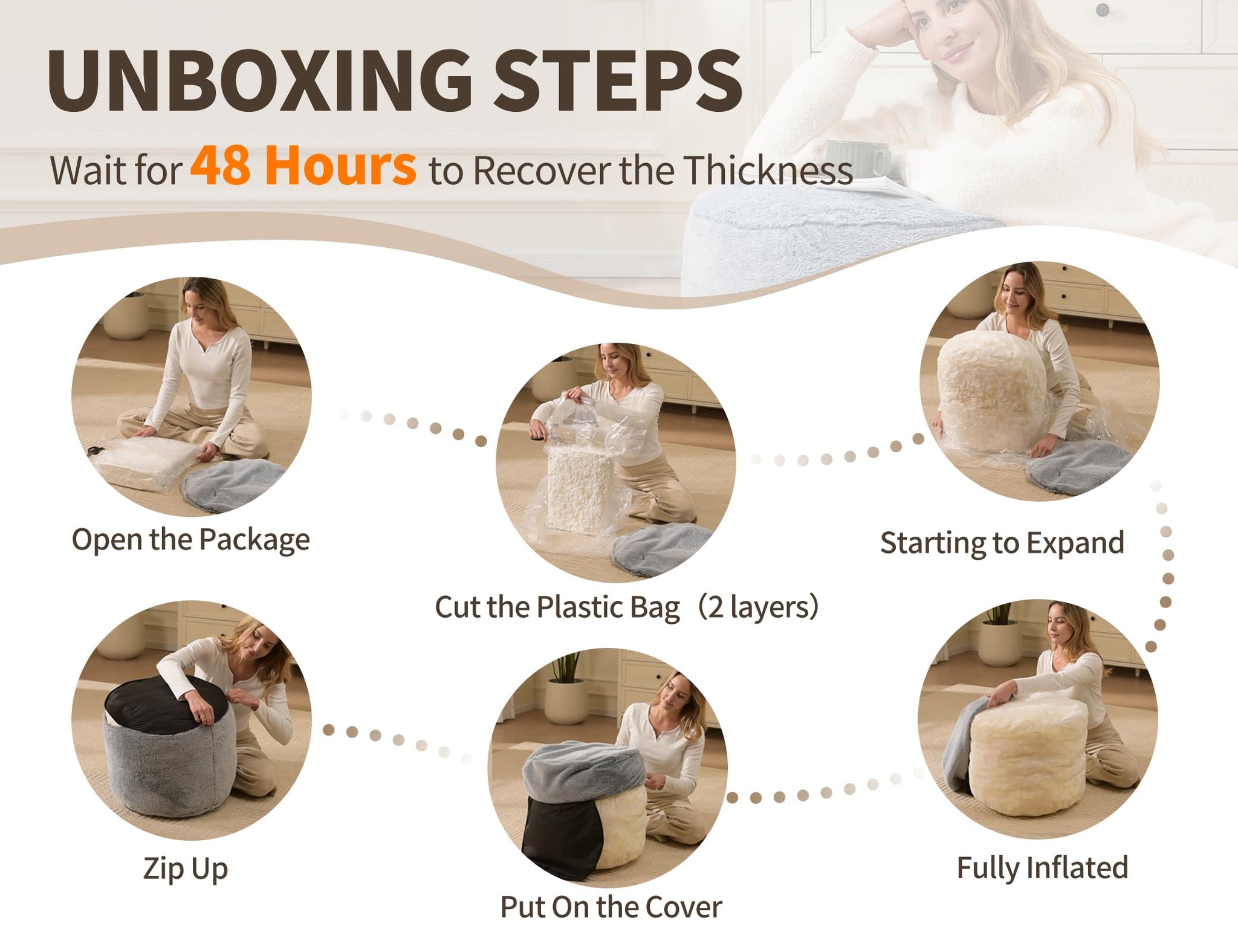 • Design of Round Pouf Ottoman: The package contains a compressed foam and a pouf cover. Please carefully cut through the filling of the footstool ottoman with a knife, applying the round ottoman cover, and allow 48 hours for small foot stool to fully expand. During this period, you need to pat, shake and knead the ottoman for living room's foam filling. The bottom of small foot rest is non-slip, and pouffe ottoman cover of small round ottoman can be cleaned by machine washing or drying.