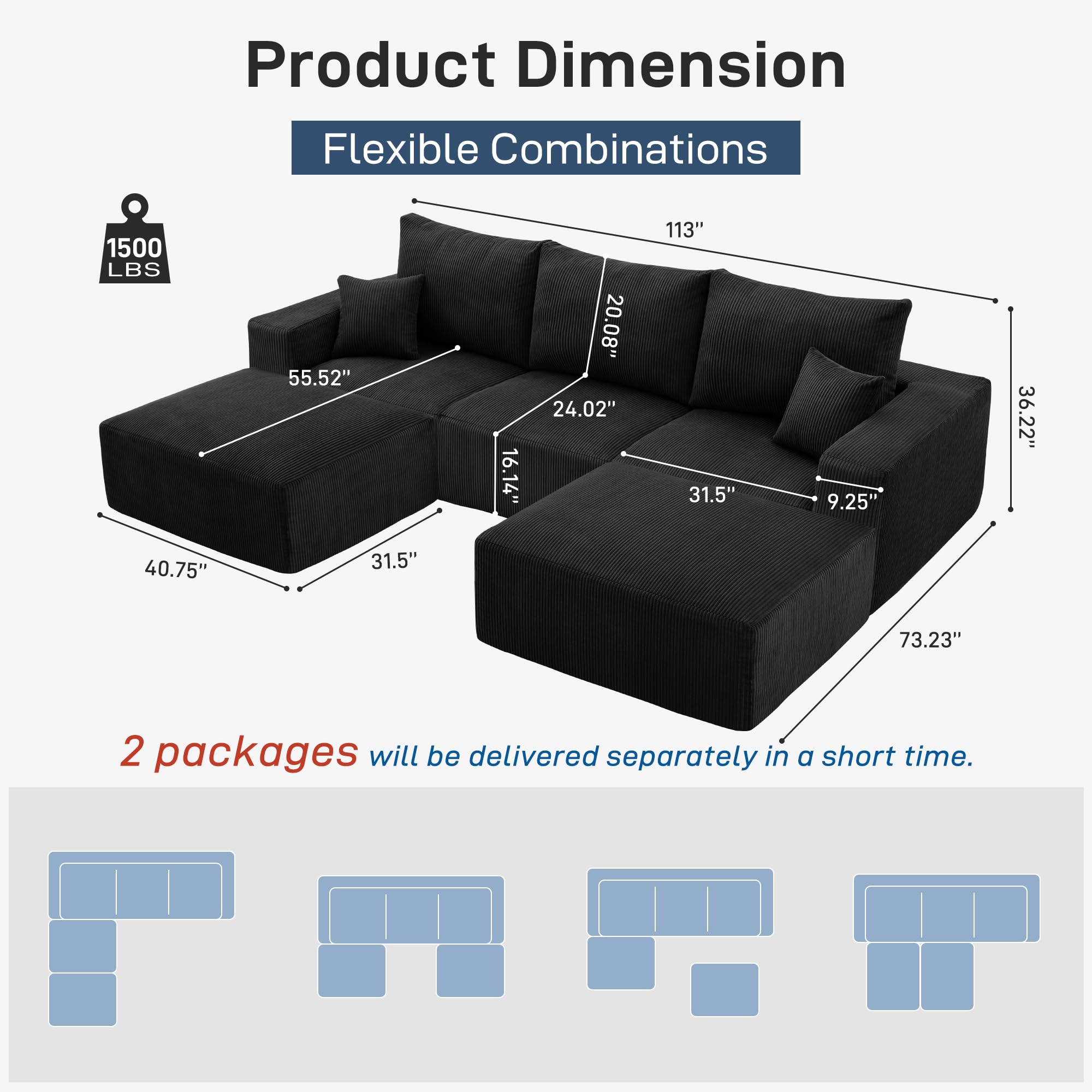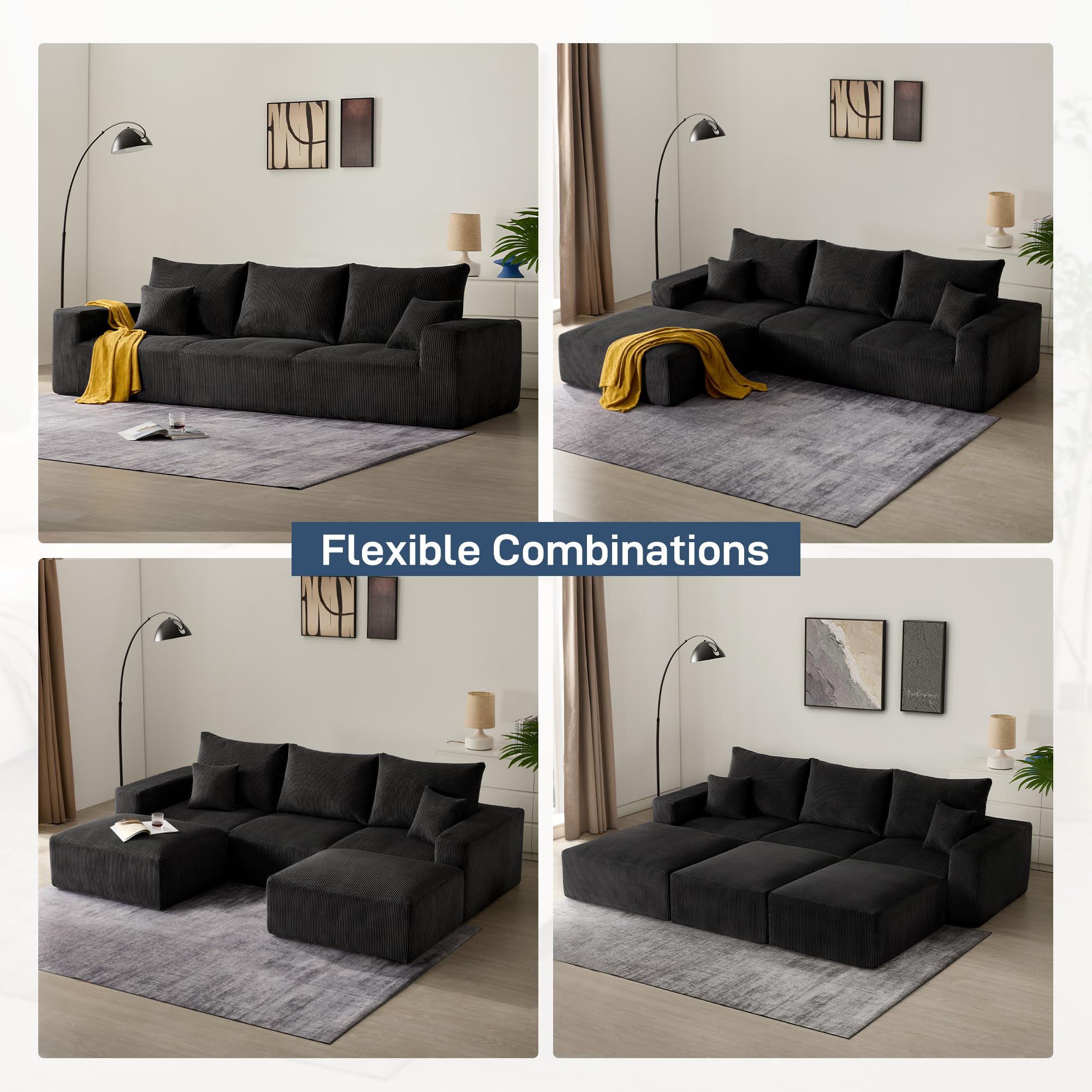 Sectional Cloud Boneless Sofa Couches for Living Room-113'' Beige 3 Seater U-Shaped Modern Lounge Couch-No Assembly Modular Corduroy Convertible Sponge Sleeper Sofas with Chaise for Home House