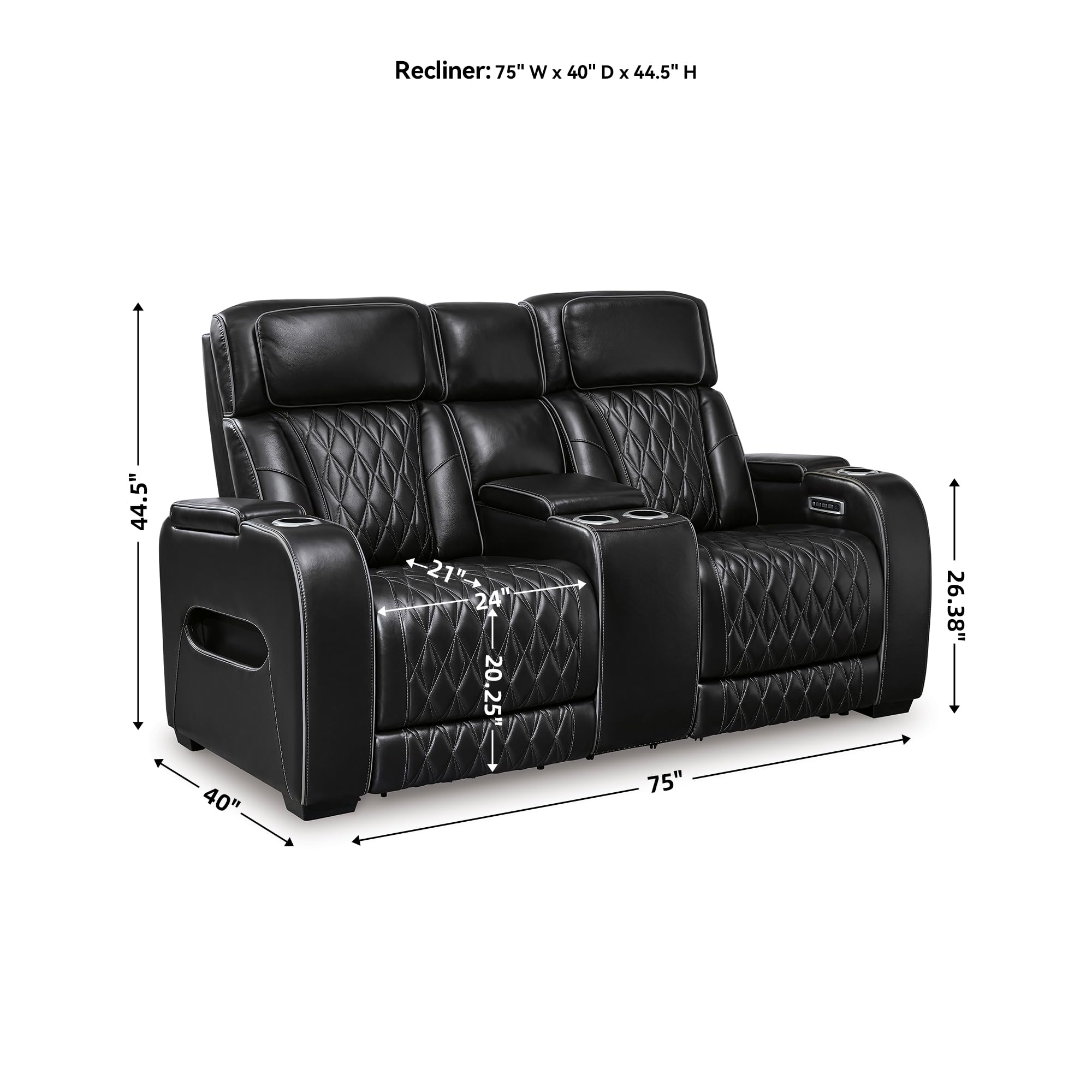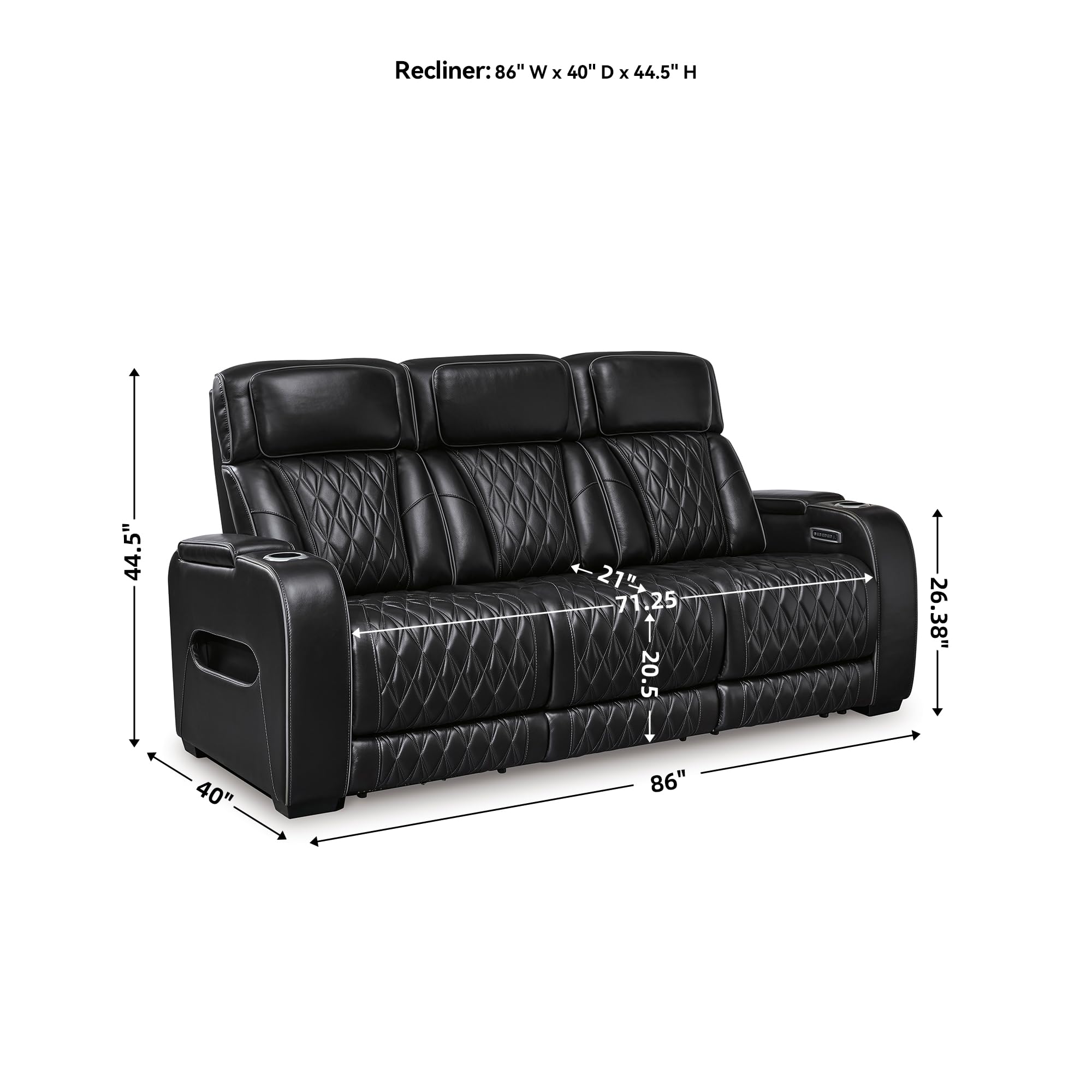 • COMFY SEATING: Measures 86" W x 38.5" D x 44.5" H. Seat depth: 20.5". Seat height: 20.25". Arm height: 26.25". Distance between arms: 71.25". Fully reclined length: 71"