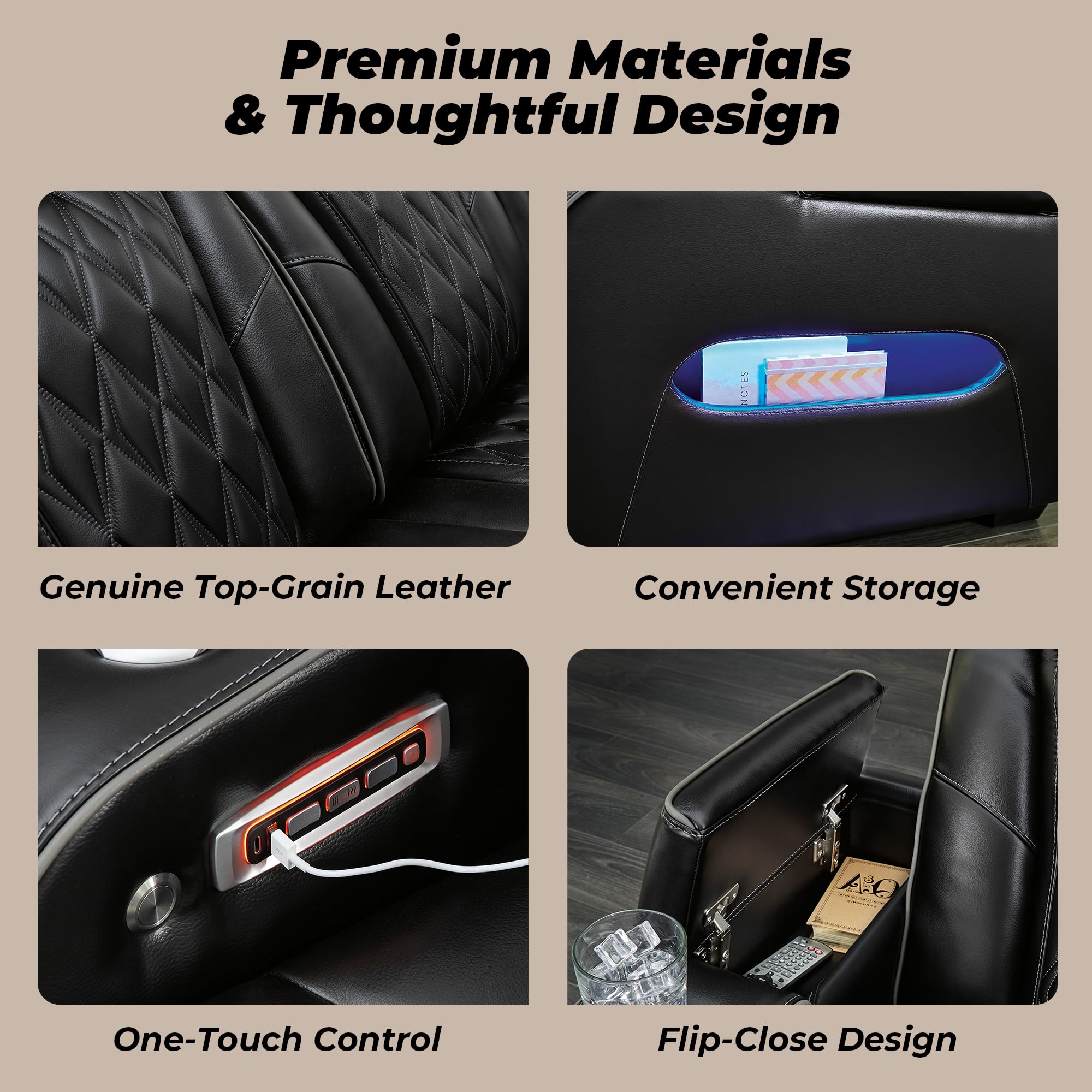 • MODERN FEATURES: Lounge in comfort with the air massage system, heated seats and adjustable headrests. This sofa Includes a drop-down table with reading lights, USB/wireless charging and 2 cup holders