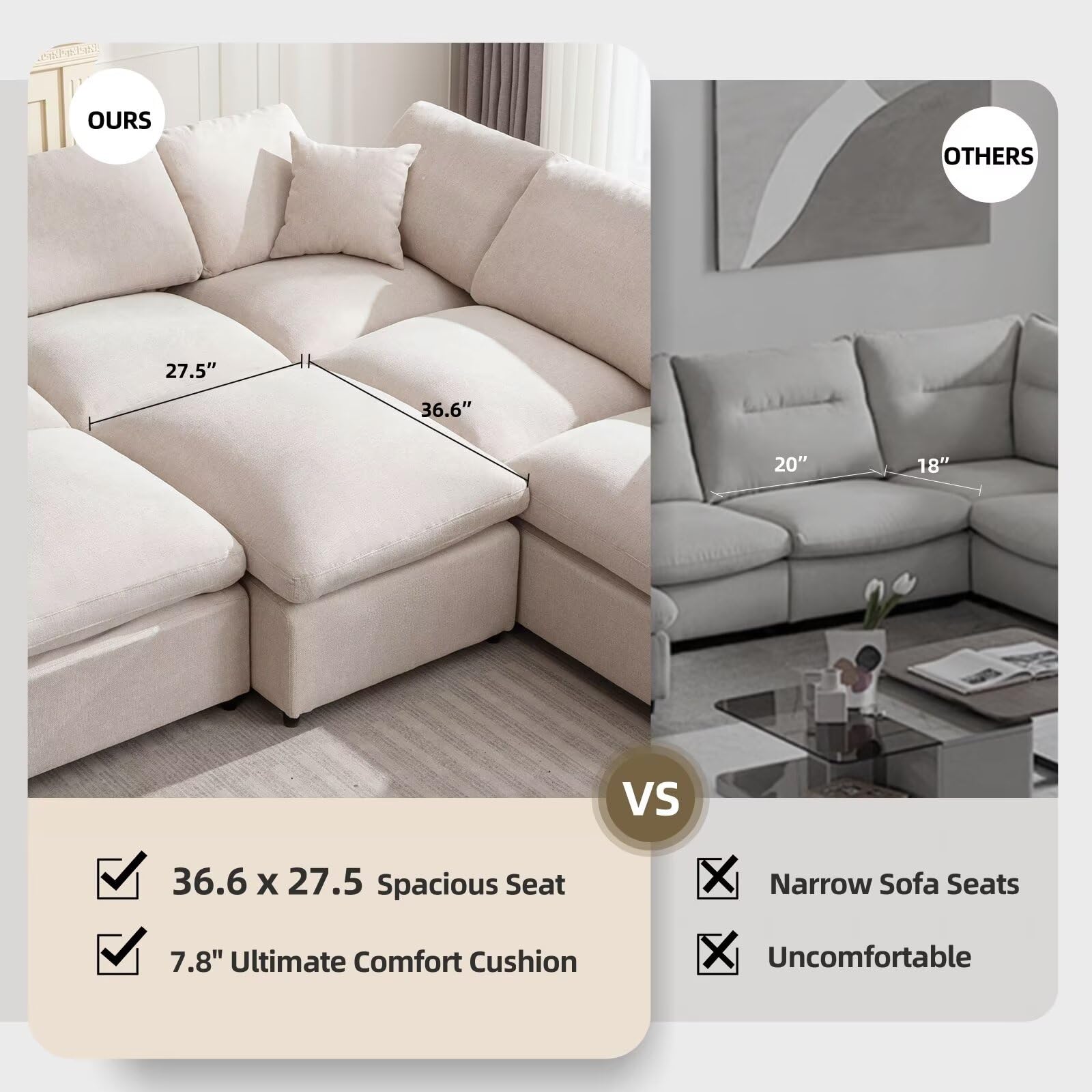 Siiejia Modular Sectional Sofa Modern Oversized Cloud Couch with Movable Ottoman 7 Seater L-Shaped Sofas Comfy Couches for Living Room Spacious Space Office Lounge, Beige