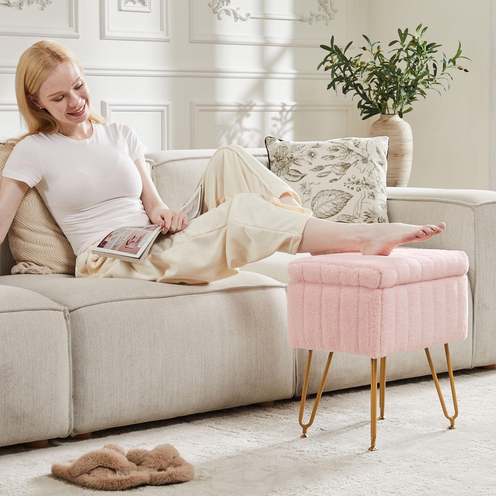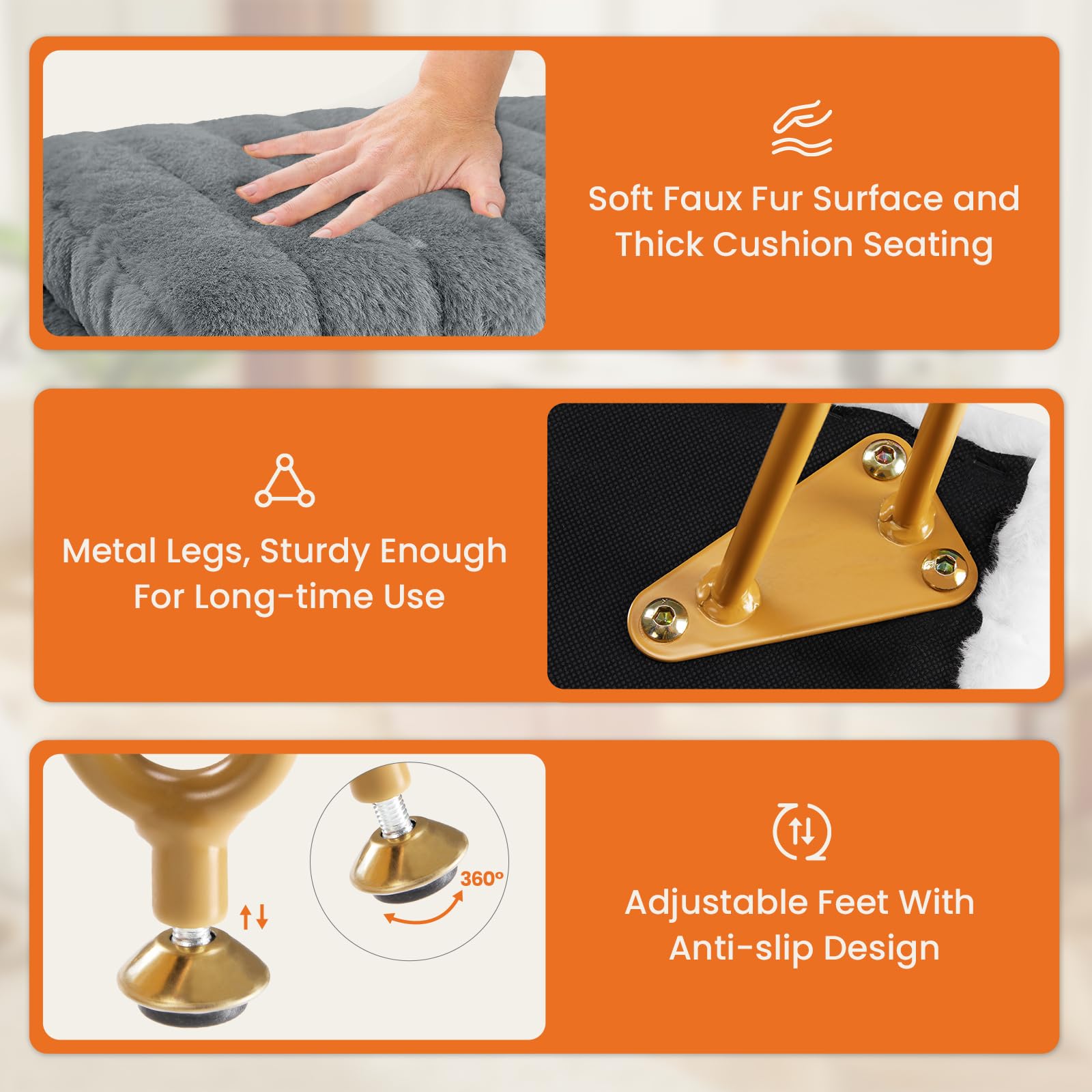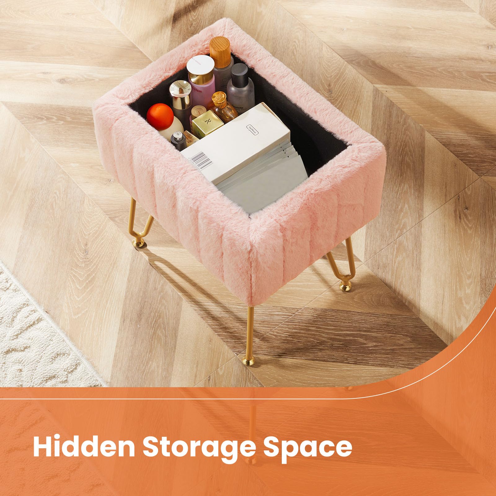 Sweetcrispy Vanity Stool Chair with Storage, Ottoman Faux Fur Soft Padded Makeup Footstools Seat with 4 Metal Legs Anti-Slip Adjustable Feet Modern Cute Small Footrest for Home Entryway Bedroom White