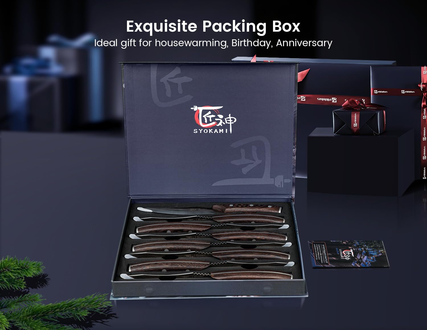 SYOKAMI steak knives are forged to HRC56+ from high quality and safe material Japanese high carbon stainless steel, hand-sharpened to a 15-degree blade angle on each side, offering excellent and durable sharpness. Non-serrated straight-edge blade allows a smooth slice on steaks and will not tear the meat fibers to lock the original flavor and nutrition of the steak