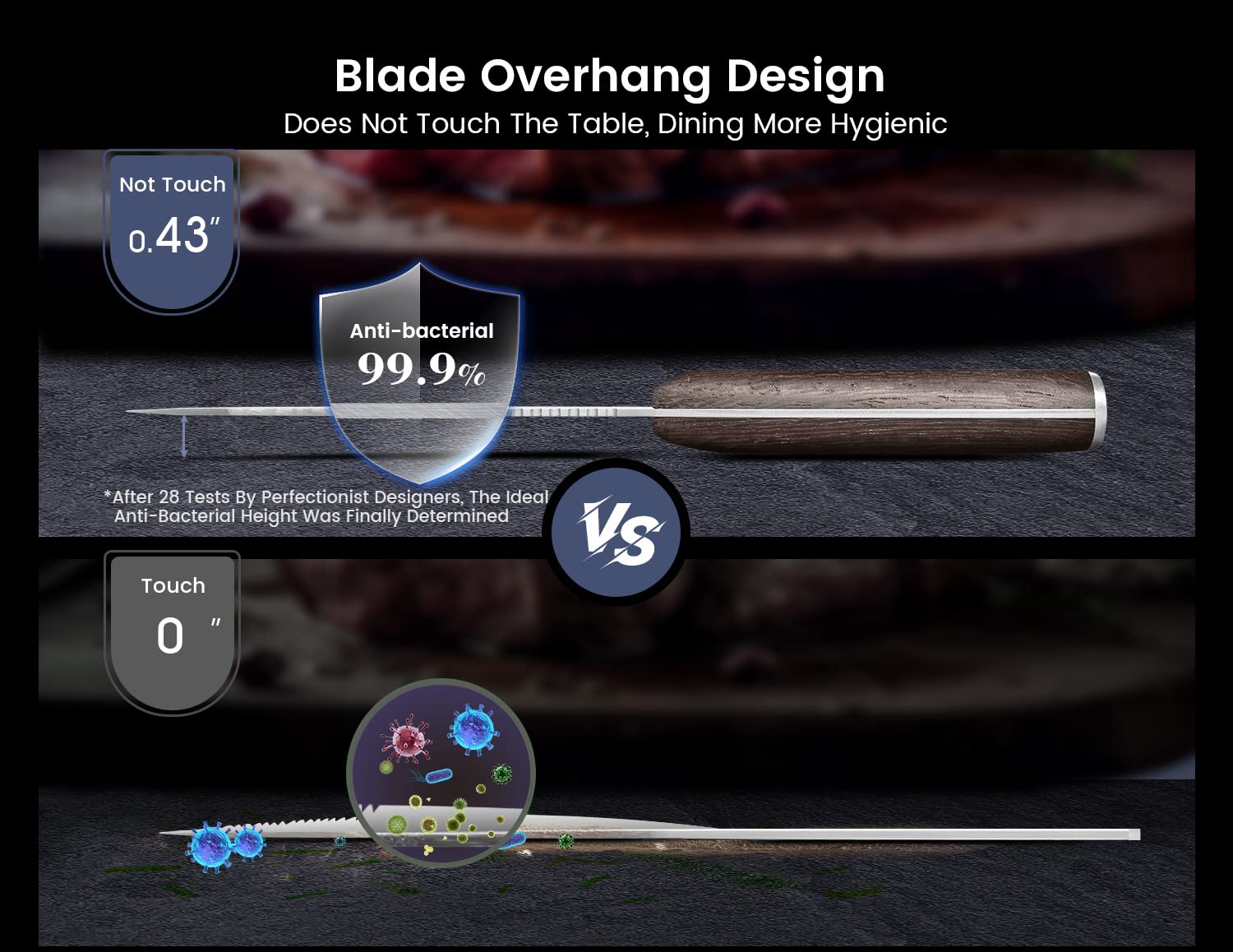 Considering the ordinary steak knife in contact with the table during the meal caused by the staining health hazards and increased cleaning burden, we overturned the traditional steak knife design after 28 repeated tests and finally determined the 0.43-inch blade suspension height to ensure the health of your and your family