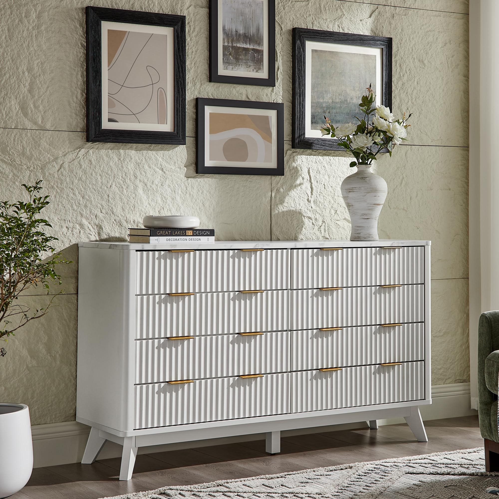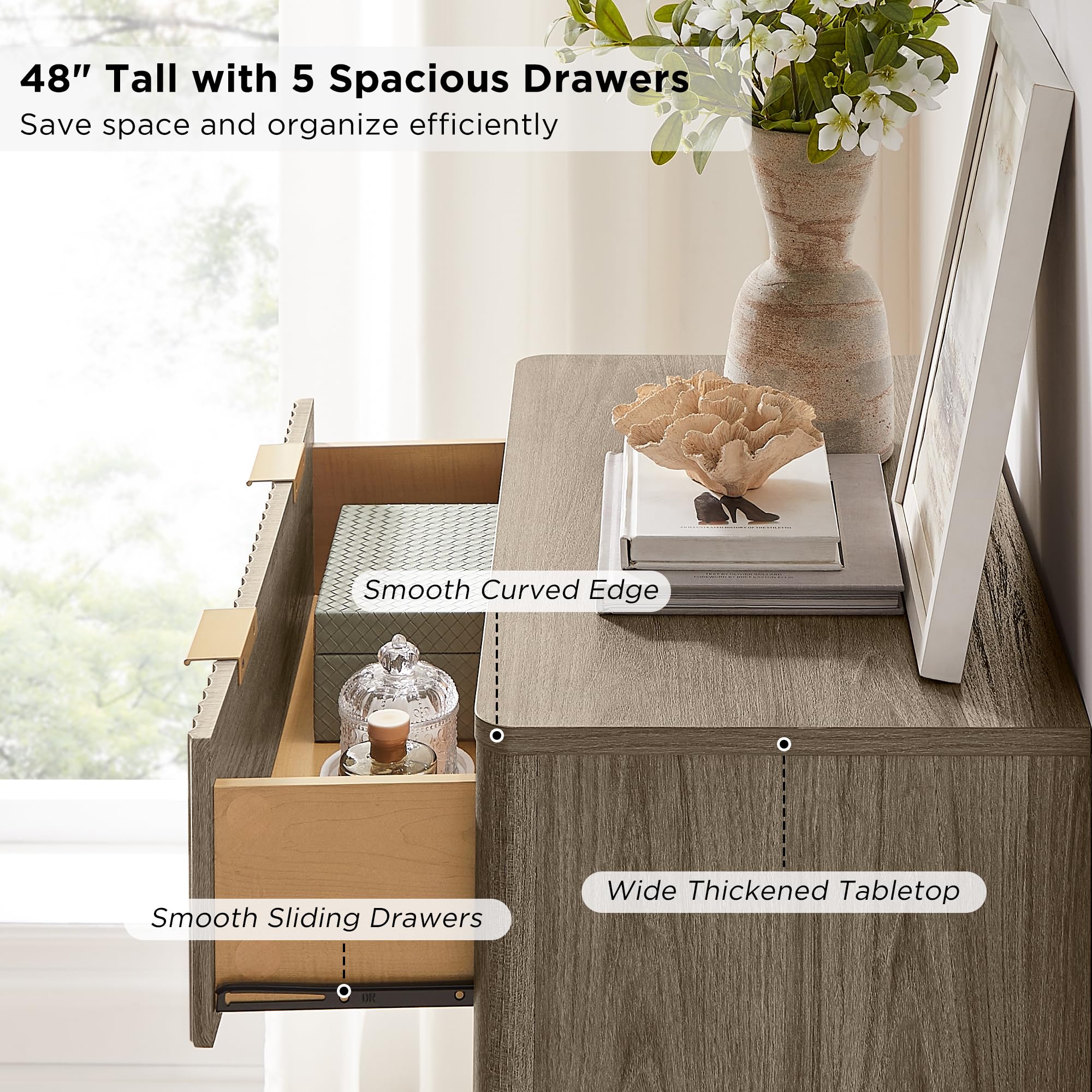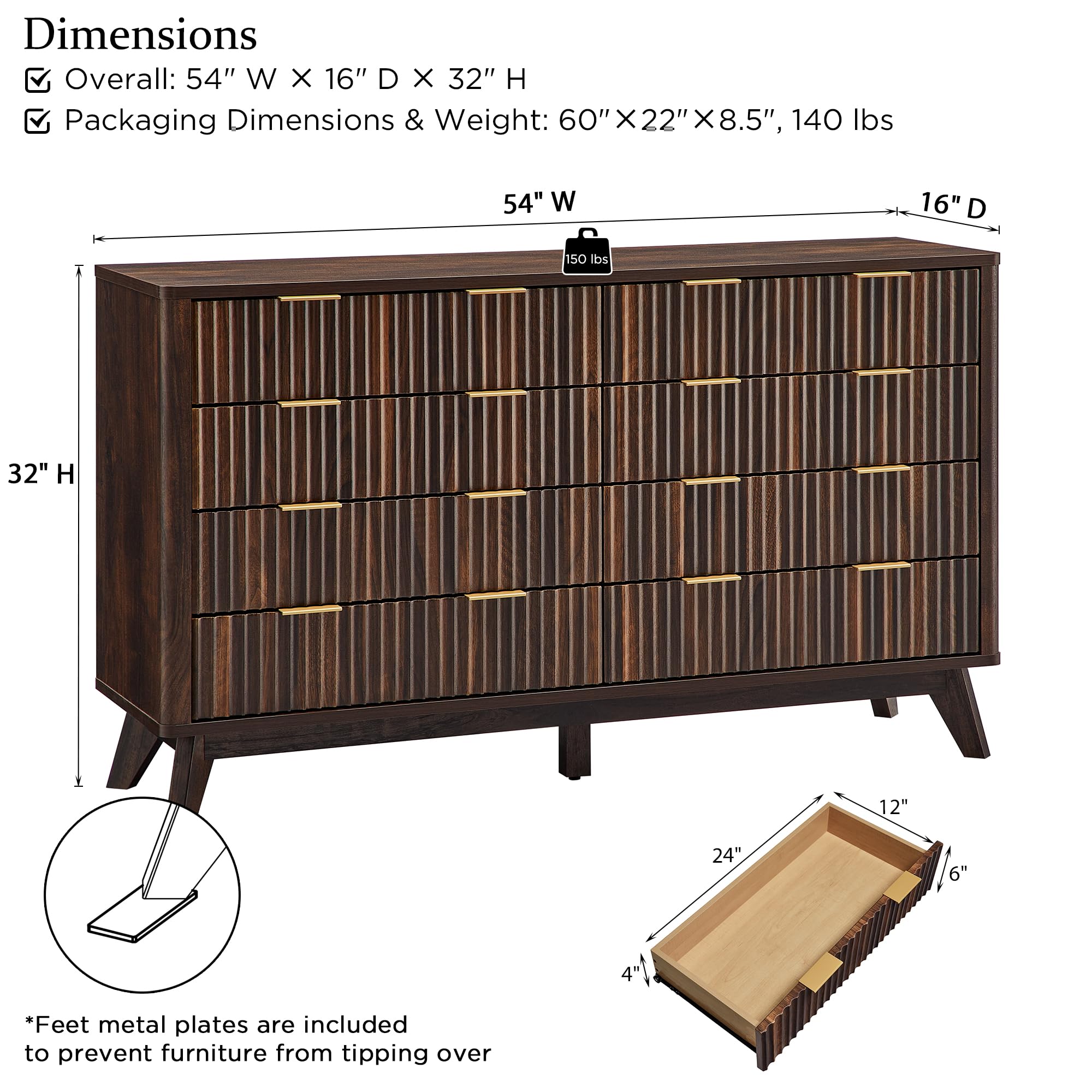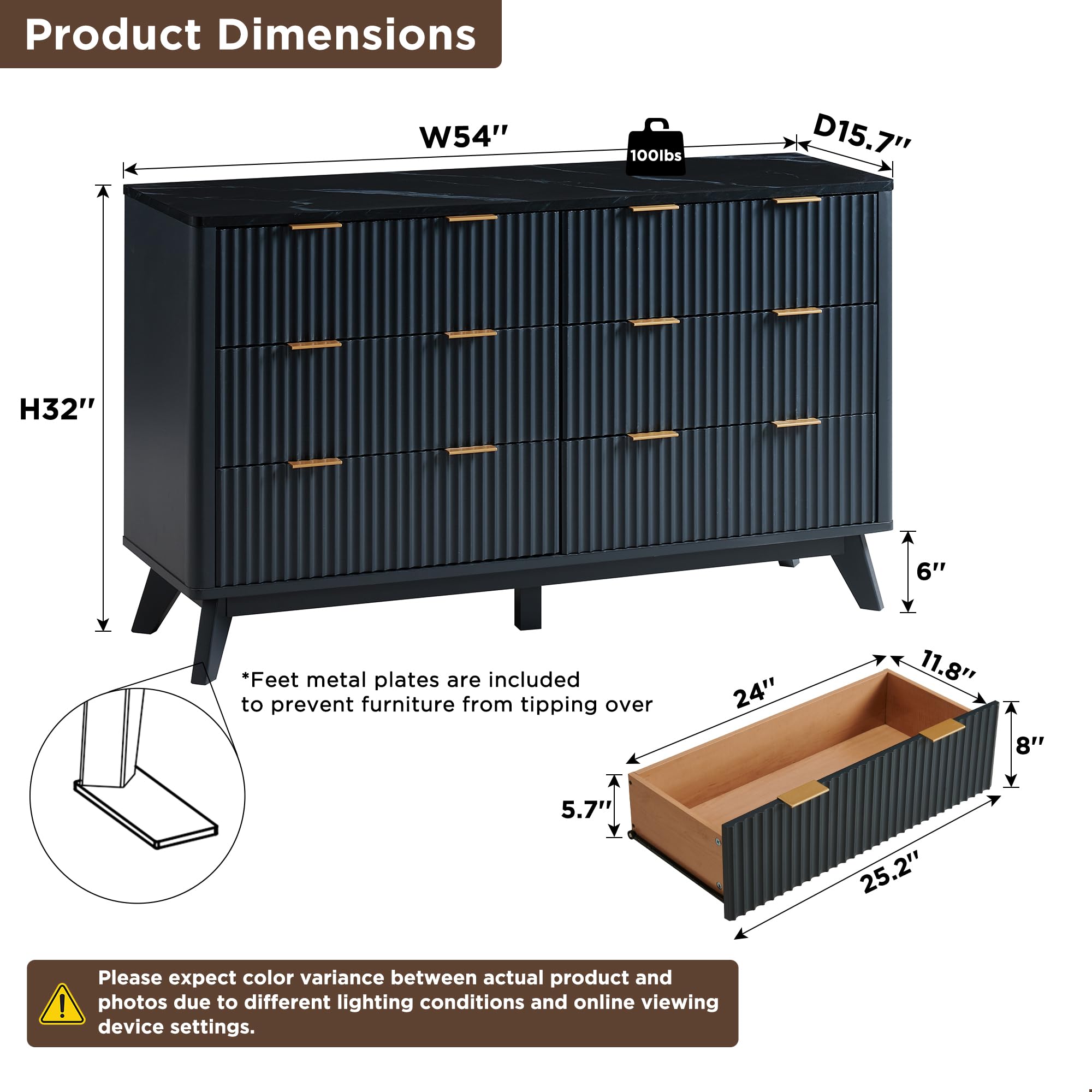 • Versatile, Stylish Dresser: Measuring 54"W × 15.75"D × 32"H, this dresser offers an array of possibilities for your home organization. Its spacious tabletop serves as a stylish canvas to beautifully showcase framed photos, artistic accents, and more. It features 7 smooth-glide drawers, offering efficient storage solutions. Keep your space neat and tidy by conveniently stowing clothing, bedding, cosmetics, jewelry, and more. Perfect for bedroom, living room, hallway, entryway.