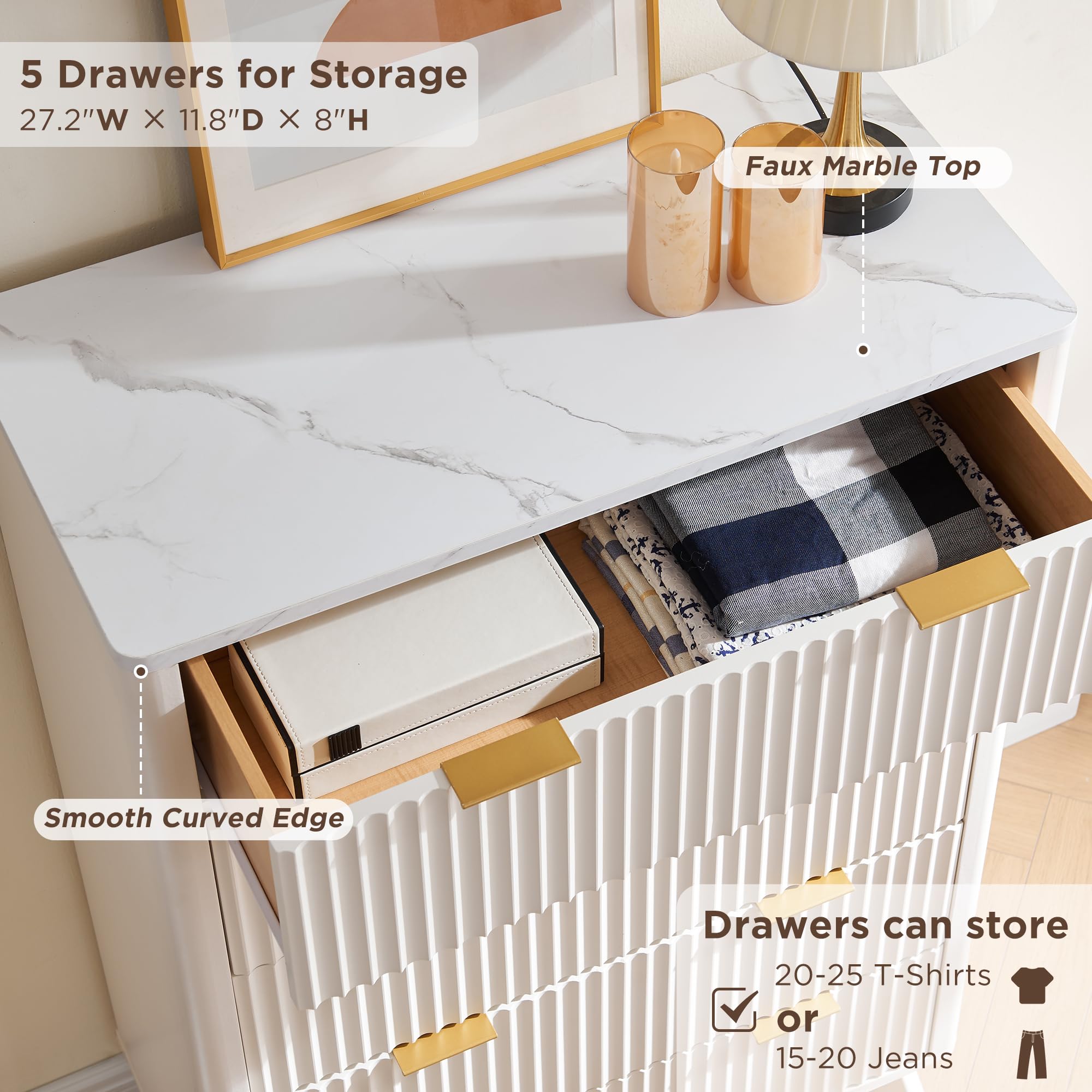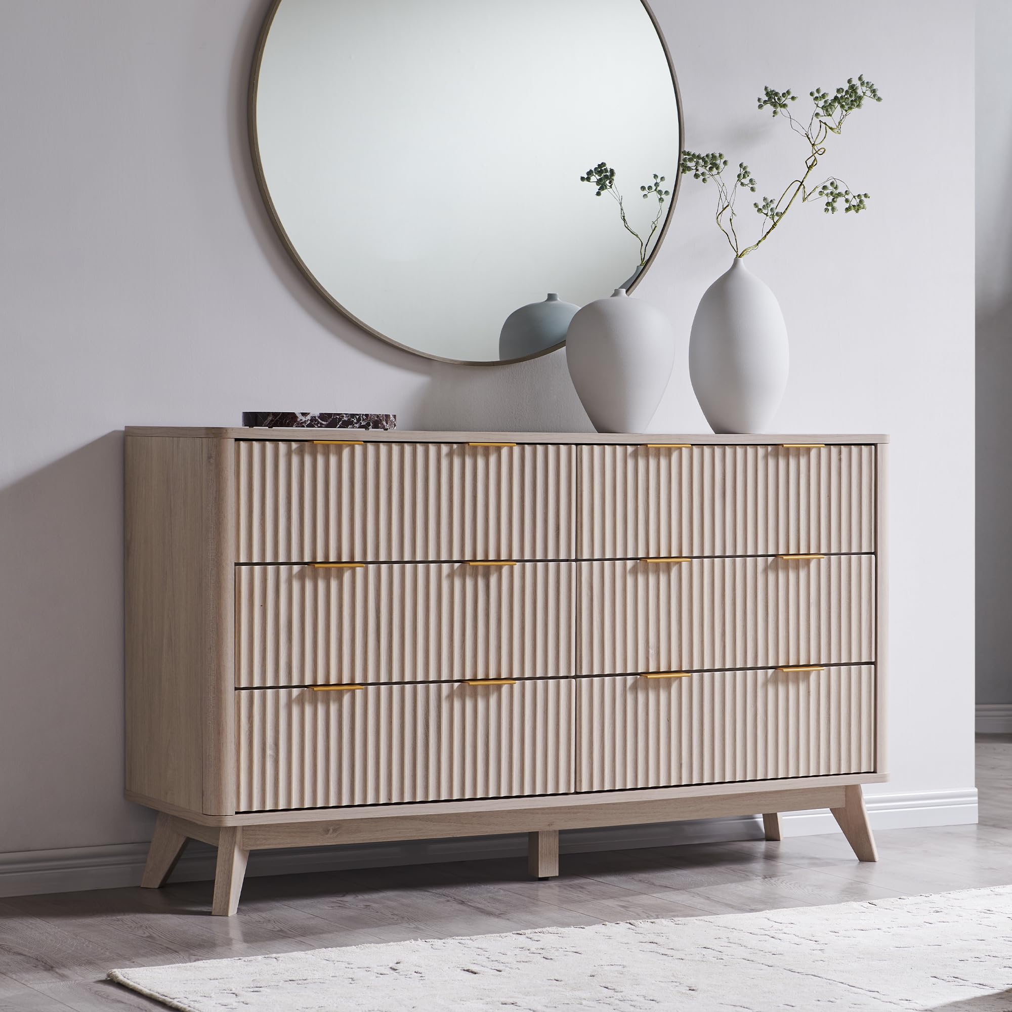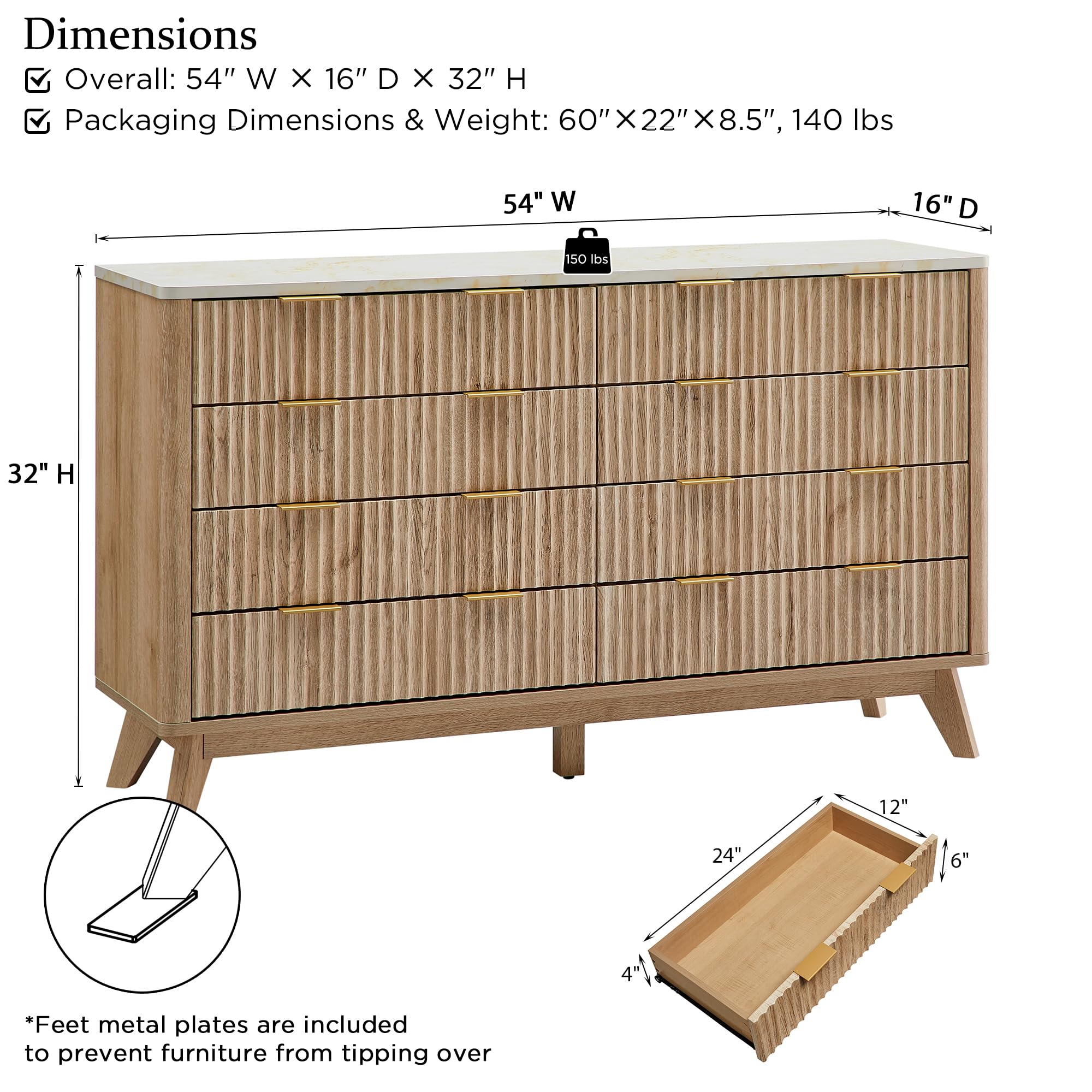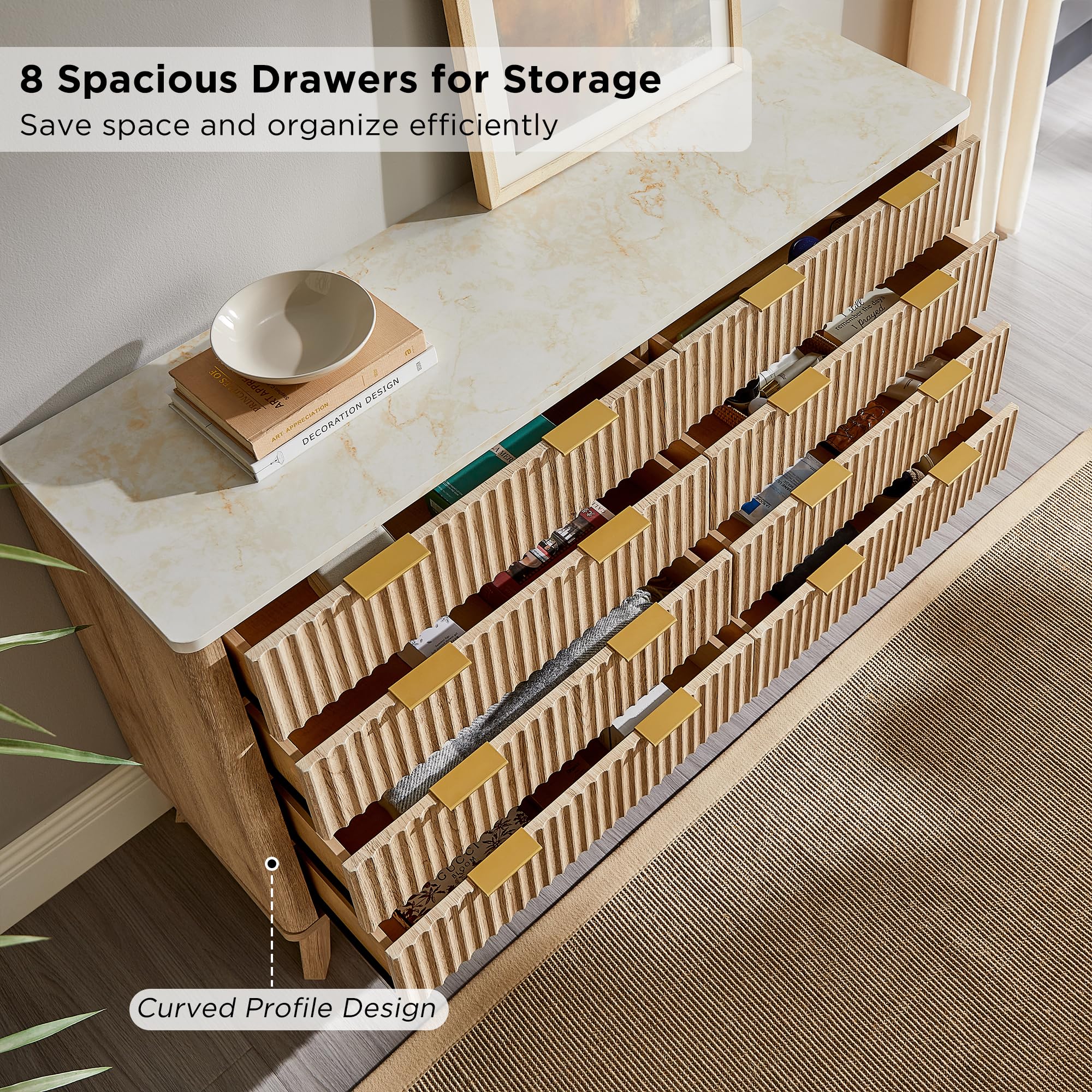 T4TREAM Fluted 7 Drawers Dresser, 54" Wide Modern Chest of Drawers with Faux Marble Top, Curved Profile Design, Dresser TV Stand, Wood Drawer Organizer for Bedroom, Living Room, Hallway, Natural Oak