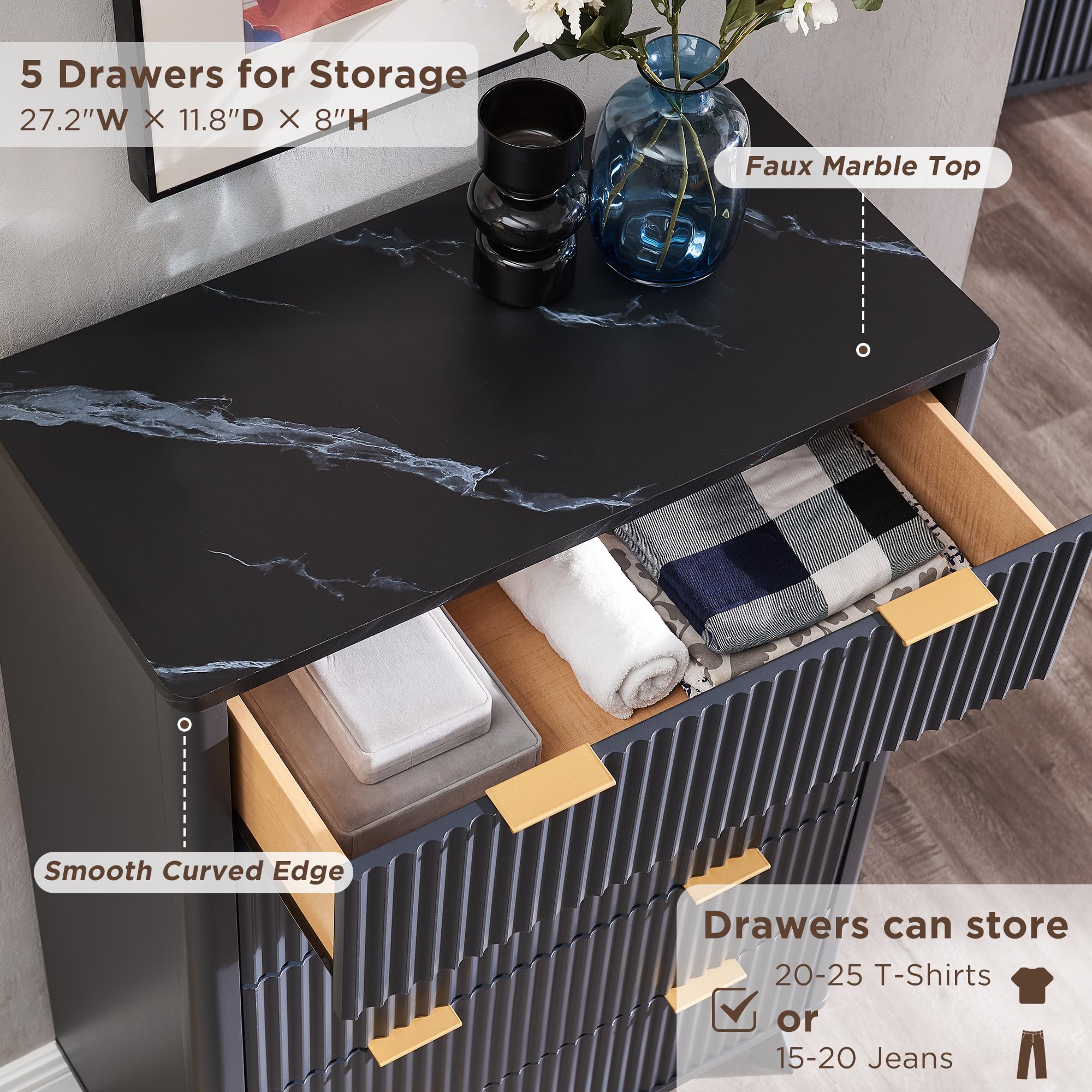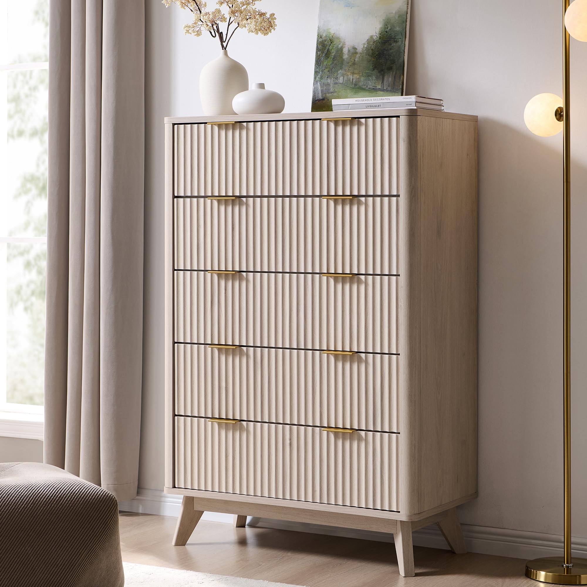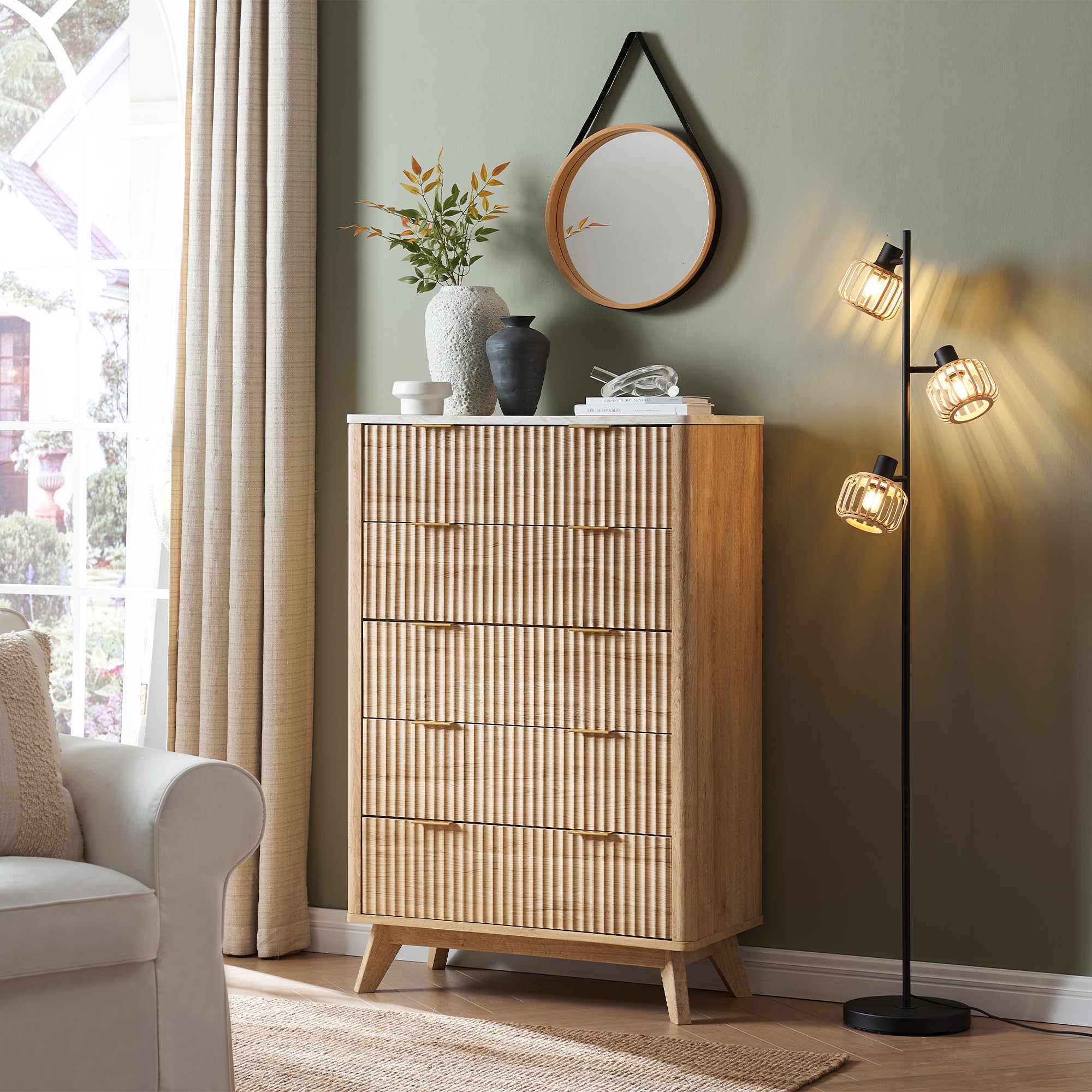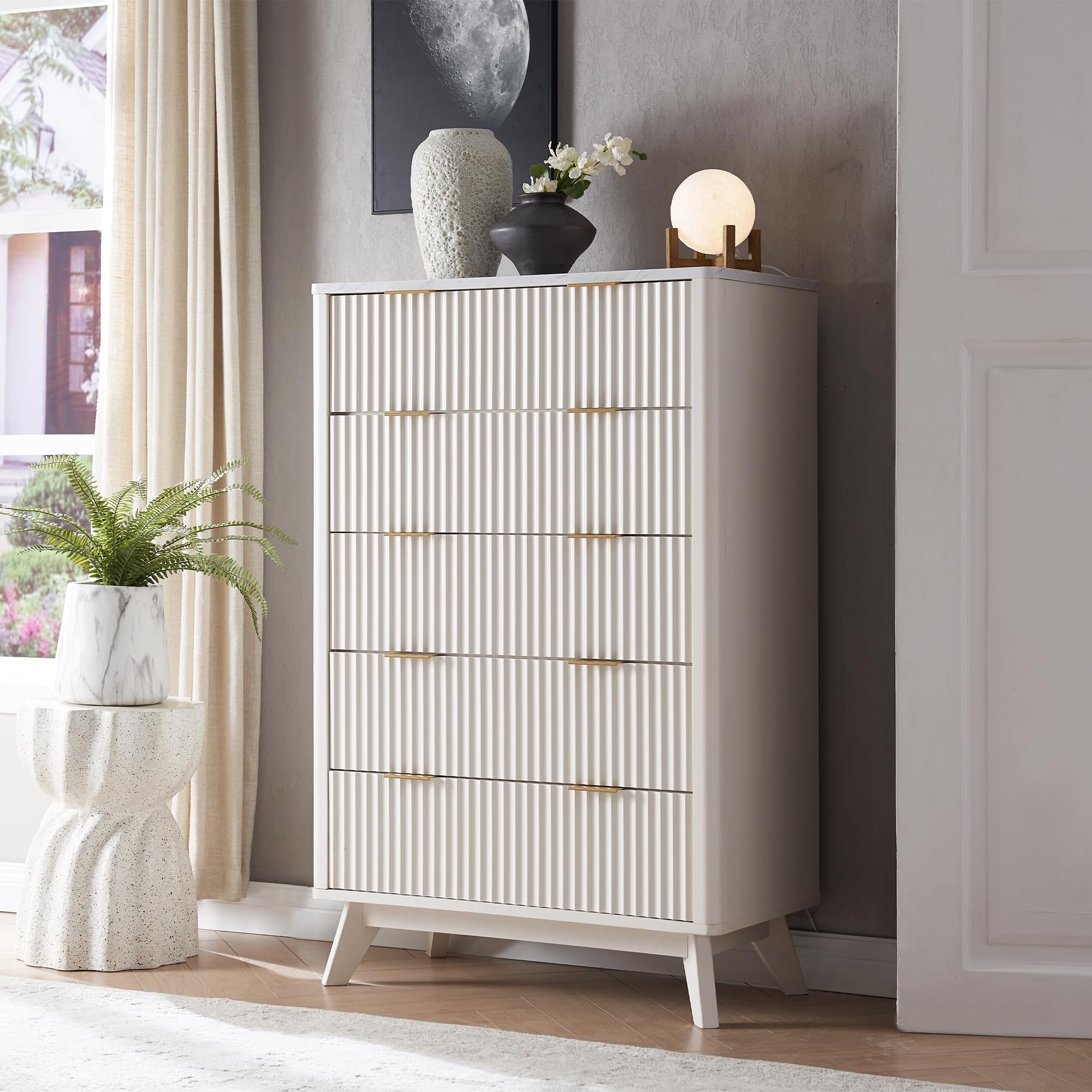• Timeless Elegance Meets Modern Chic: The distinctive wave-like fluted panel enhances the texture and spatial presence of this exceptional piece. The off-white faux marble top, adorned with earth-toned veins, complements the natural oak finish, while the smooth curved edge exudes an aura of elegance and provides a safe environment for little ones. The wide metal handle and splayed legs add to its contemporary vibe, creating a personalized and distinctive aesthetic.