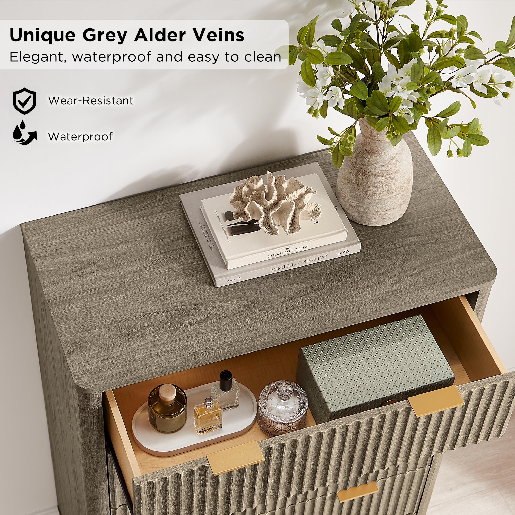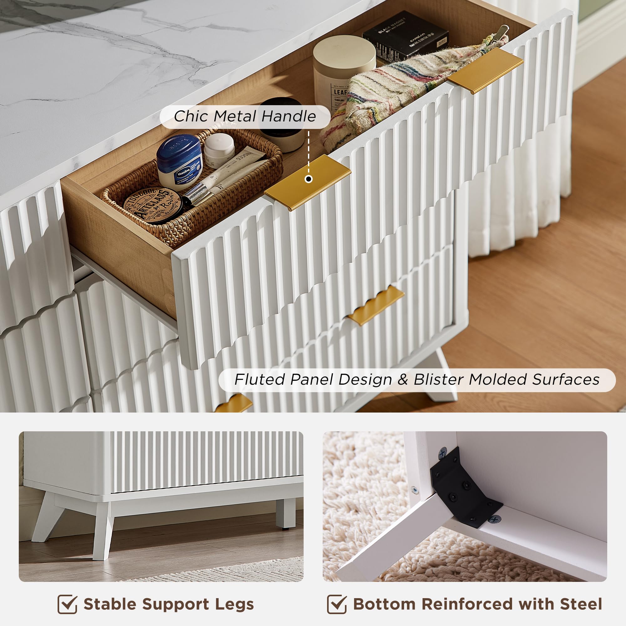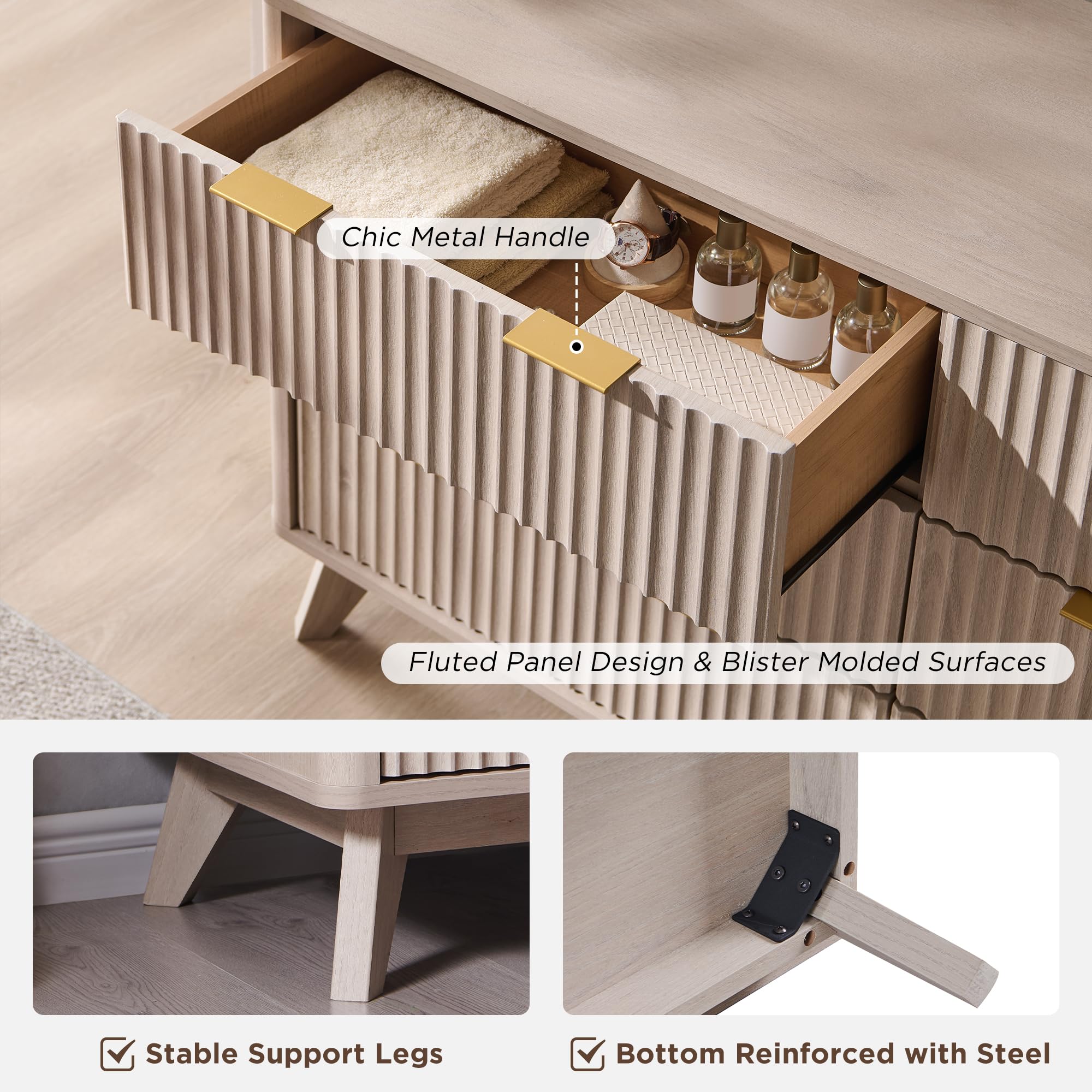 • Stable, Durable and Textured: Constructed from optimal MDF, P2 engineered wood and coated metal pull. Specially, the fluted panel uses blister molding tech, which not only has exquisite texture, but also ensures long-lasting durability, water resistance, and easy maintenance. Notably, the cabinet's stability is reinforced by the innovative inclusion of a steel support at the base, guaranteeing a reliable and sturdy piece of furniture.