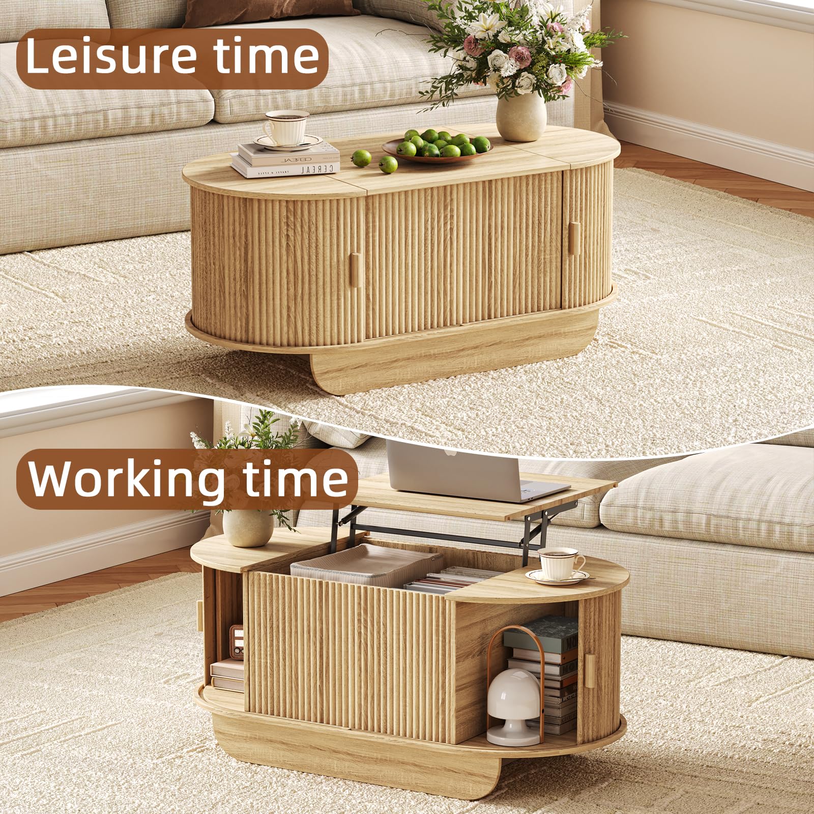 UKAOCAI 86.61'' Tambour TV Stand for 55-85 Inch, Modern Entertainment Center with Large Storage Cabinet & Open Shelves, TV Console with Sliding Doors for Living Room, Bedroom, Natural