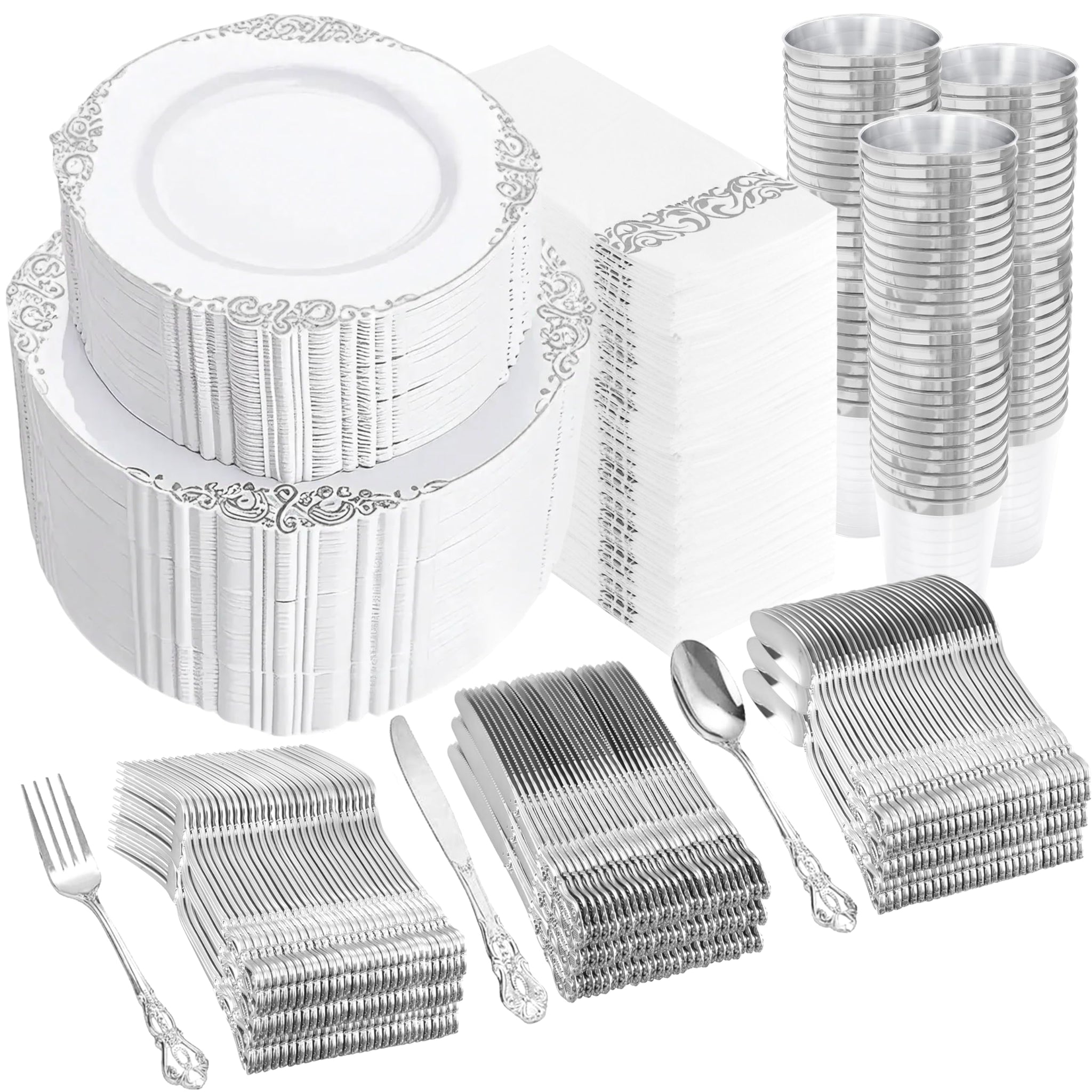 YOUBET 700PCS Silver Plastic Plates - White and Silver Disposable Plates - Silvery Plastic Dinnerware Set - Include 200 Plates, 300 Heavy Duty Silverware, 100 Cups and 100 Napkins for Wedding & Party